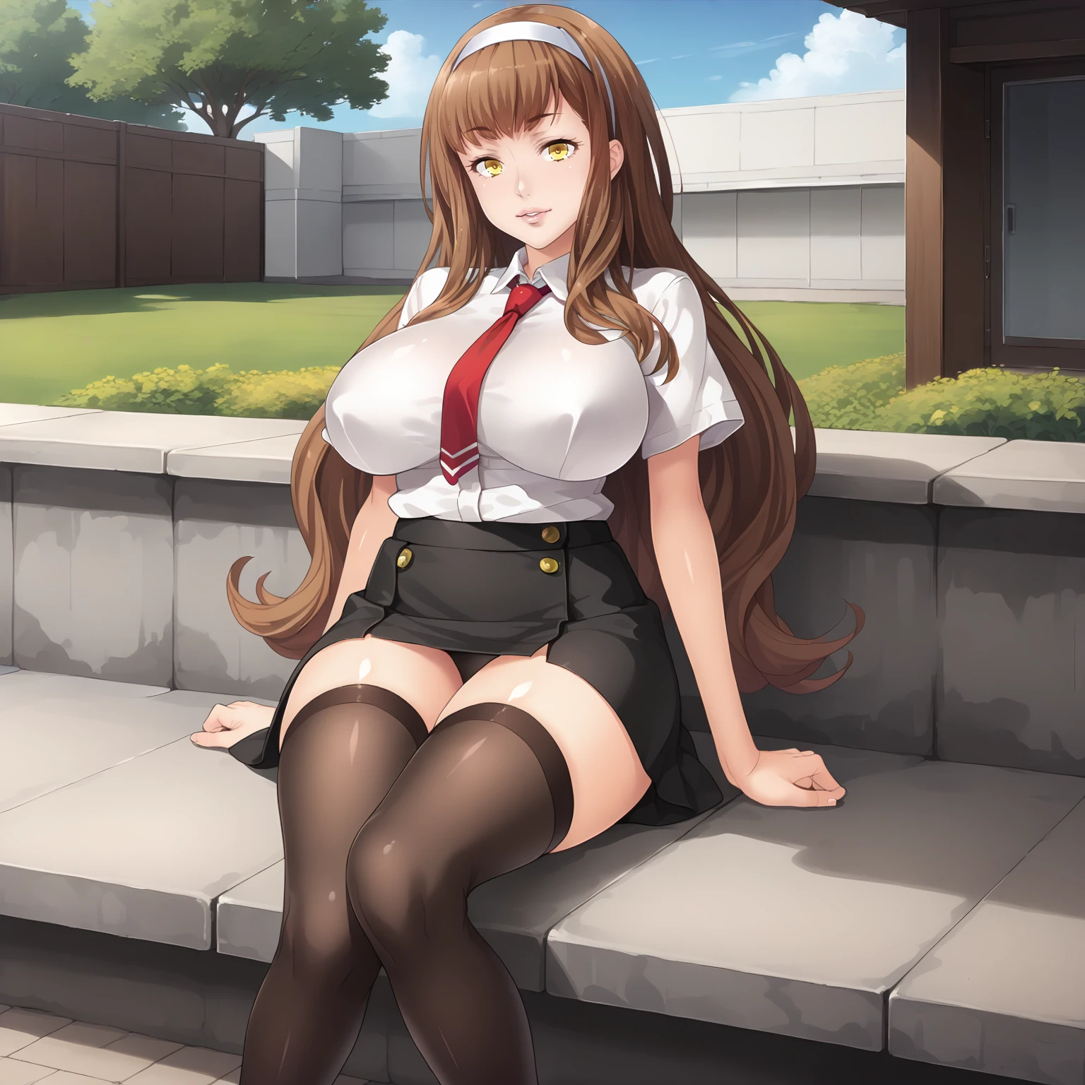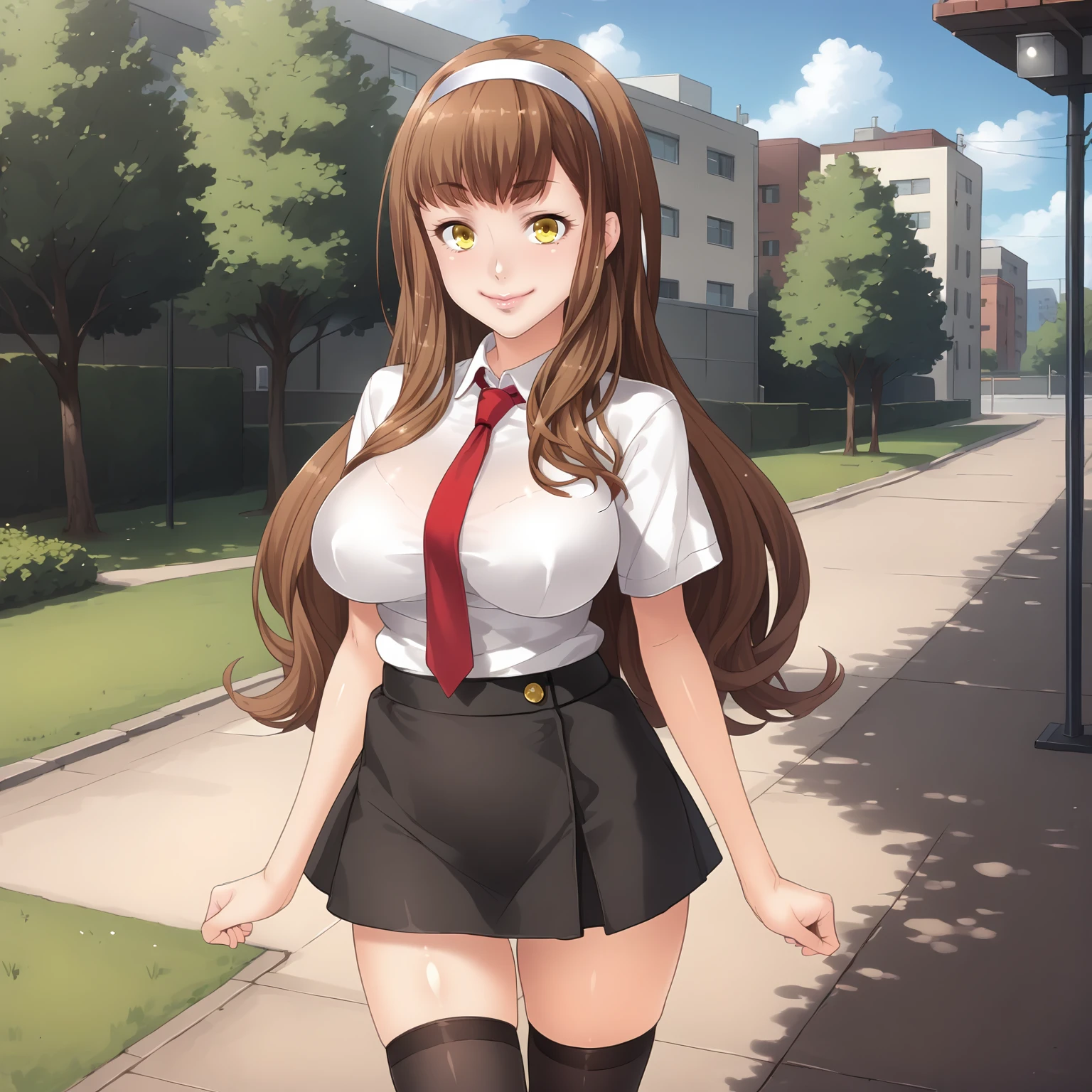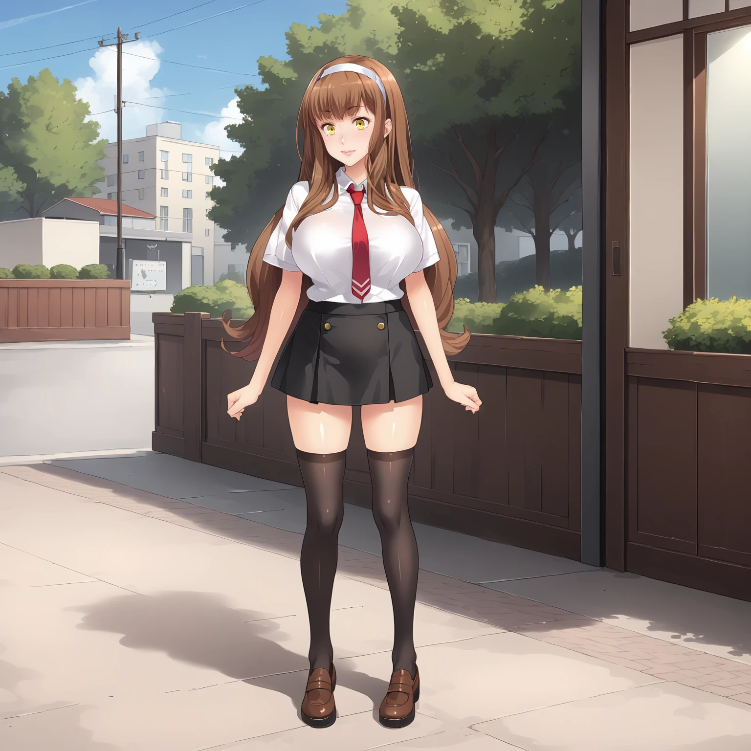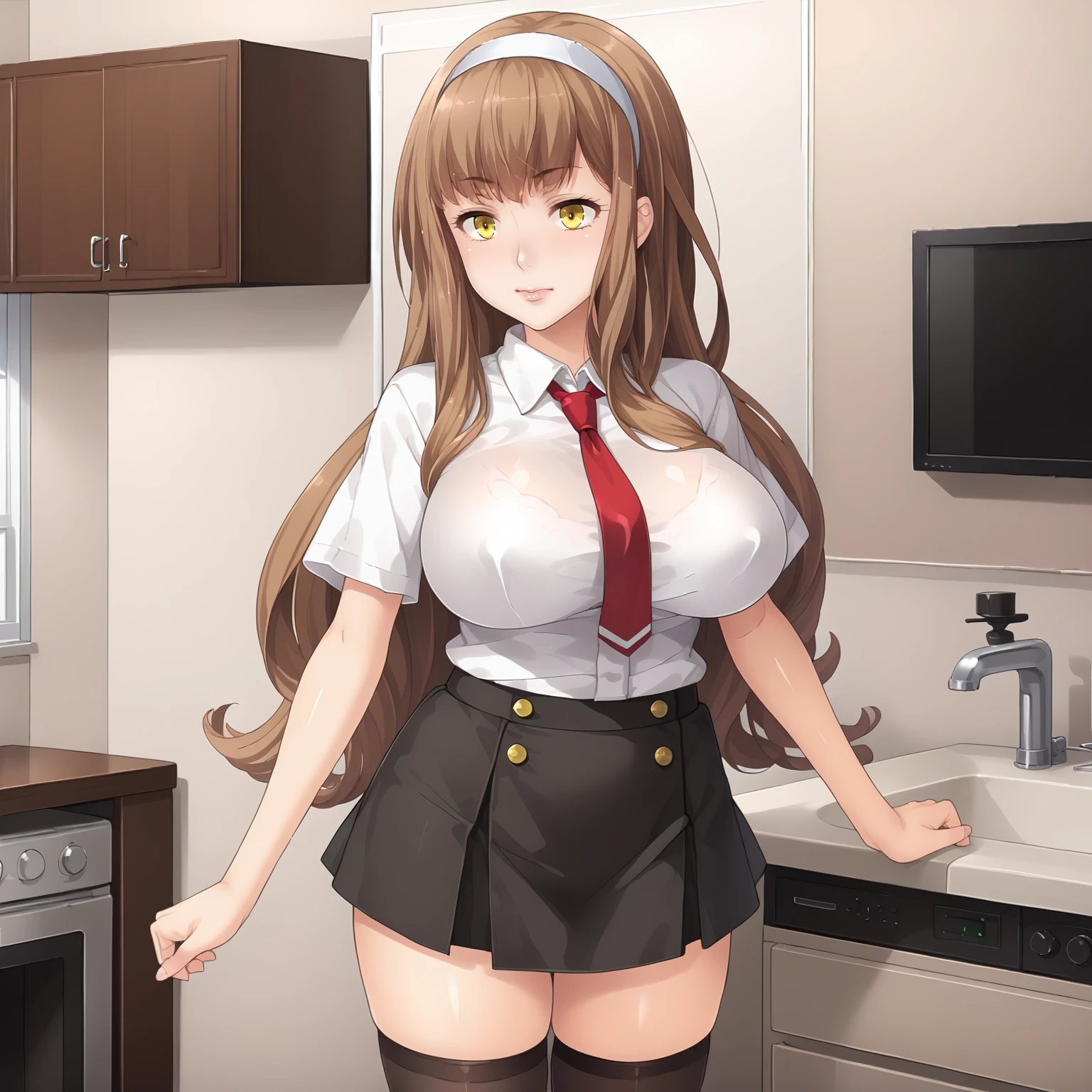 hair band, white shirt,red tie,short_sleeves, black skirt, black_thighhighs,