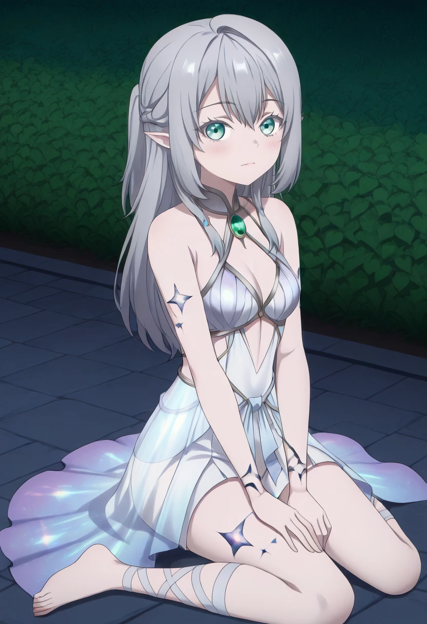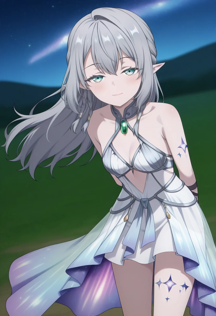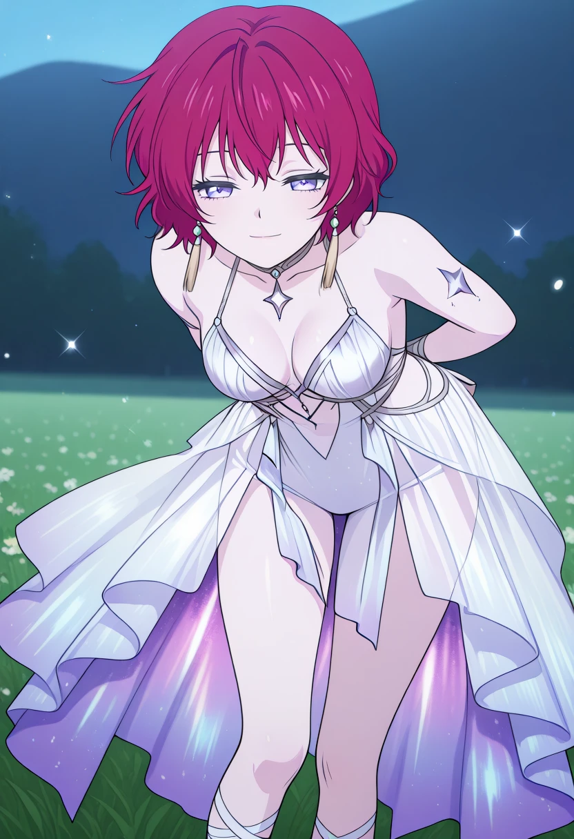 cha13v1,fantasy,ethereal,white bodysuit,sheer skirt,galaxy print,gradient fabric,bare legs,deep cleavage,bare feet,backless,exposed back,delicate straps,leg wraps,star motif,anime screencap
