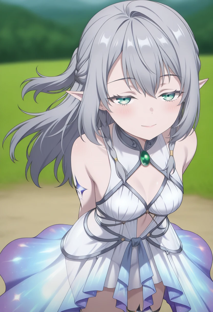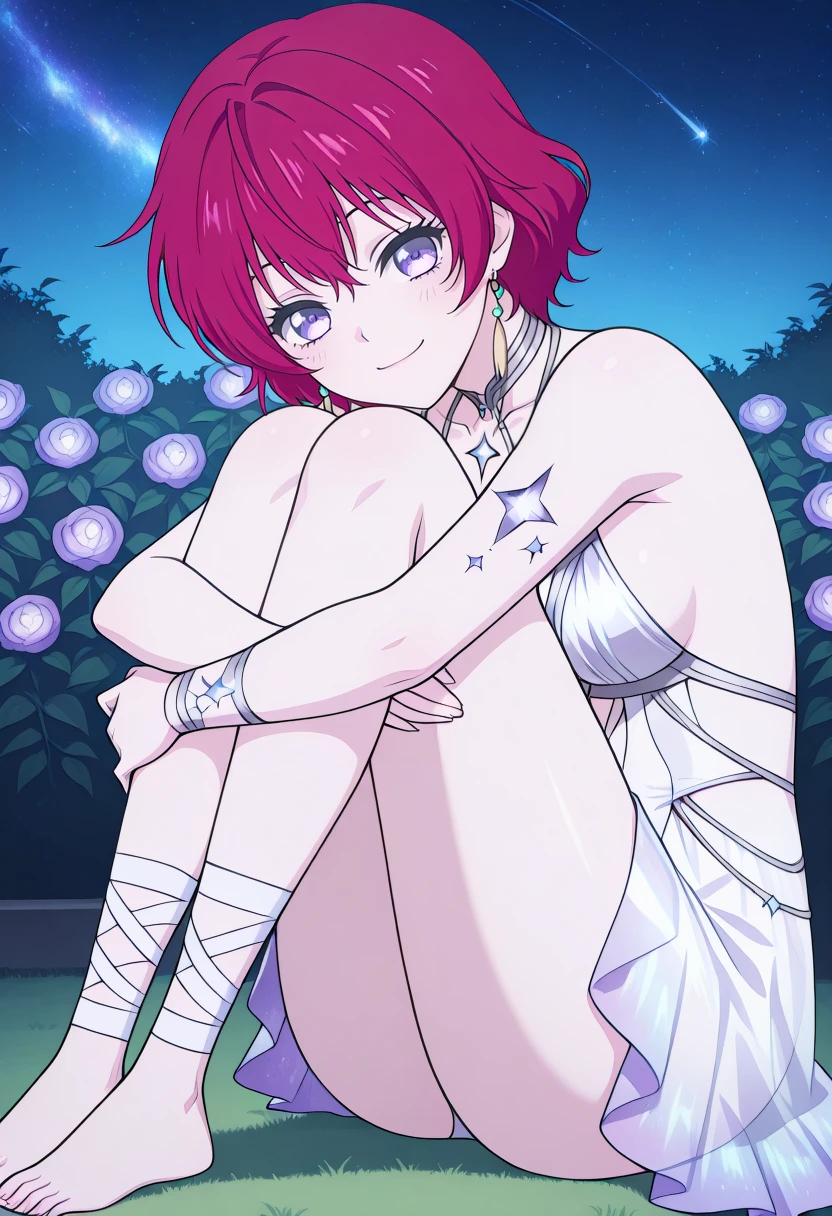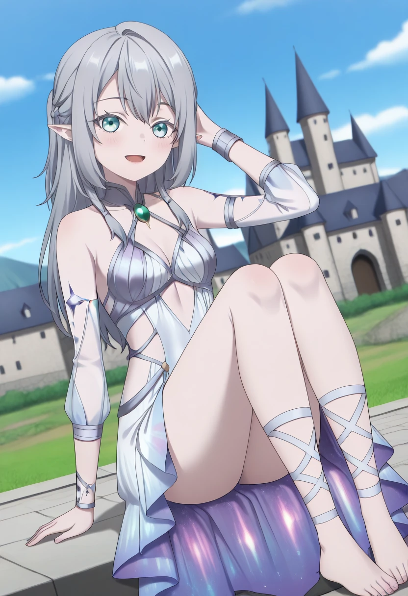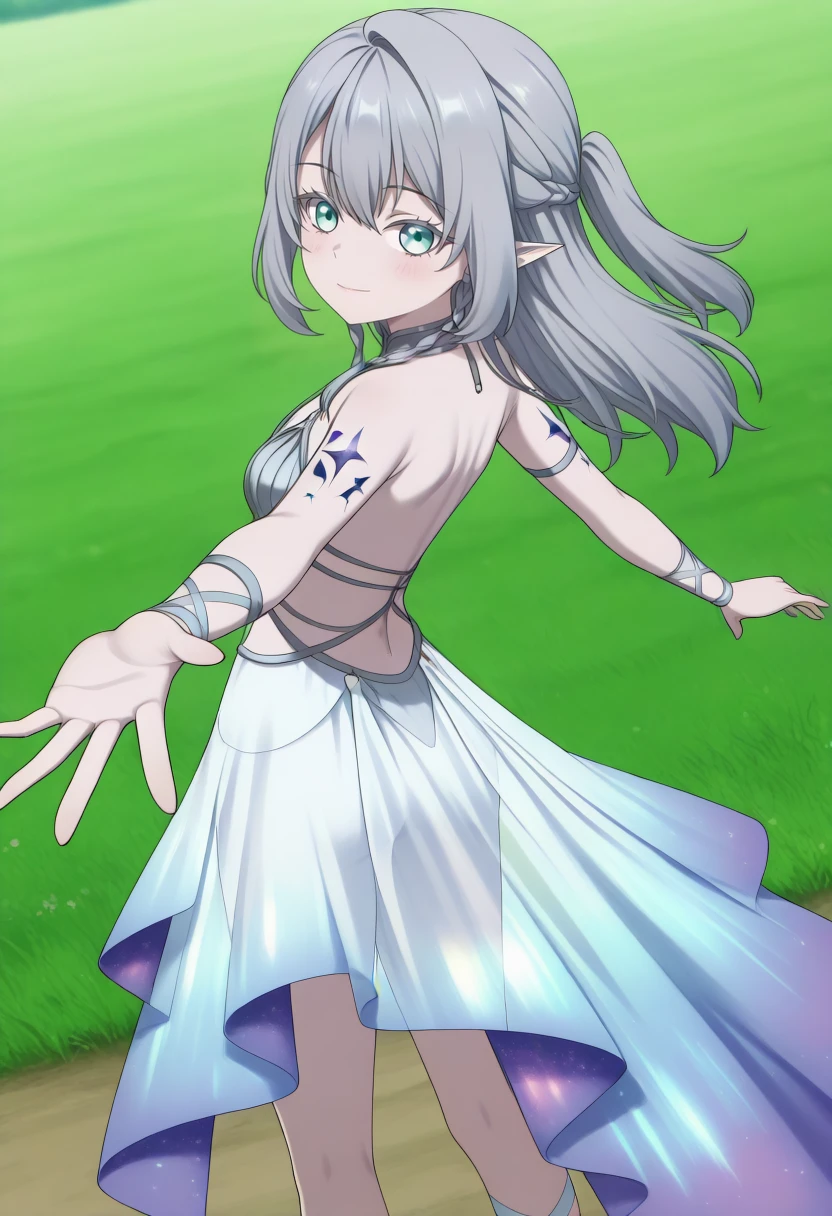 cha13v1,fantasy,ethereal,white bodysuit,sheer skirt,galaxy print,gradient fabric,bare legs,deep cleavage,bare feet,backless,exposed back,delicate straps,leg wraps,star motif,anime screencap