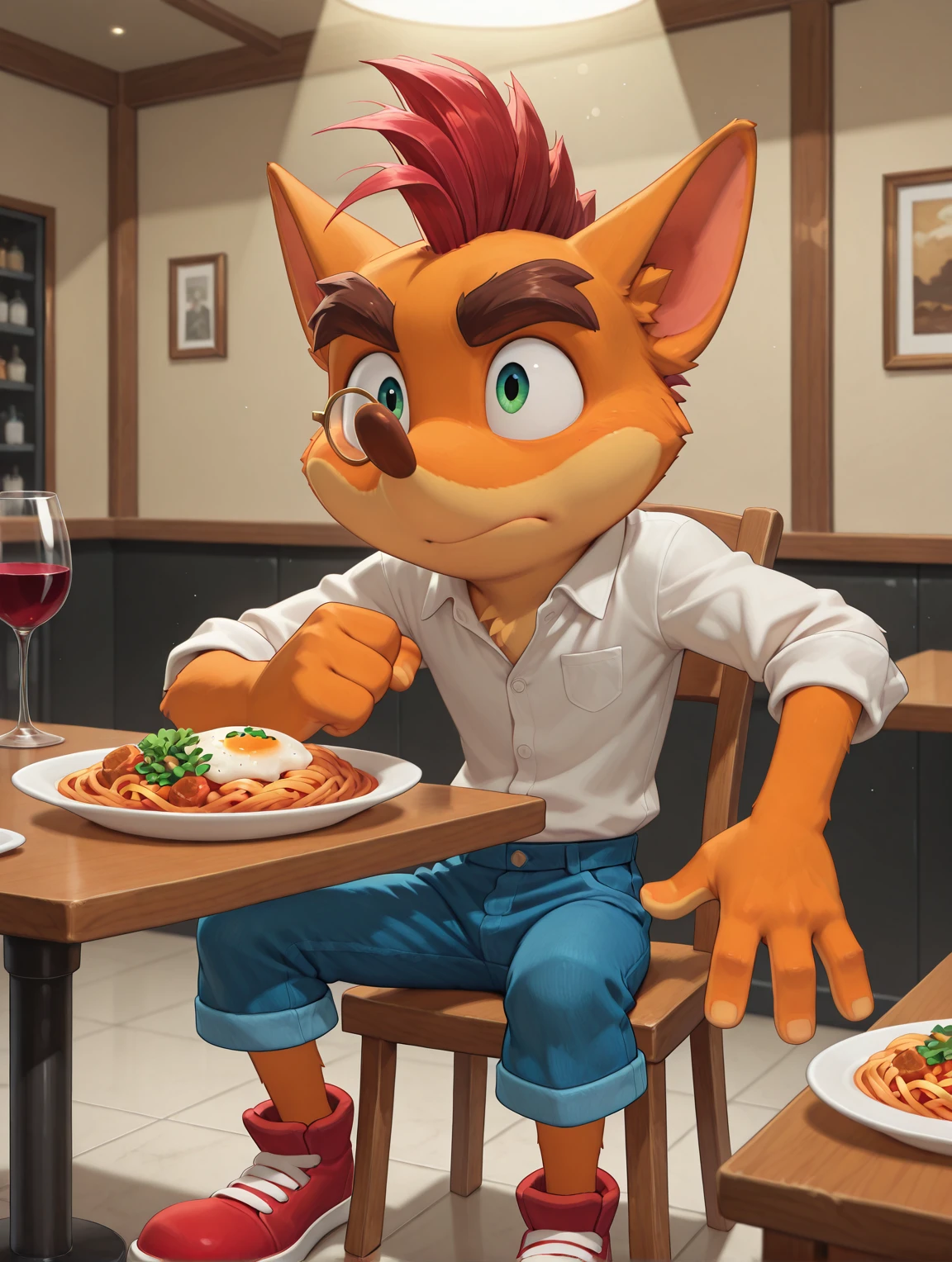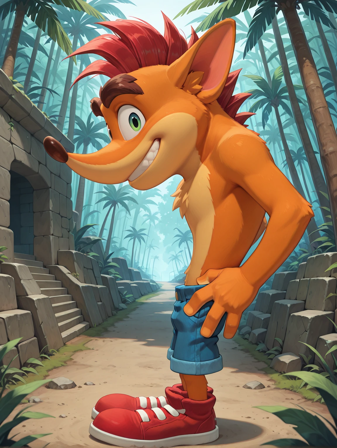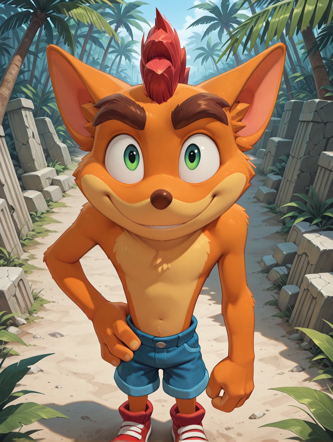 Additional tags: furry male, two-tone fur, orange fur, animal ears, long nose, green eyes, red mohawk, huge eyebrows, fingerless gloves, denim shorts, red sneakers,