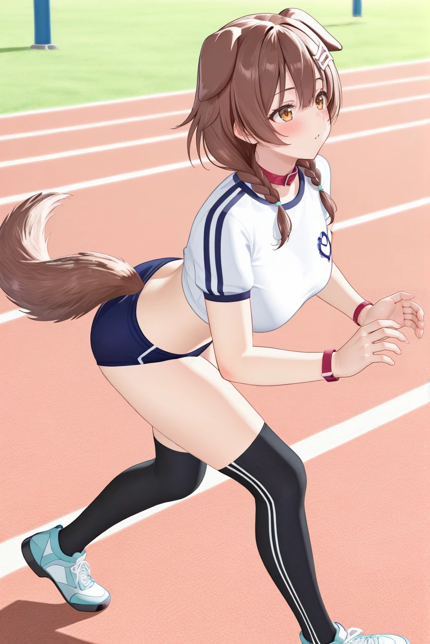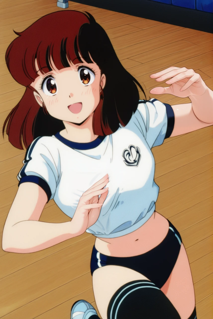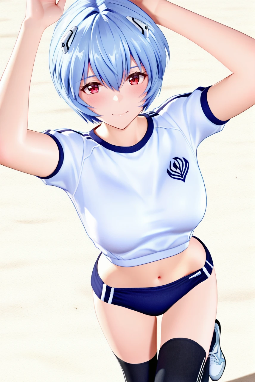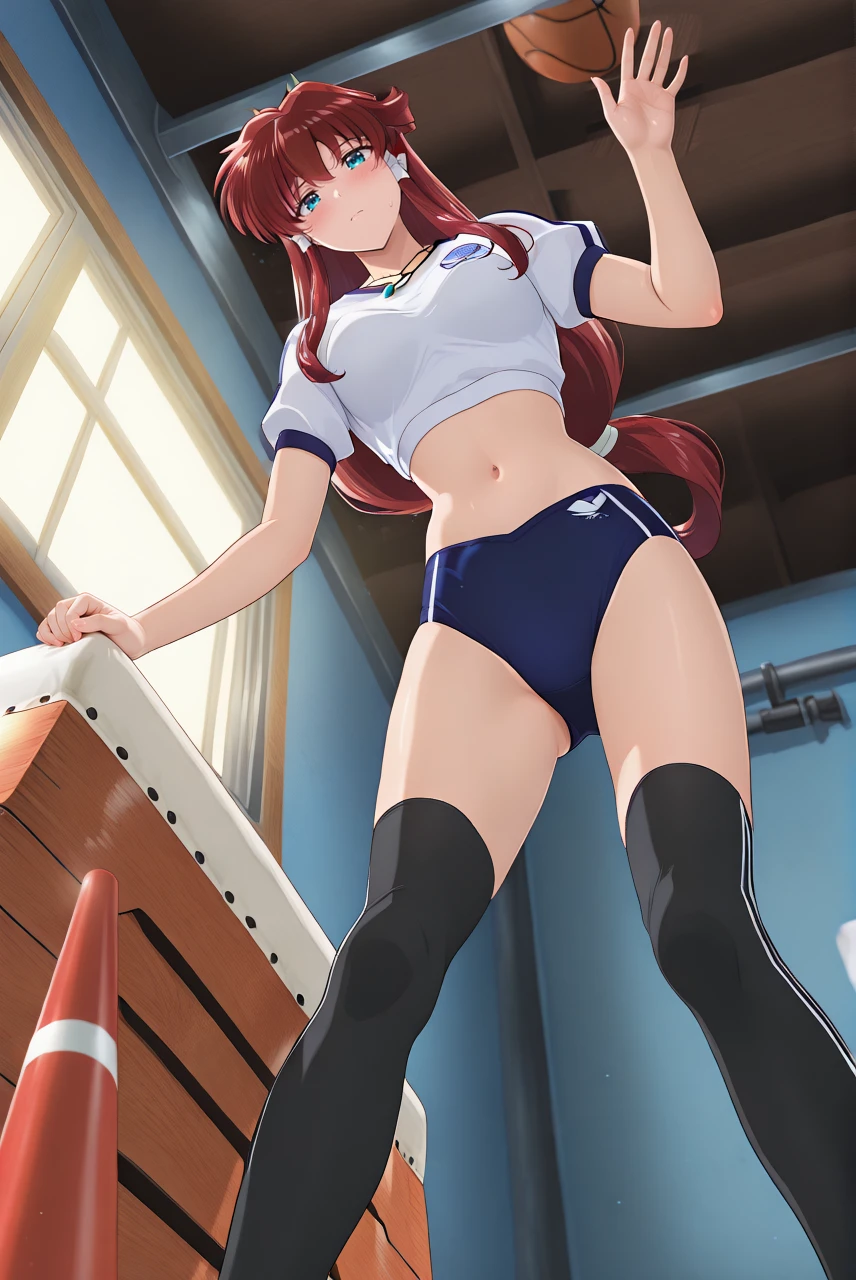 Main Prompt: StylishBloomers, gym uniform, midriff, black thighhighs, sneakers, blue buruma, shirt, crop top, short sleeves, over-kneehighs, double vertical stripe