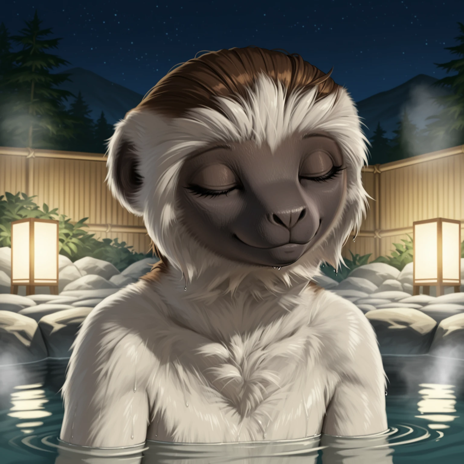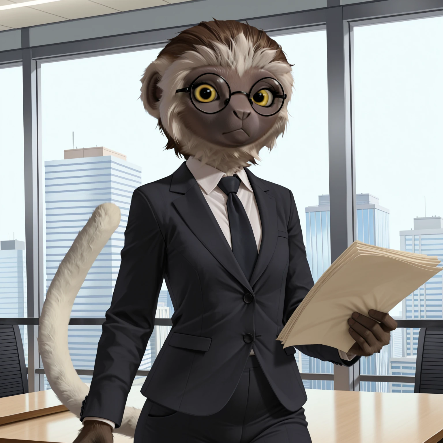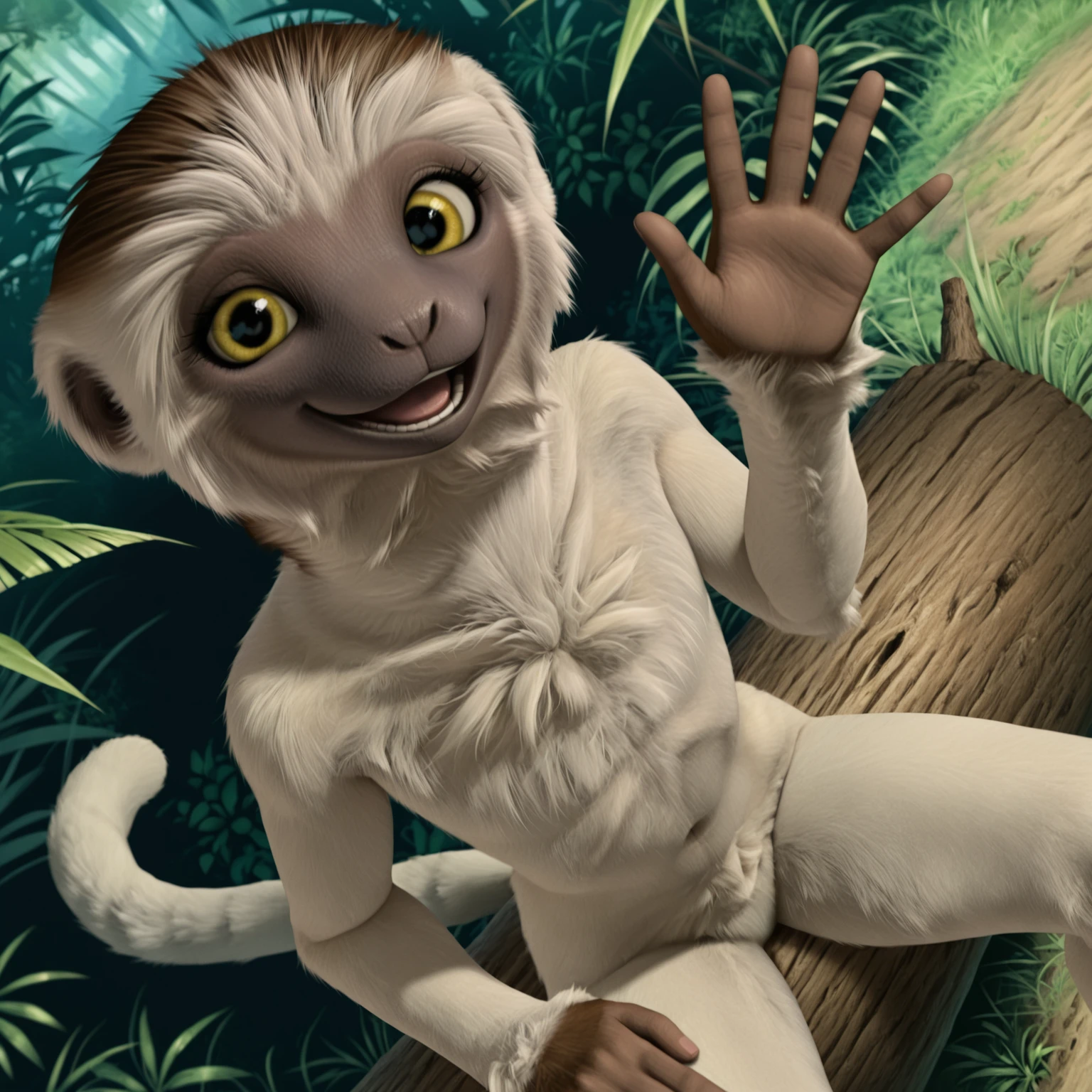 Positive Prompts: Pilo, furry female, anthro, primate, monkey, lemur, brown inner ear, brown hair, yellow eyes, black pupils, white body, white fur, white tail, monkey tail, medium tail
