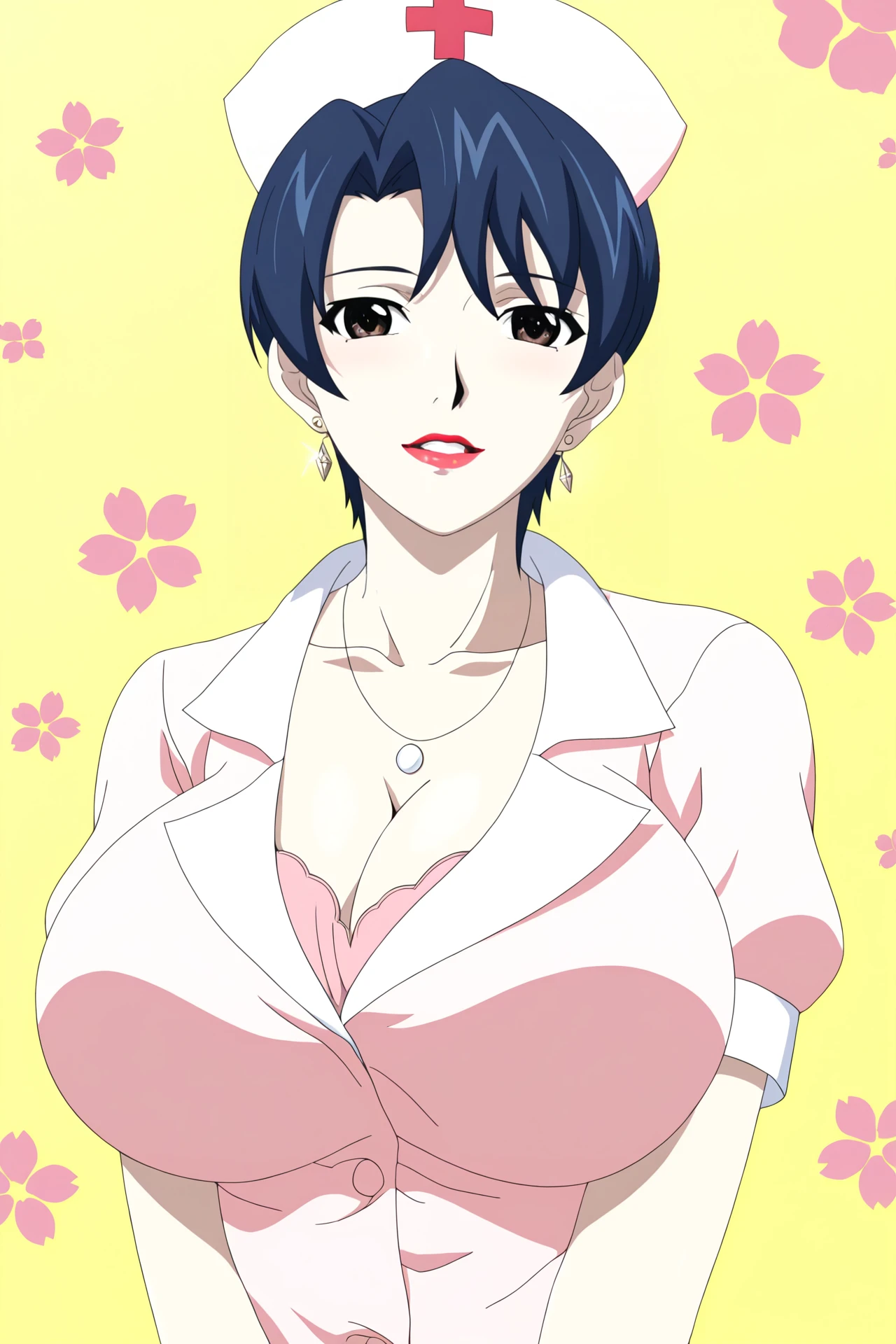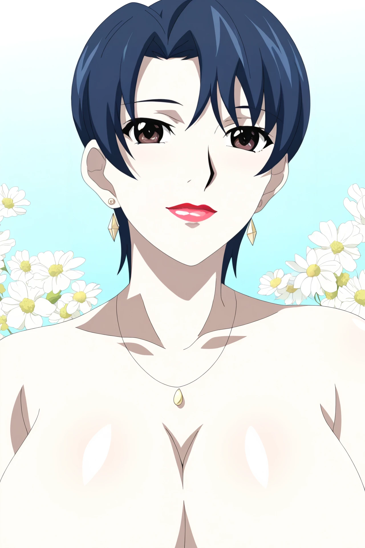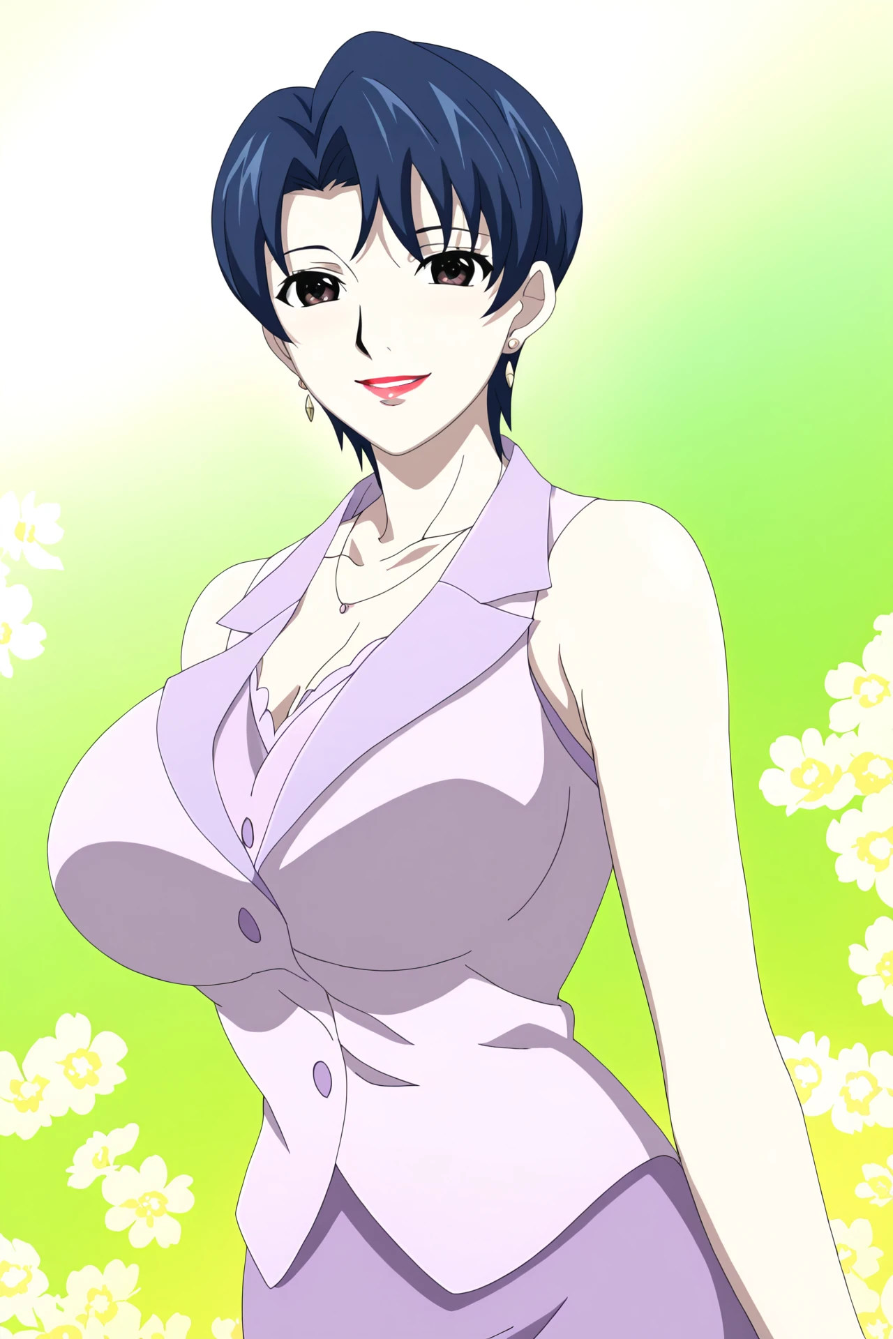 Misako Amamiya,1girl,solo,mature female,black hair,brown eyes,lipstick,makeup,large breasts,