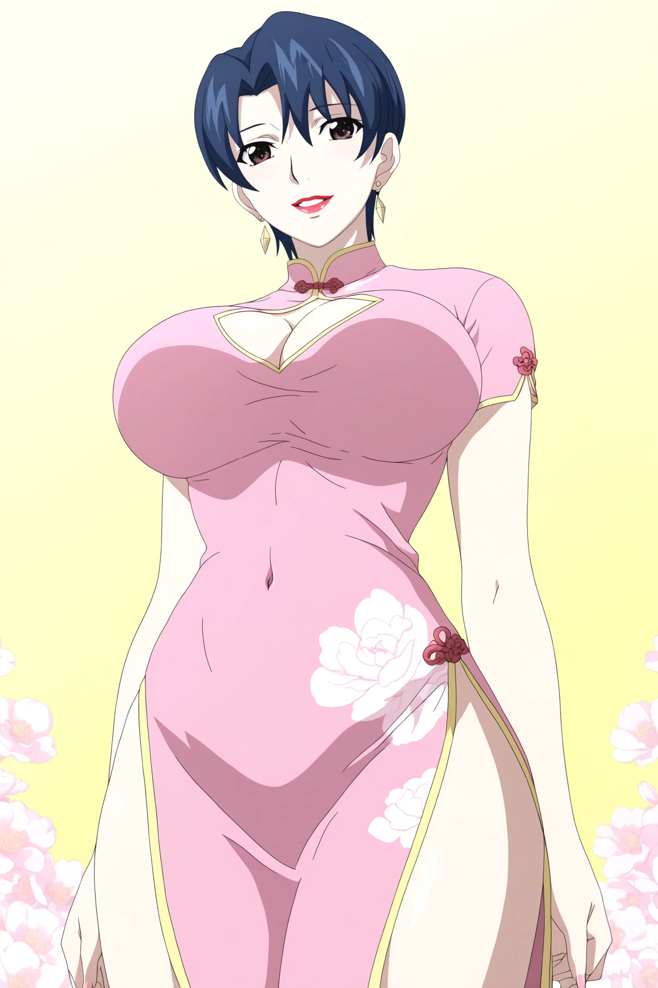 Emiko Amamiya,mature female,1girl,solo,jewelry,short hair,earrings,large breasts,lipstick,blue hair,makeup,brown eyes,