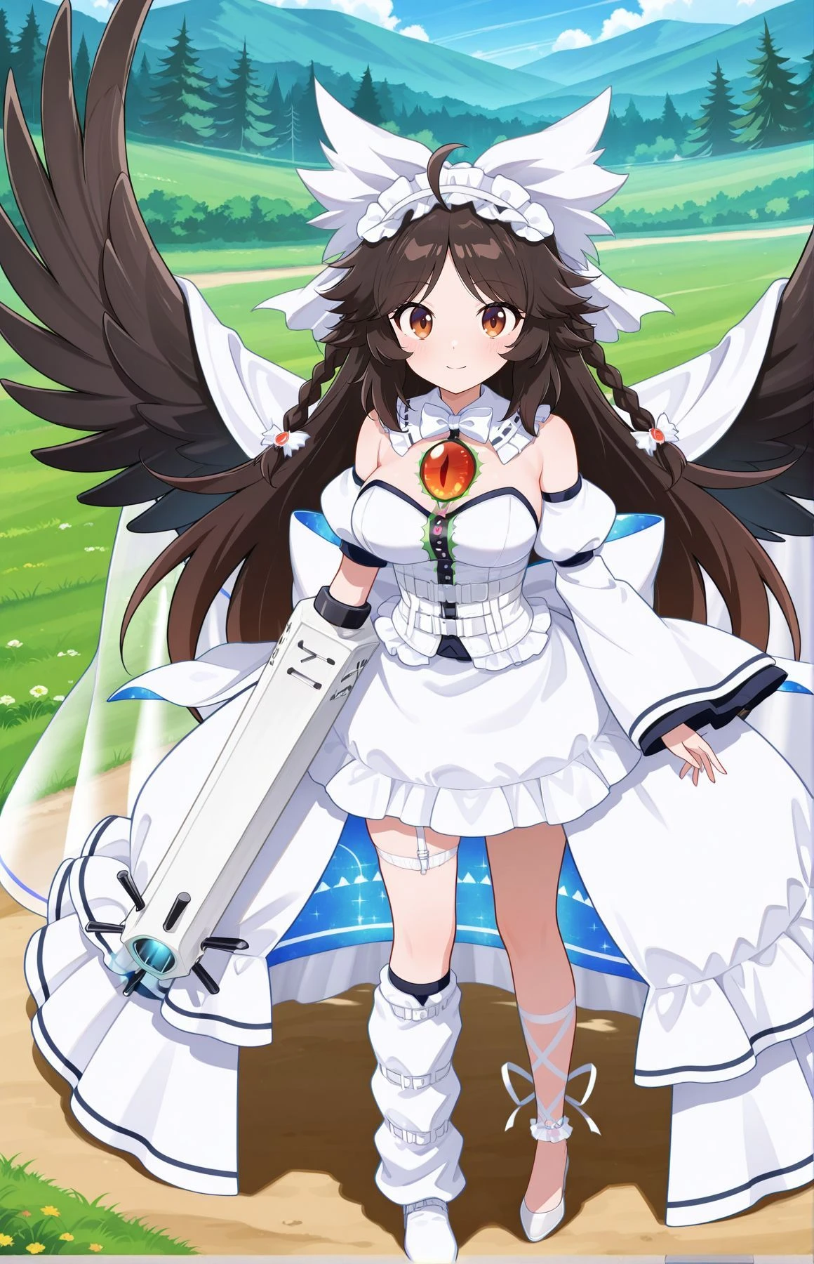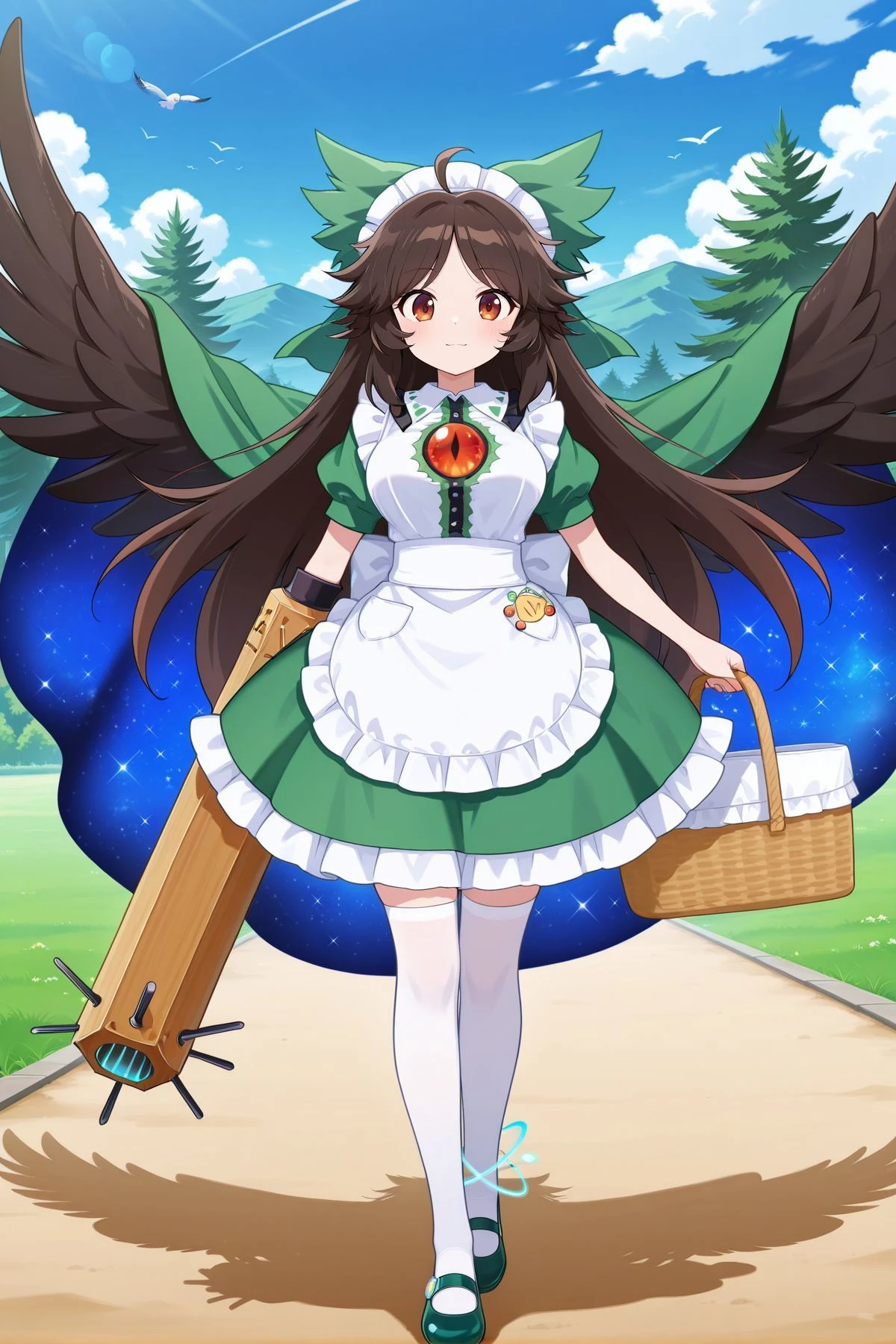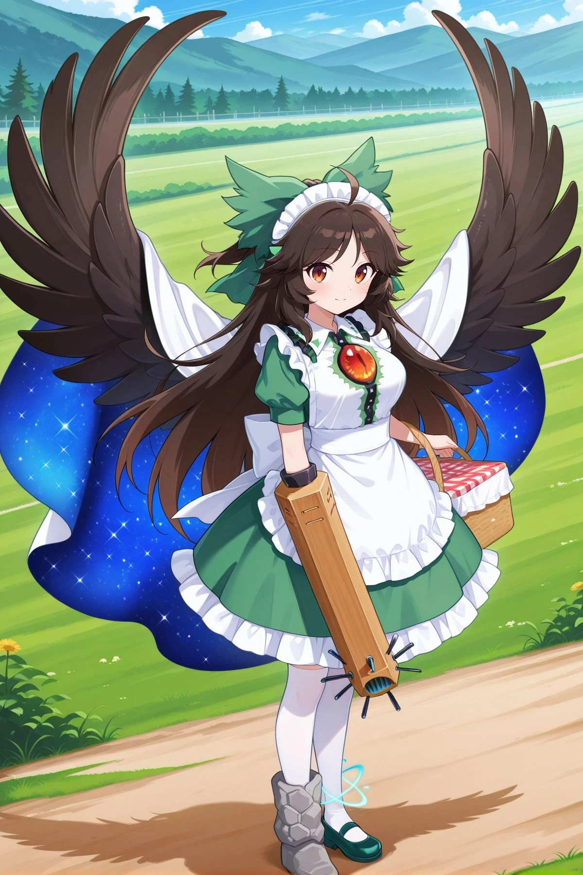 reiuji utsuho, 1girl, solo, brown eyes, black hair, long hair, ahoge, bird wings, black wings, third eye on ?????, reiuji utsuho \(palace of the earth spirits feathered helper\), alternate costume, hair bow, green bow, maid headdress, green neck ribbon, light green cape, print cape, starry sky print, green dress, frilled dress, puffy short sleeves, maid apron, frilled apron, white apron, back bow, white bow, bird pin, white thighhighs, green shoes, mary janes, asymmetrical footwear, mismatched footwear, holding picnic basket, arm cannon, control rod,reiuji utsuho, 1girl, solo, brown eyes, black hair, long hair, messy hair, ahoge, bird wings, black wings, third eye on ?????, ???????,, reiuji utsuho \(occasionally non-operational underworld sun\), alternate costume, hair bow, green bow, white cape, print cape, cloud print, crescent print, cleavage, white shirt, torn shirt, single ???? shoulder, short sleeves, clothes writing, asymmetrical footwear, mismatched footwear, white socks, purple boots, fur-trimmed boots, yellow arm cannon, fur-trimmed arm cannon,reiuji utsuho, 1girl, solo, brown eyes, black hair, twin braids, very long hair, ahoge, bird wings, black wings, third eye on ?????, ???????,, reiuji utsuho \(hells white fusion\), alternate costume, hair bow, white bow, white hairband, frilled hairband, white cape, see-through cape, detached collar, frilled collar, white bowtie, ???? shoulders, cleavage, red teardrop, white dress, wedding dress, frilled dress, white corset, detached sleeves, asymmetrical sleeves, mismatached sleeves, wide sleeves, back bow, white bow, high-low skirt, white garter strap, asymmetrical footwear, mismatched footwear, leg ribbon, high heels, white shoes, arm cannon, white arm cannon, control rod,Utsuho (The Tiny Queen's Charcoal Maker) :