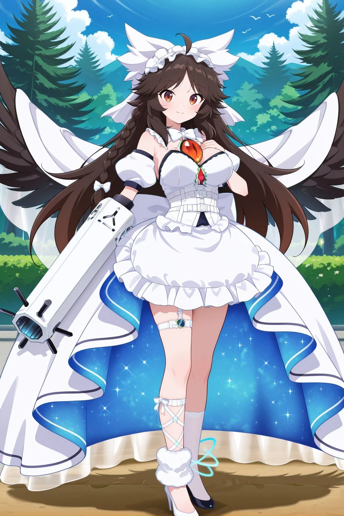 reiuji utsuho, 1girl, solo, brown eyes, brown hair, long hair, ahoge, black wings, bird wings, third eye, ???????, reiuji utsuho \(fantasy rebirth\), alternate costume, twin braids, very long hair, hair bow, white bow, white hairband, frilled hairband, white cape, see-through cape, white bowtie,white dress, wedding dress, ???? shoulders, cleavage, garter strap, asymmetrical footwear, high heels, white shoes, arm cannon, white cannon, holding basket, reiuji utsuho, 1girl, solo, brown eyes, brown hair, long hair, ahoge, black wings, bird wings, third eye, ???????, reiuji utsuho \(occasionally non-operational underworld sun\), alternate costume, hair bow, green bow, white cape, cloud print, crescent print, white shirt, clothes writing, torn clothes, torn shirt, single ???? shoulder, asymmetrical footwear, white socks, fur-trimmed legwear, purple boots, arm cannon, yellow cannon, fur-trimmed cannon,reiuji utsuho, 1girl, solo, brown eyes, brown hair, long hair, ahoge, black wings, bird wings, third eye, ???????, reiuji utsuho \(palace of the earth spirits' feathered helper\), alternate costume, hair bow, green bow, maid headdress, green dress, maid apron, frilled apron, white apron, green cape, starry sky print, white thighhighs, green shoes, asymmetrical footwear, holding basket, arm cannon, Utsuho (The Tiny Queen's Charcoal Maker) :
