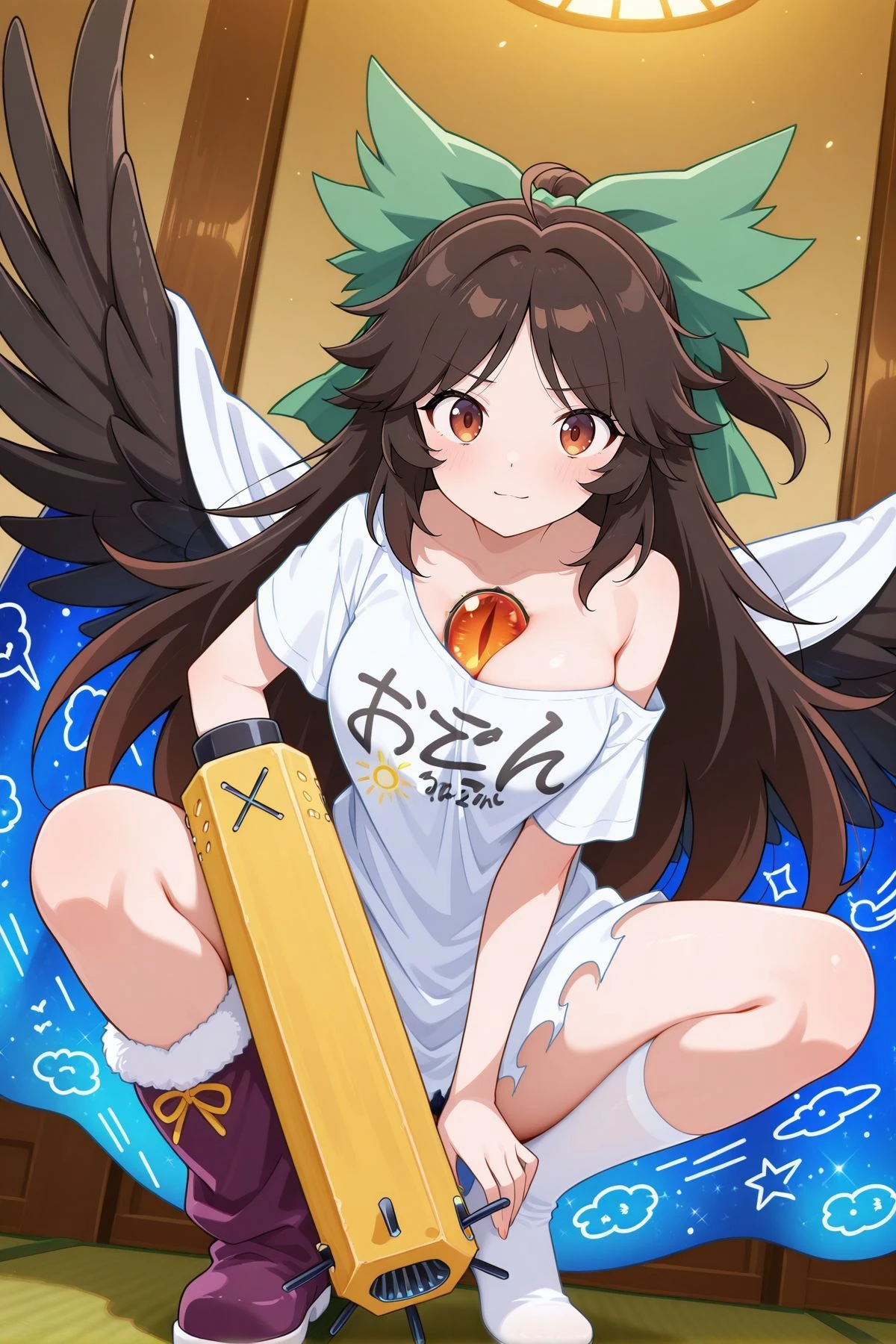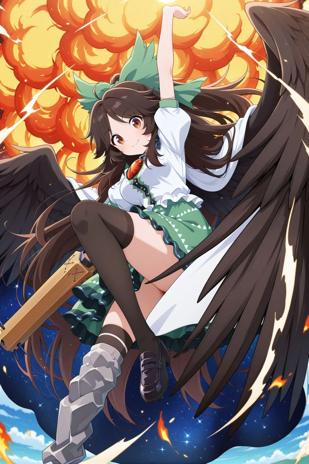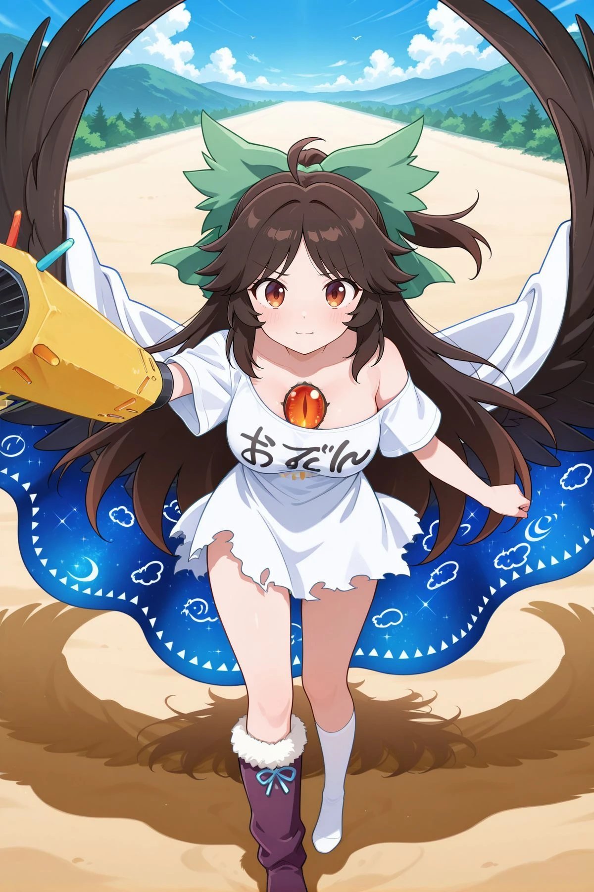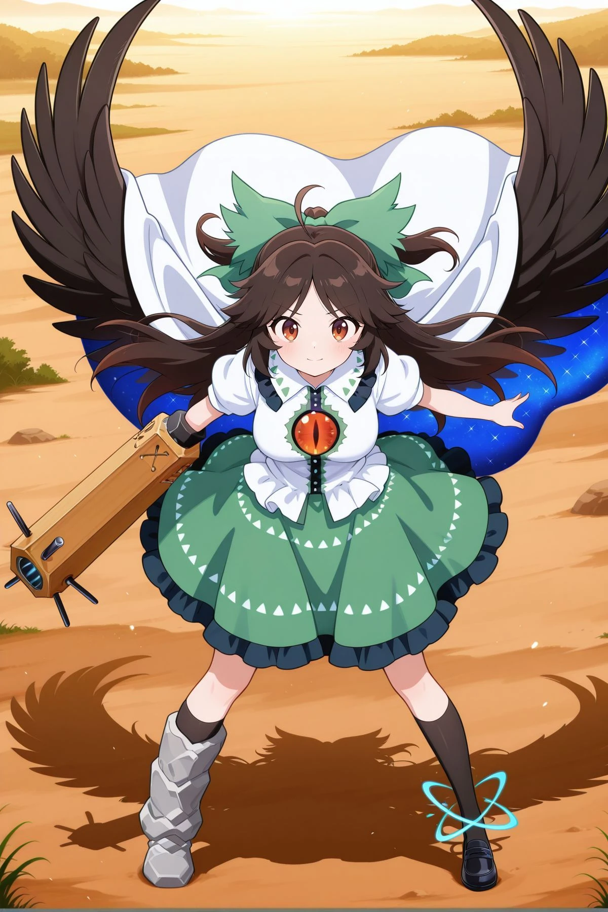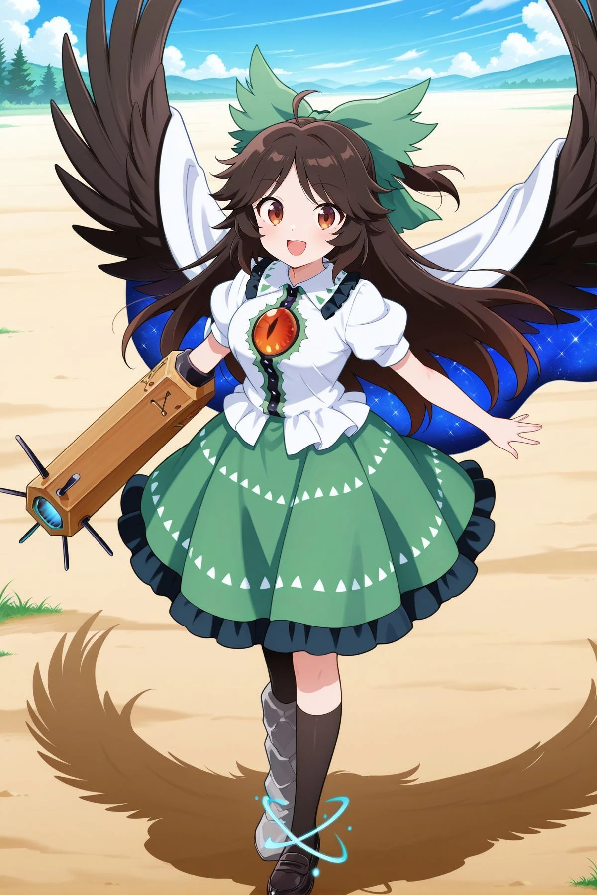 reiuji utsuho, 1girl, solo, brown eyes, brown hair, long hair, ahoge, black wings, bird wings, third eye, breasts,green bow, hair bow, white cape, white shirt, green skirt, puffy short sleeves, asymmetrical footwear, arm cannon,Alternative :