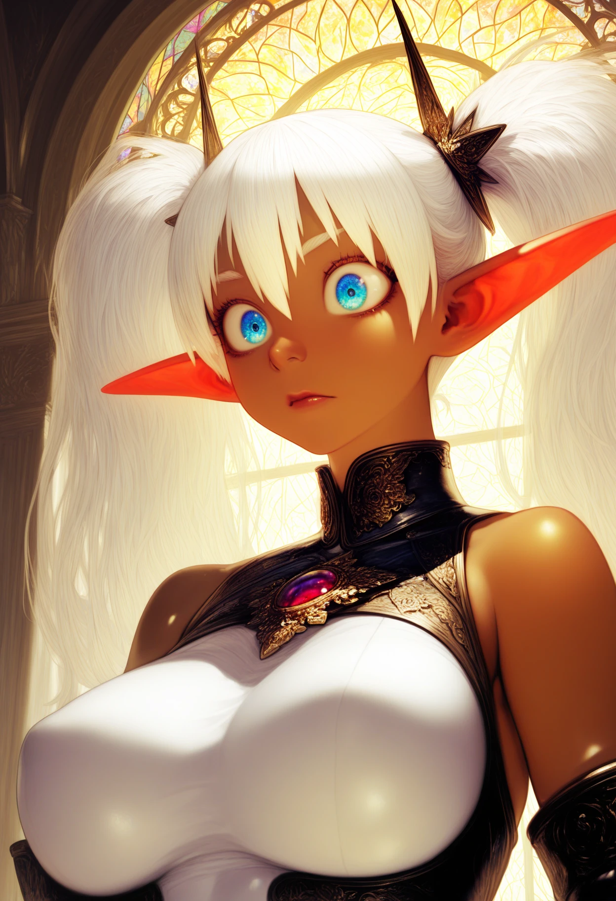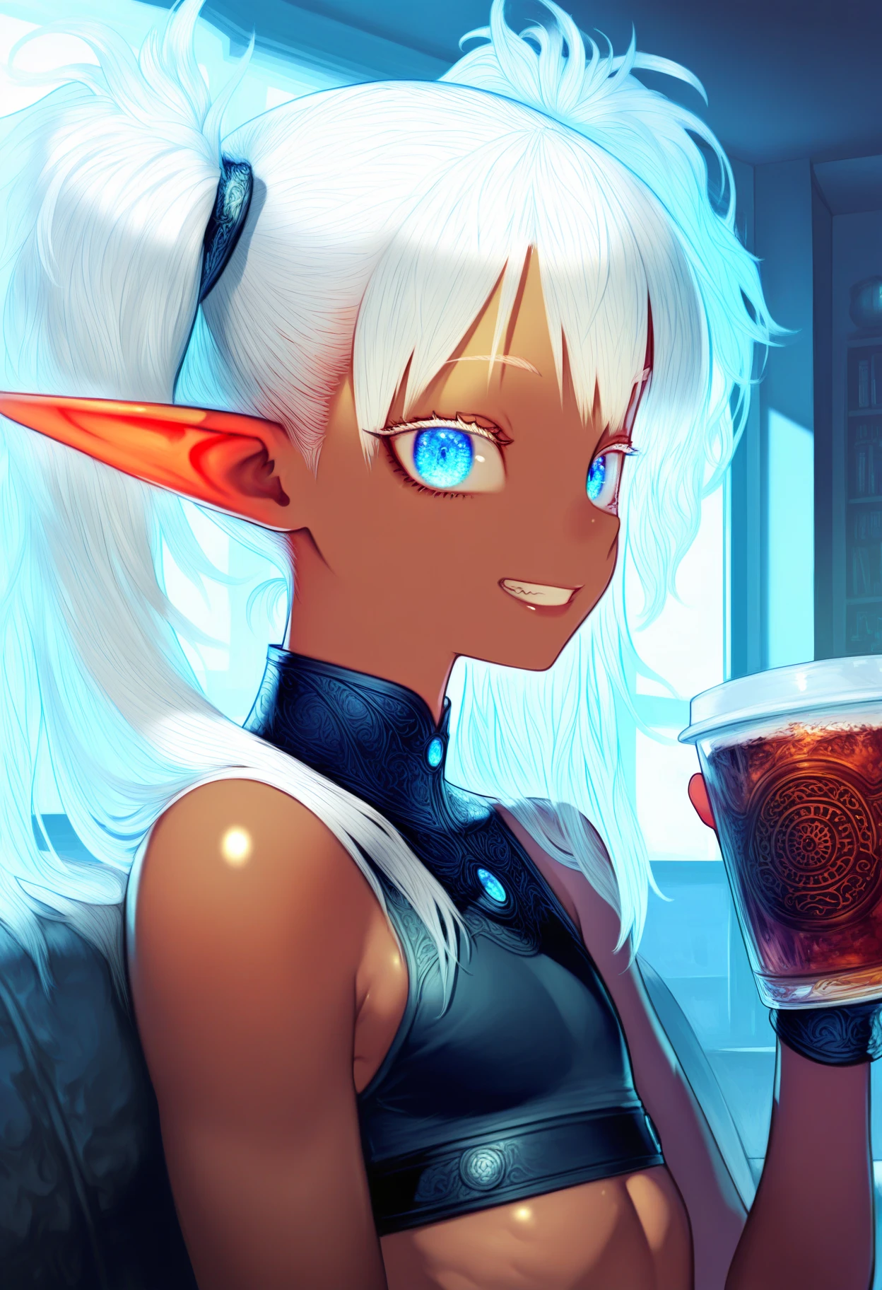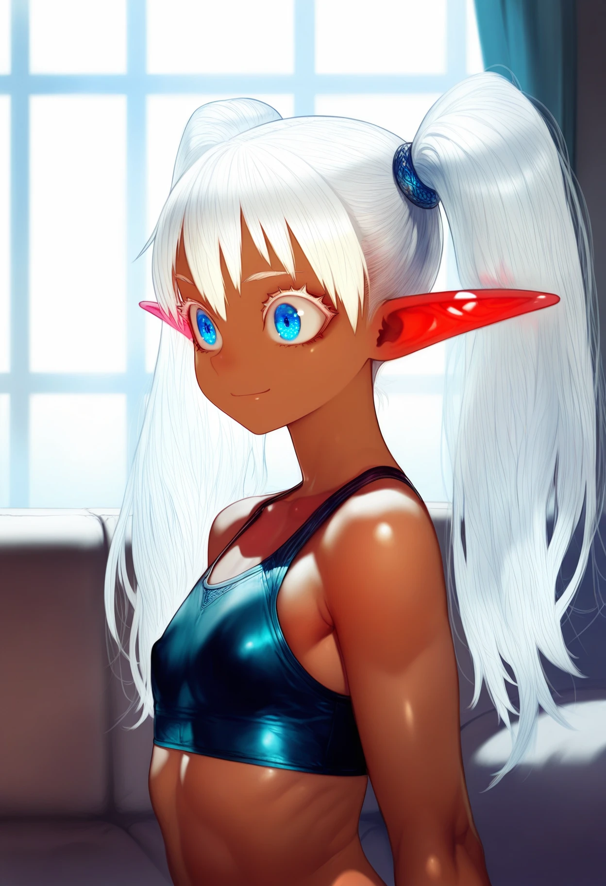 TAGS TO USE: daceltystyle, solo, elf, dark skin, white hair, twintails, gloves, blue eyes, navel, schoolgirl outfit, miniskirt, etc.
