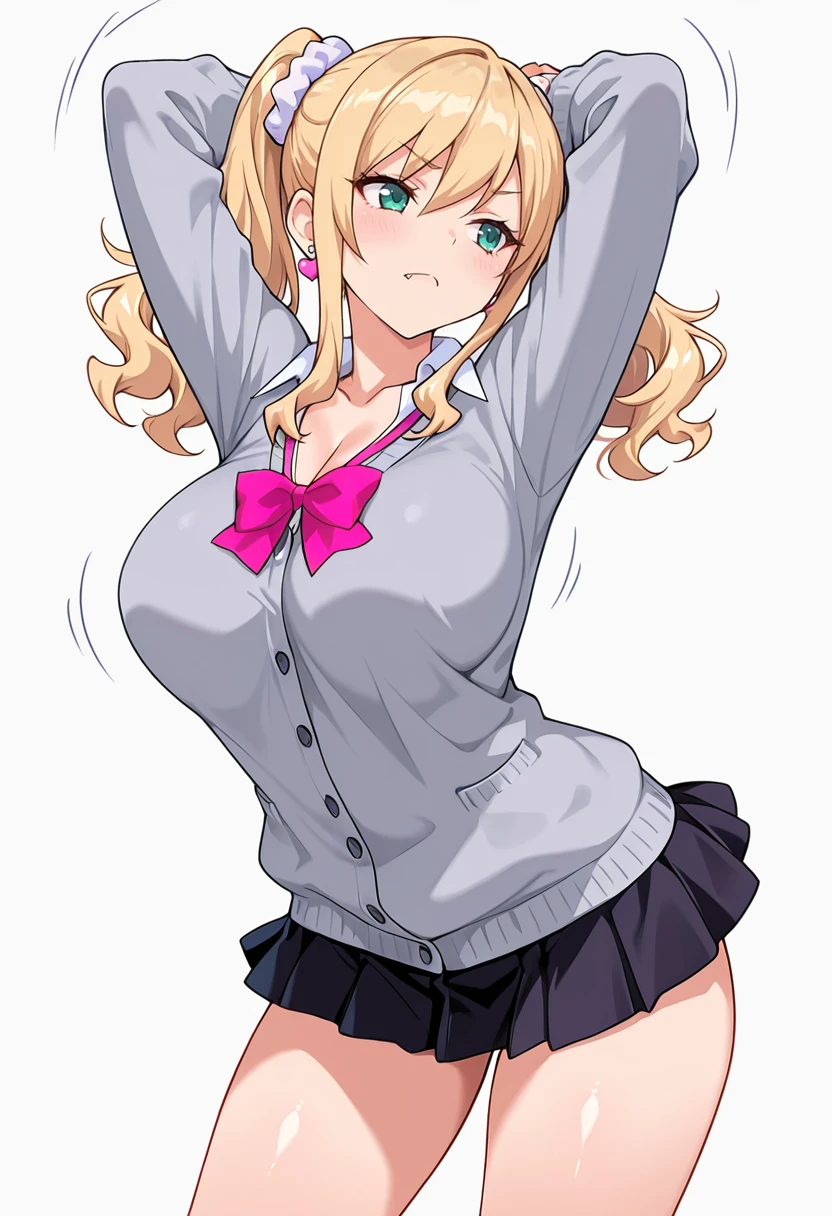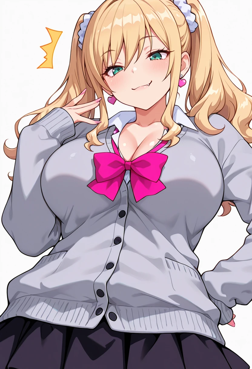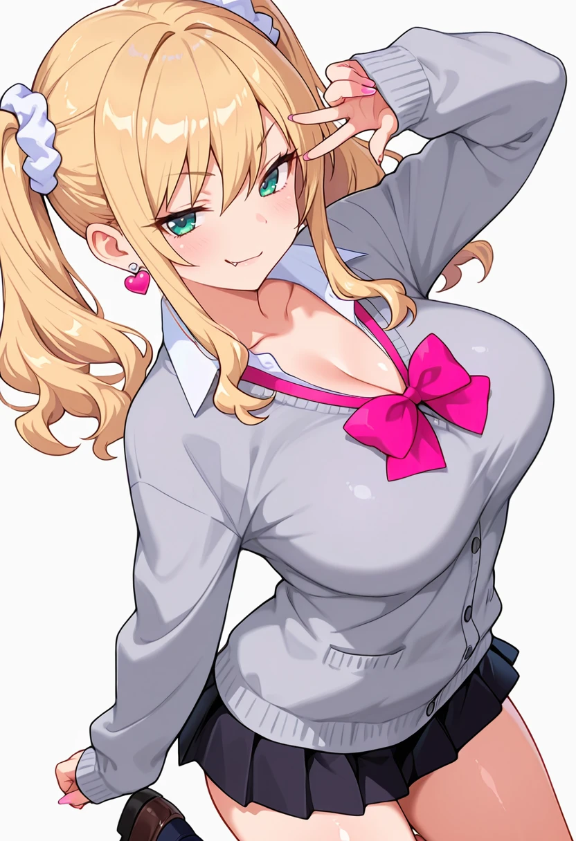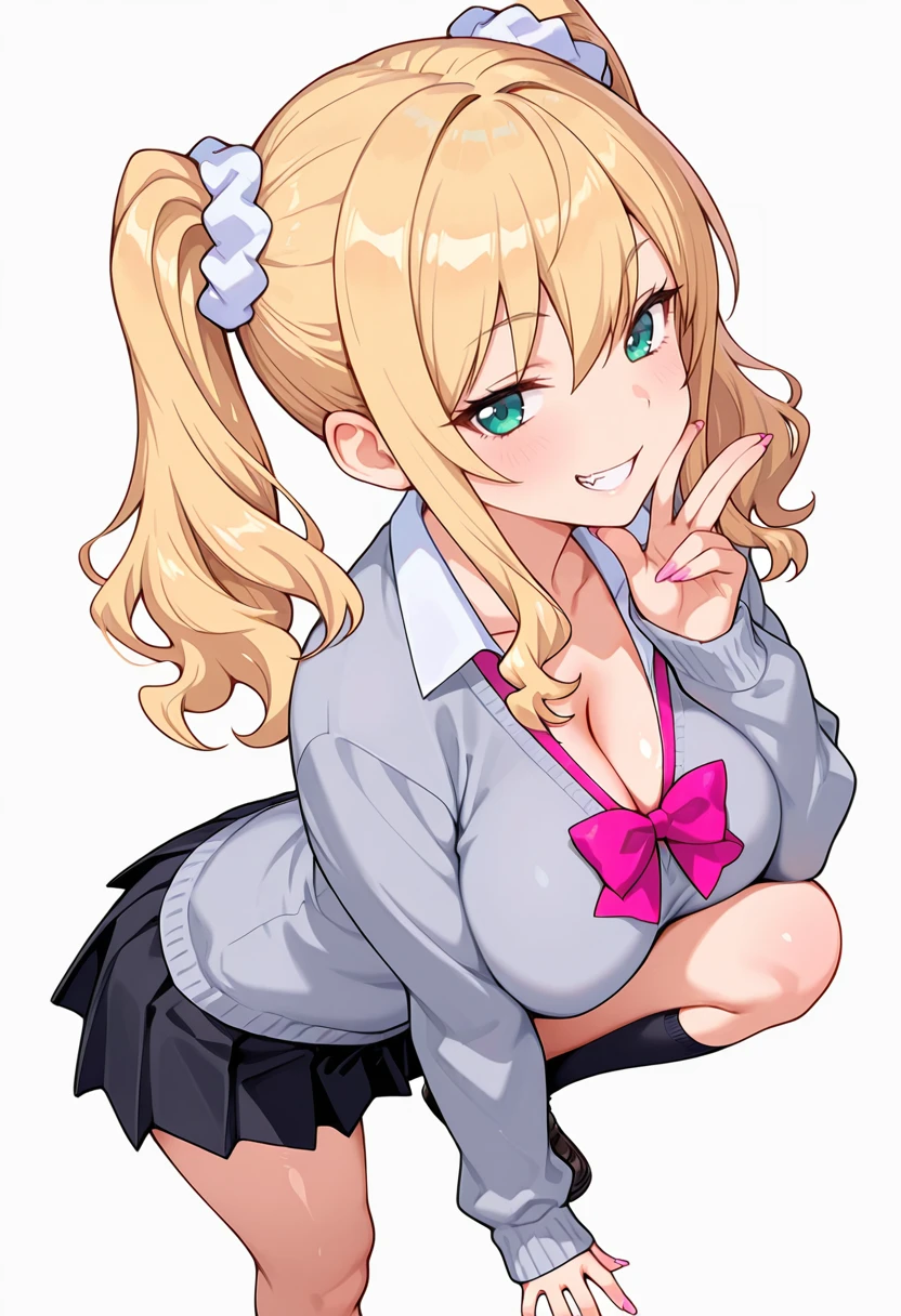 a_ko_cnr, 1girl, ?????????????, long hair, blonde hair, gyaru, twintails, fang, blue eyes,sidelocks, scrunchie, kogal, wavy hair, shiny skin, green eyes, fingernails,