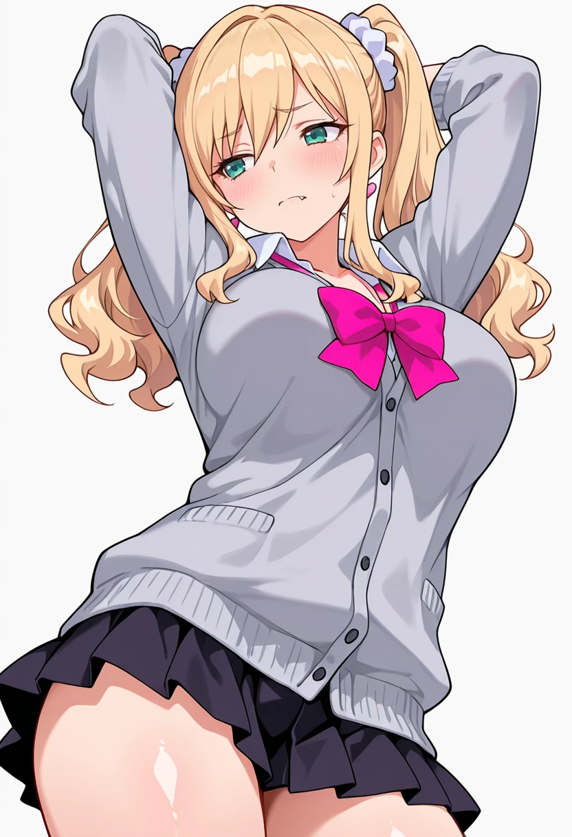 long sleeves,pink bowtie,grey cardigan,miniskirt, white shirt,sleeves past wrists, heart earrings,FAQ