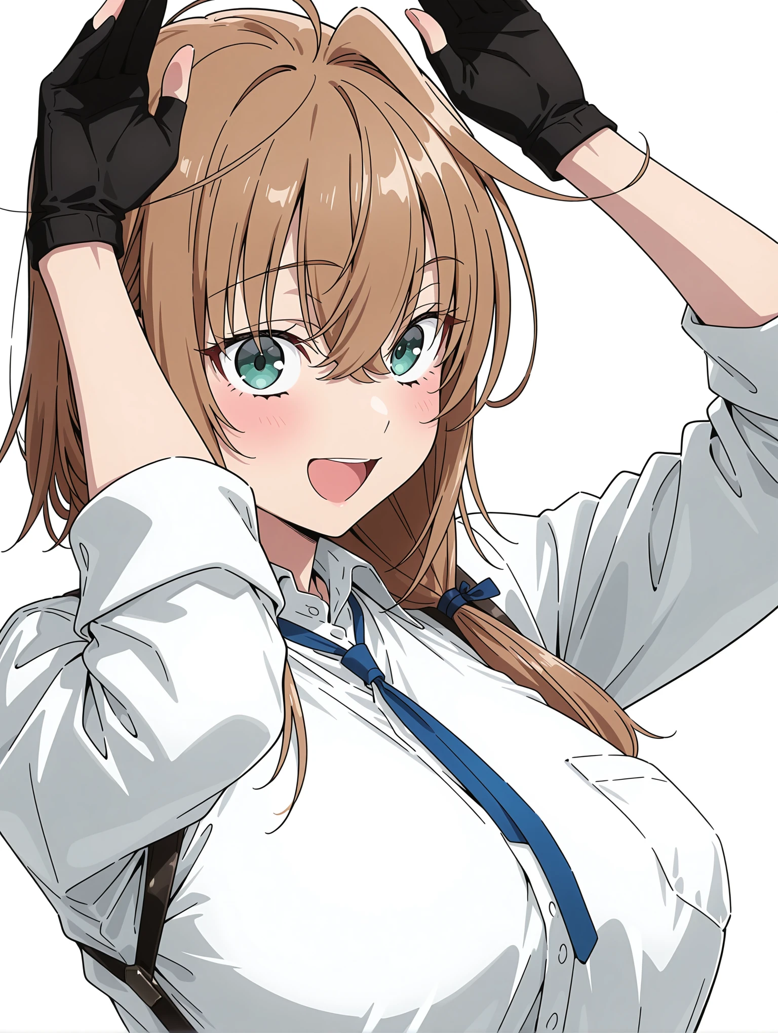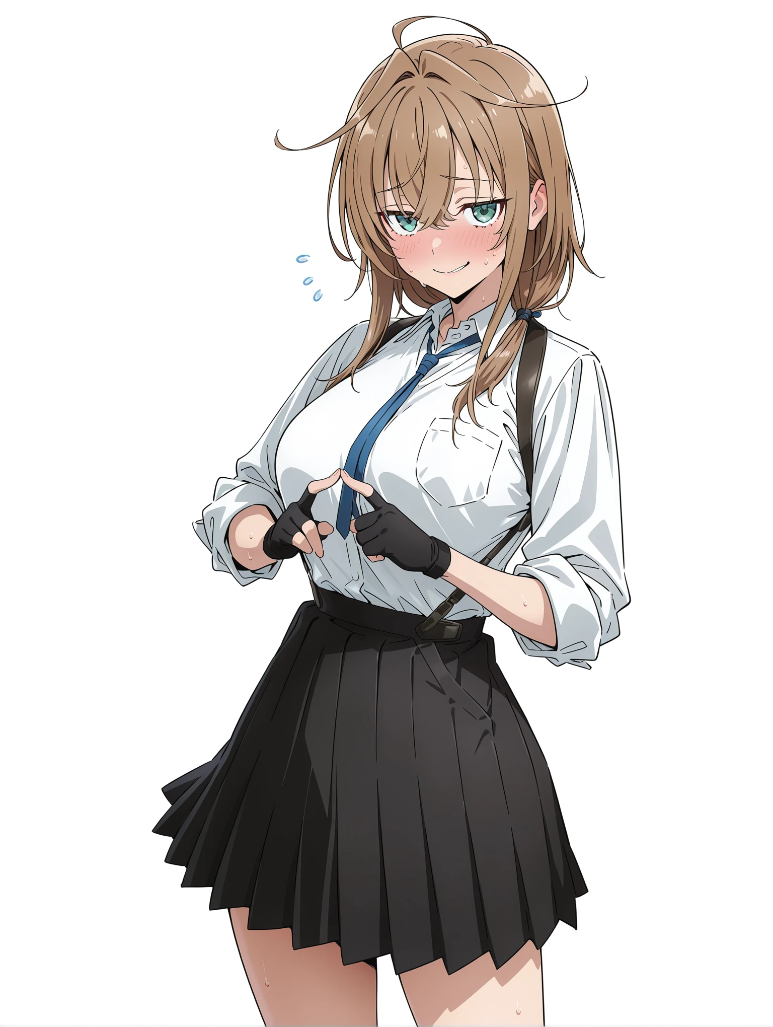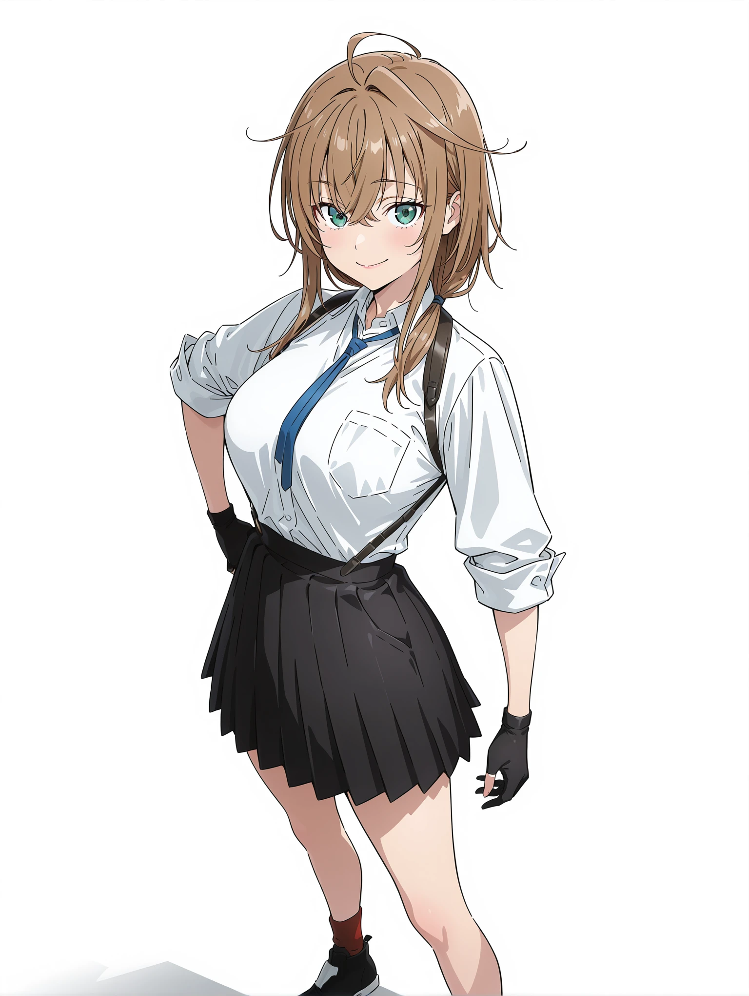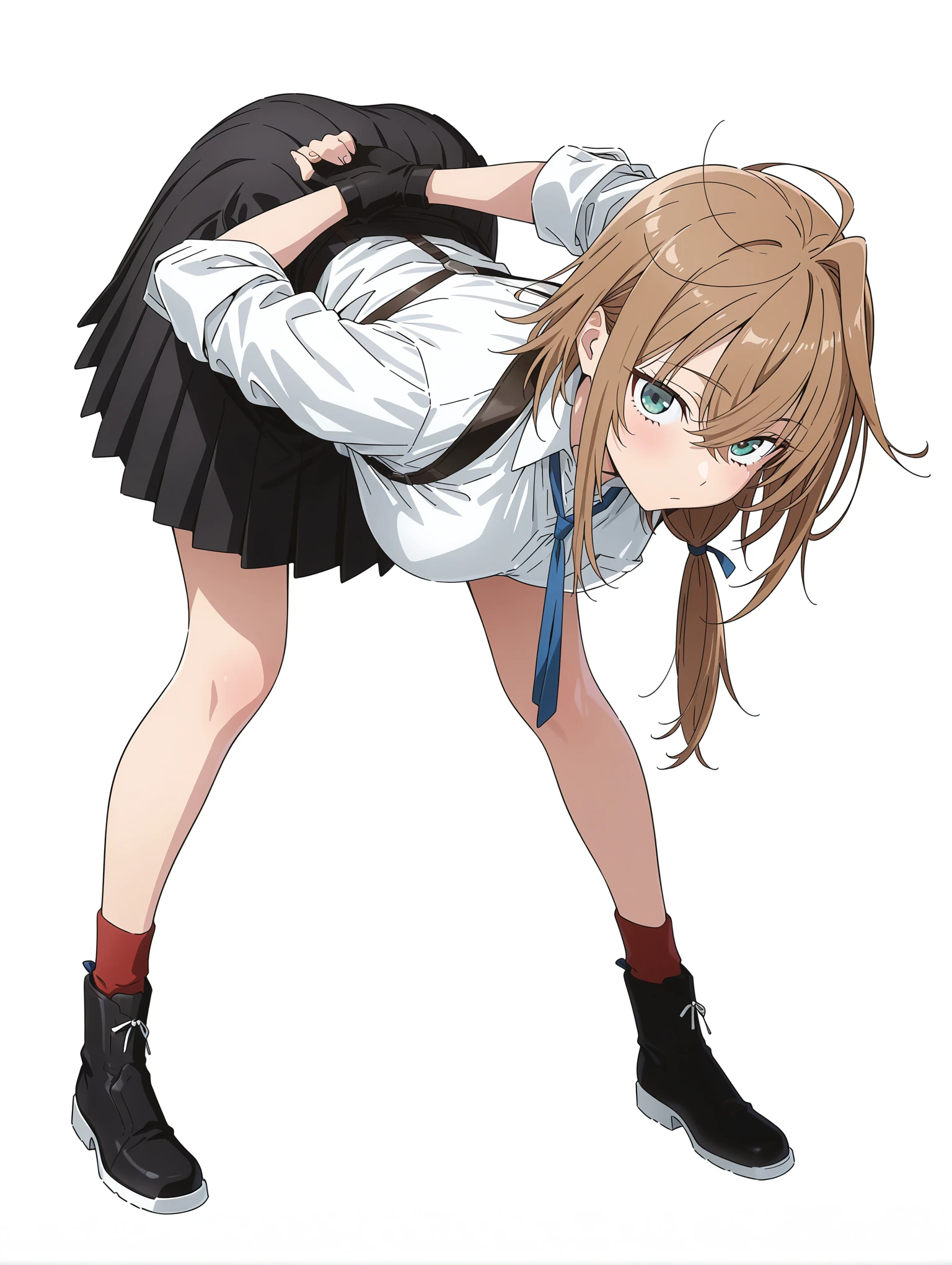 s_clothes,blue necktie,white shirt,collared shirt,sleeves rolled up, pocket,black fingerless gloves,suspenders,black pleated skirt,red socks,black footwear,