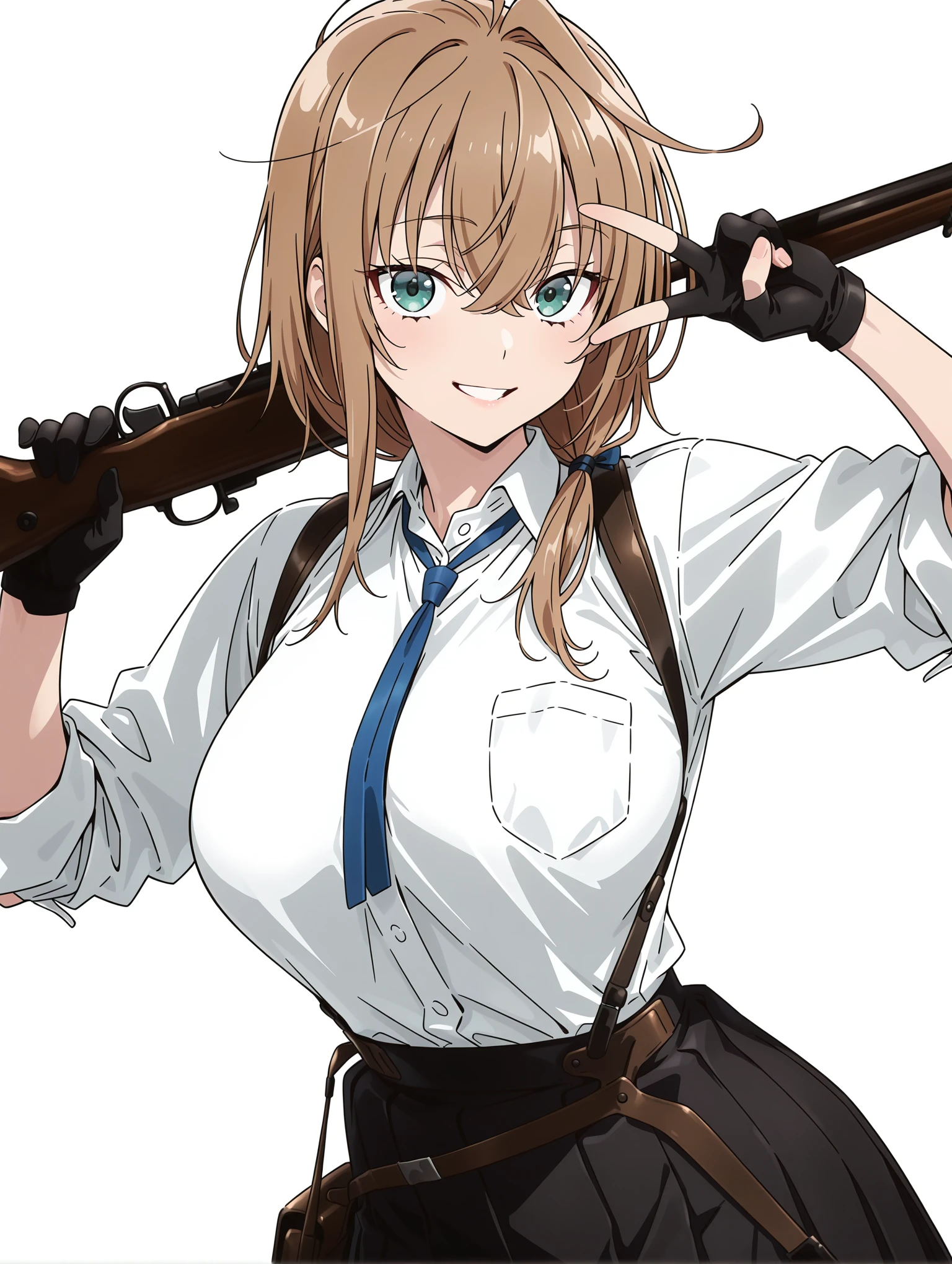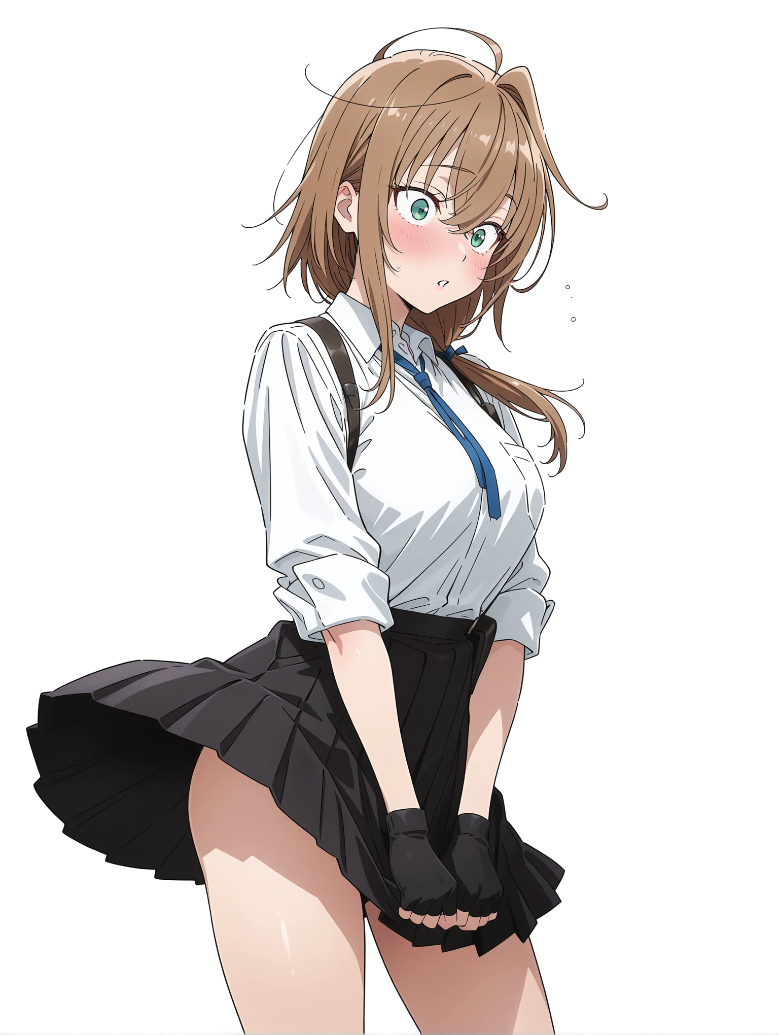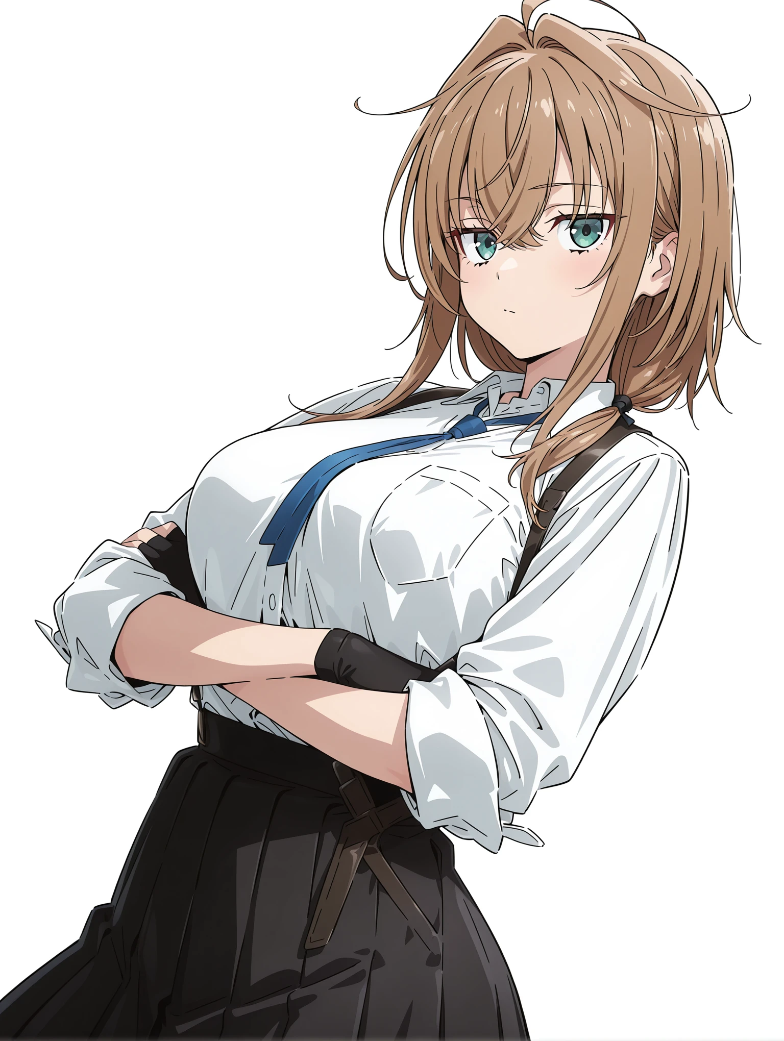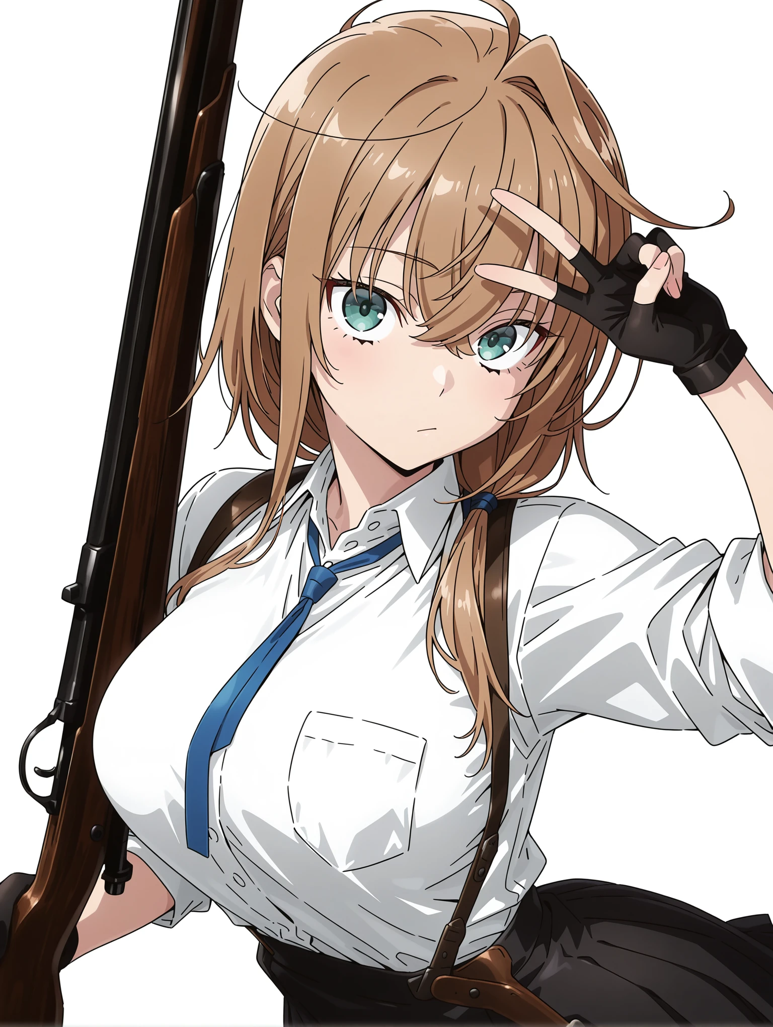 s_clothes,blue necktie,white shirt,collared shirt,sleeves rolled up, pocket,black fingerless gloves,suspenders,black pleated skirt,red socks,black footwear,