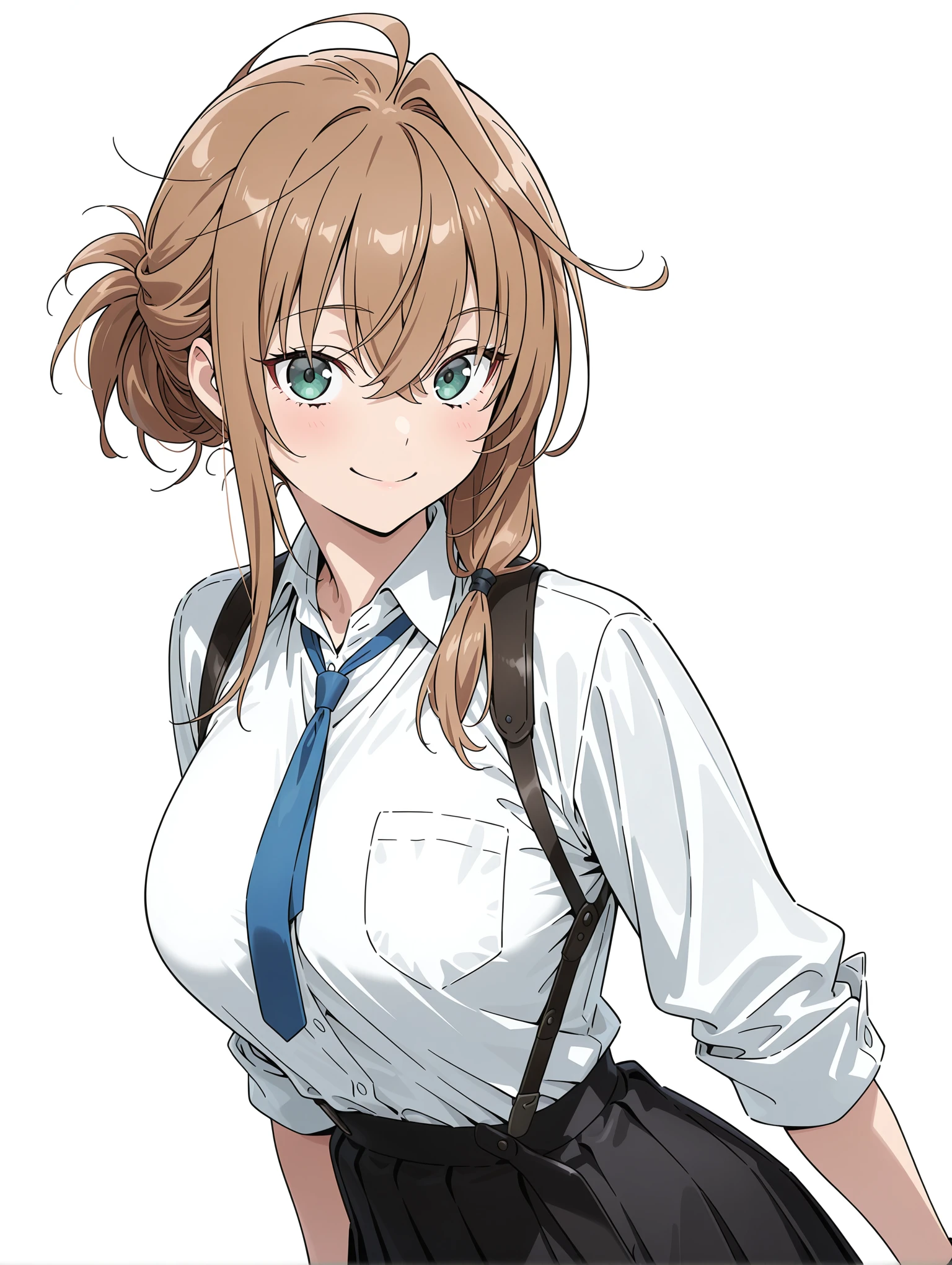 トリガーワード・k_shiina,ahoge,brown hair,hair between eyes,green eyes,low ponytail,