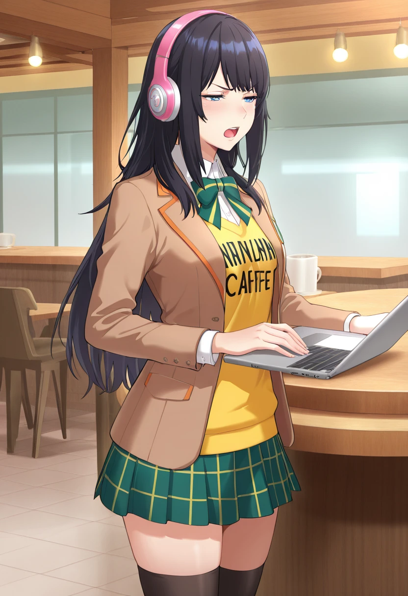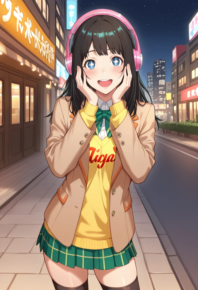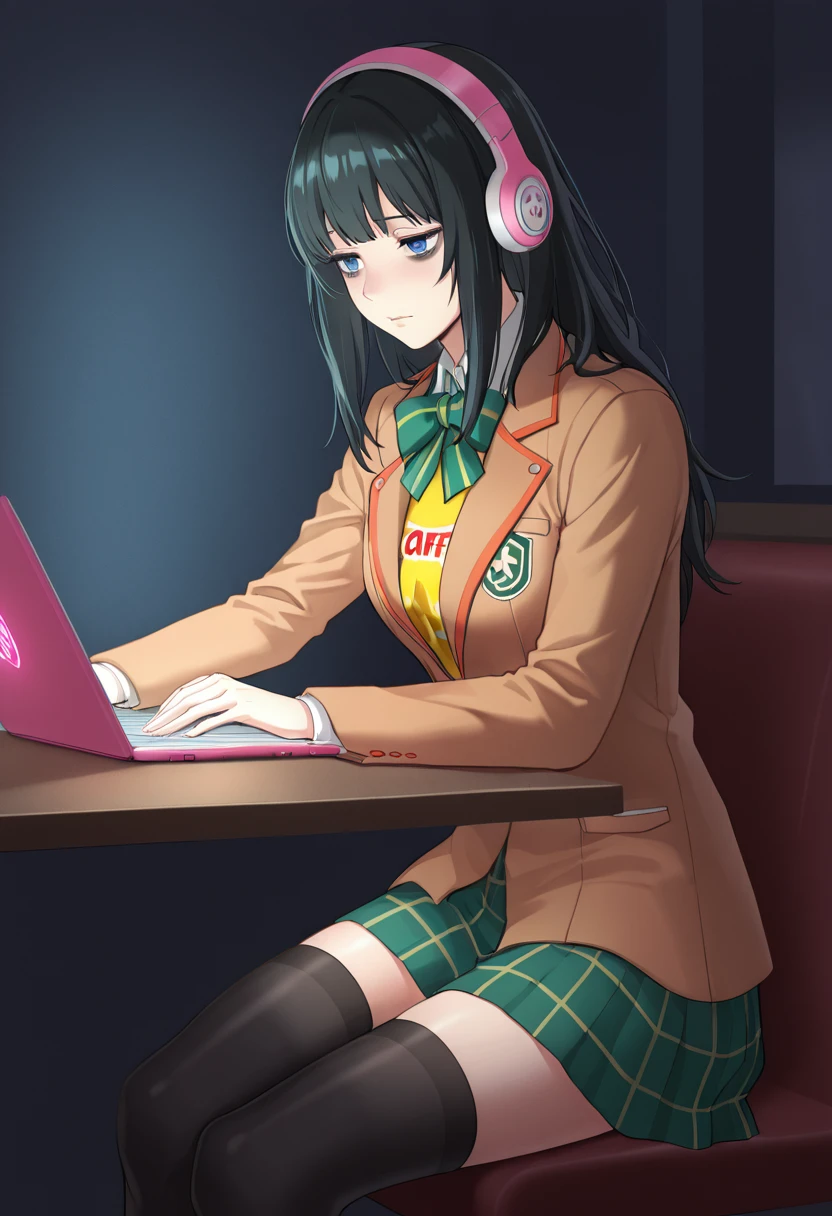 Trigger Words (Outfit): brown blazer, white collar, green bowtie, yellow shirt, print shirt, clothes writing, green skirt, miniskirt, plaid skirt, black thighhighs, zettai ryouiki, pink sneakers,