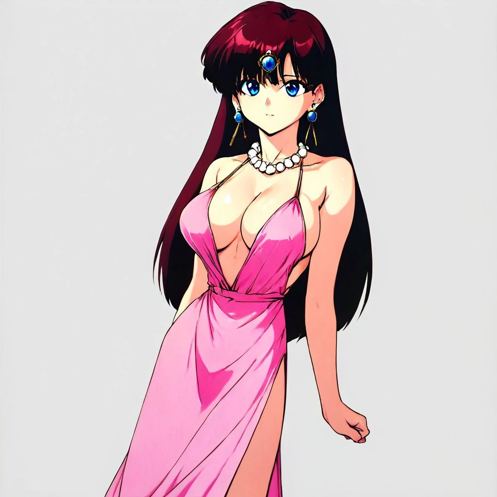 ukyo, 1girl, breasts, jewelry, blue eyes, solo, earrings, necklace, dress, long hair, large breasts, cleavage, pink dress, pearl necklace, bare shoulders, bangs, collarbone, brown hair