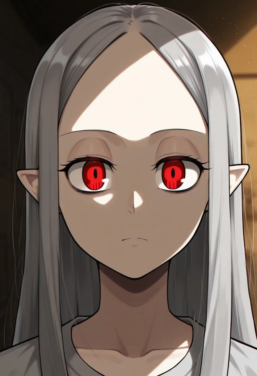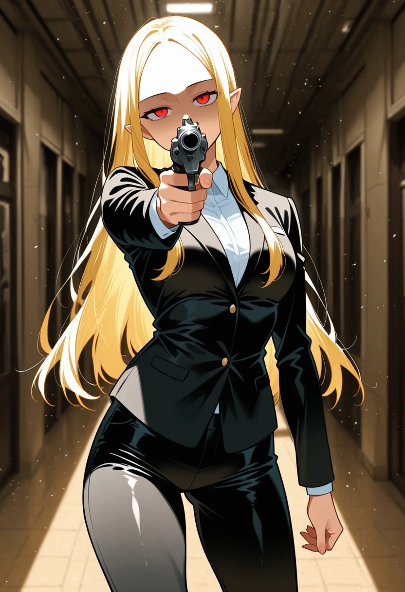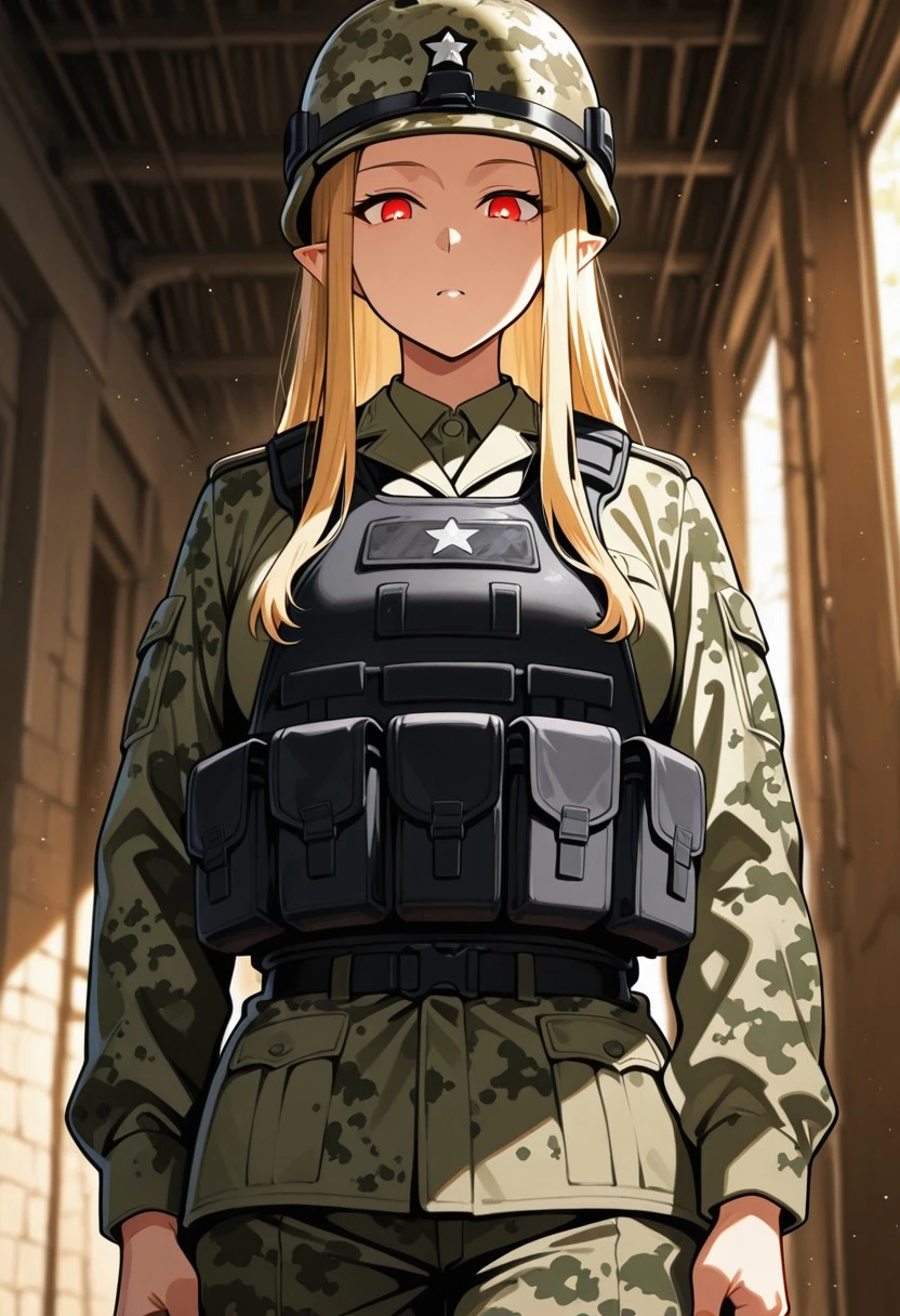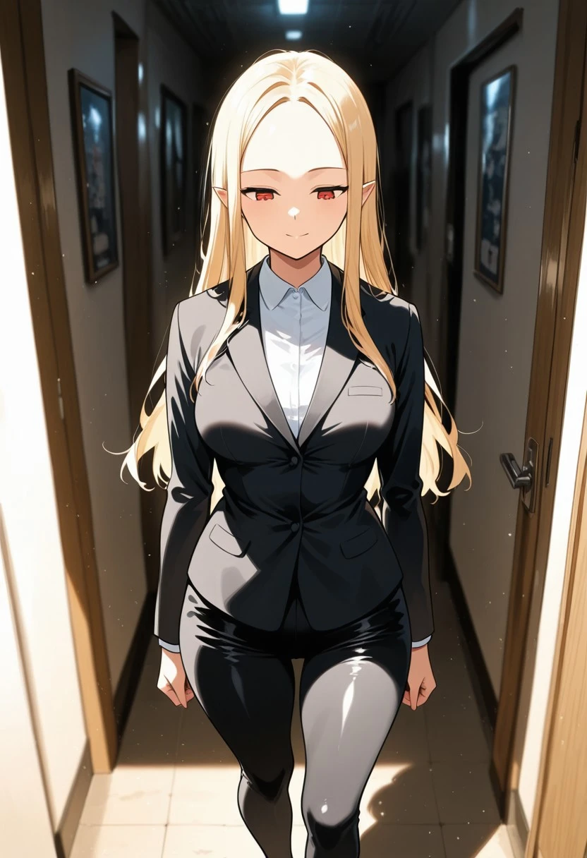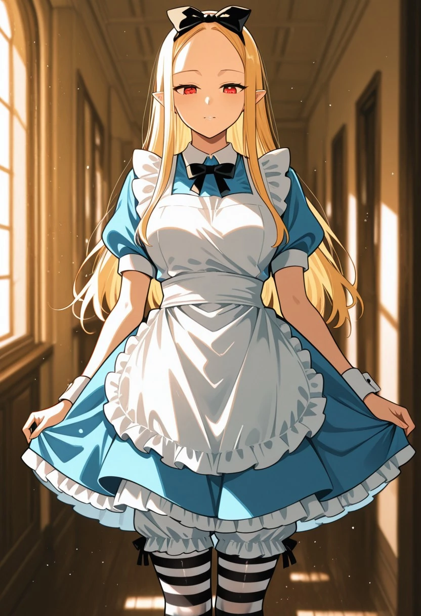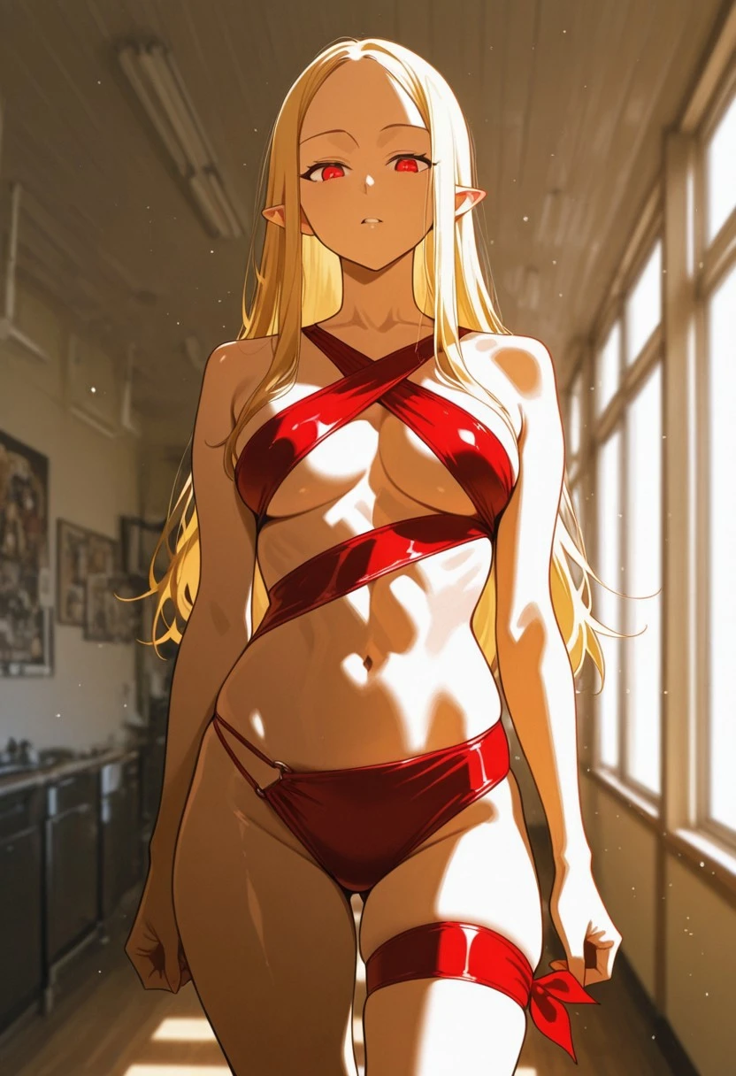 Long, blond hair, pointed ears, high forehead, (red eyes: 1.2),