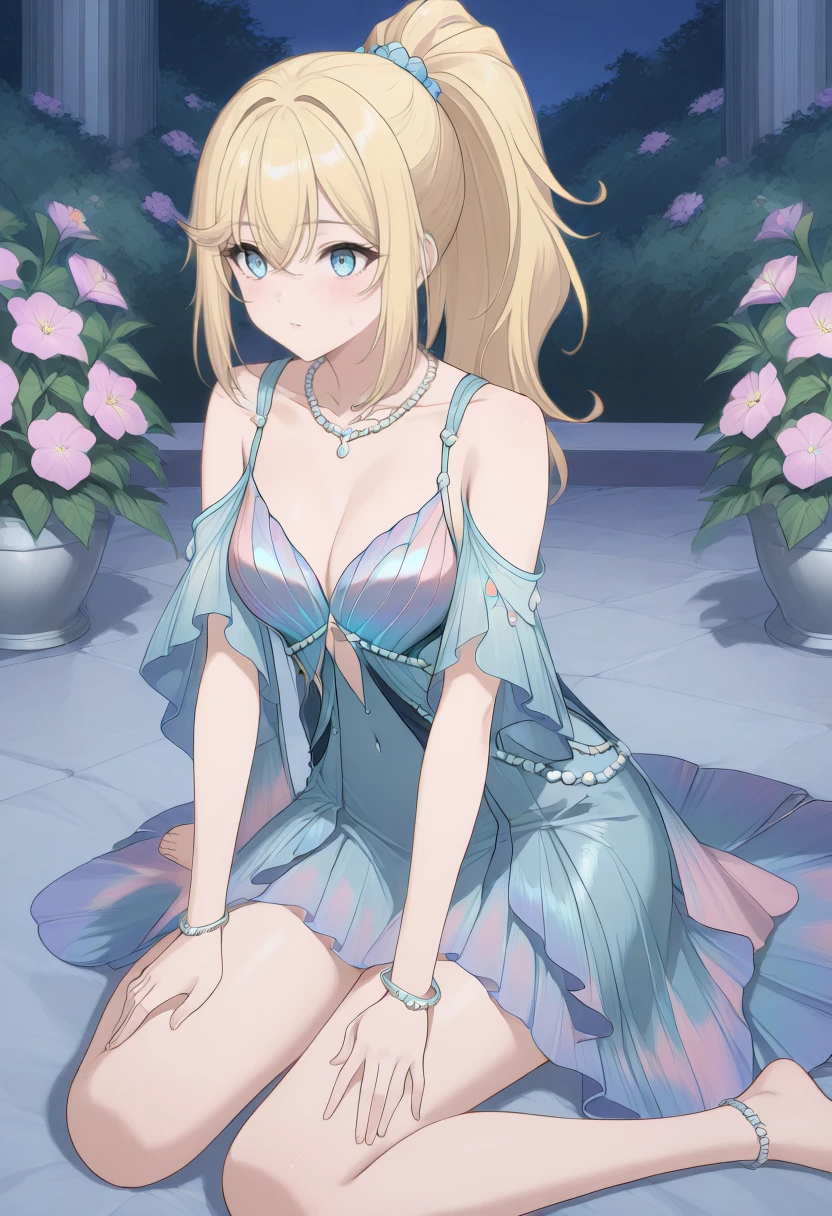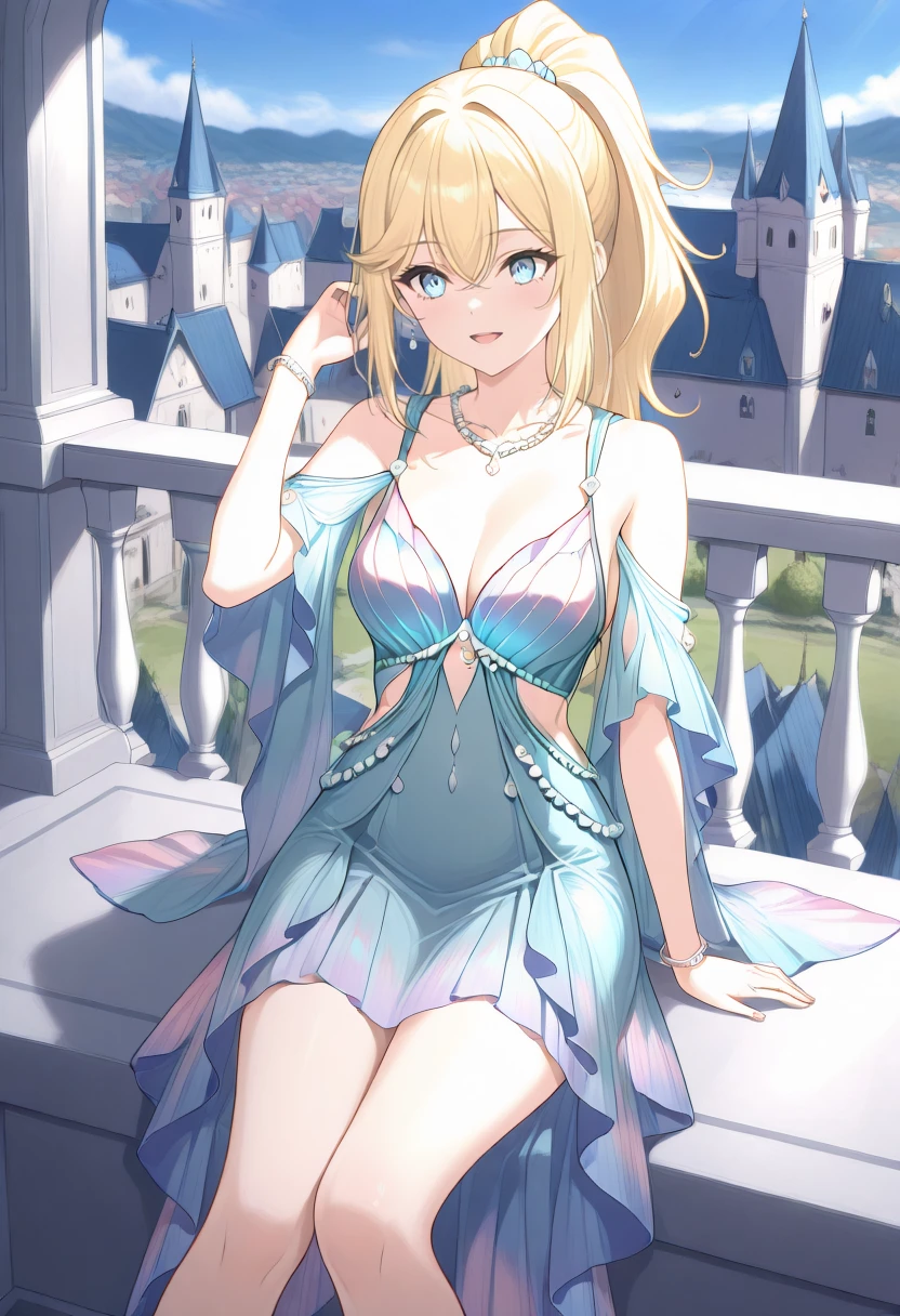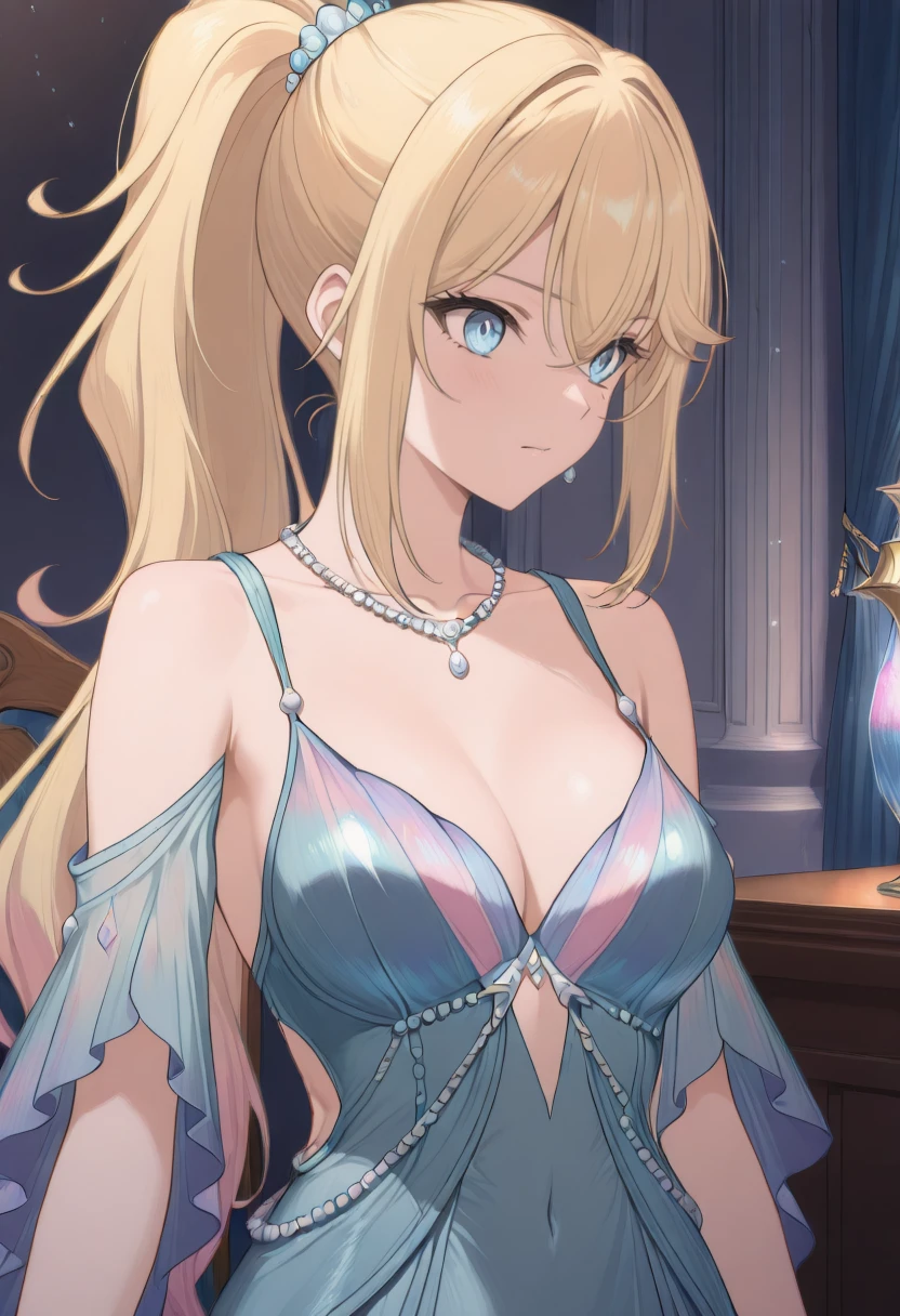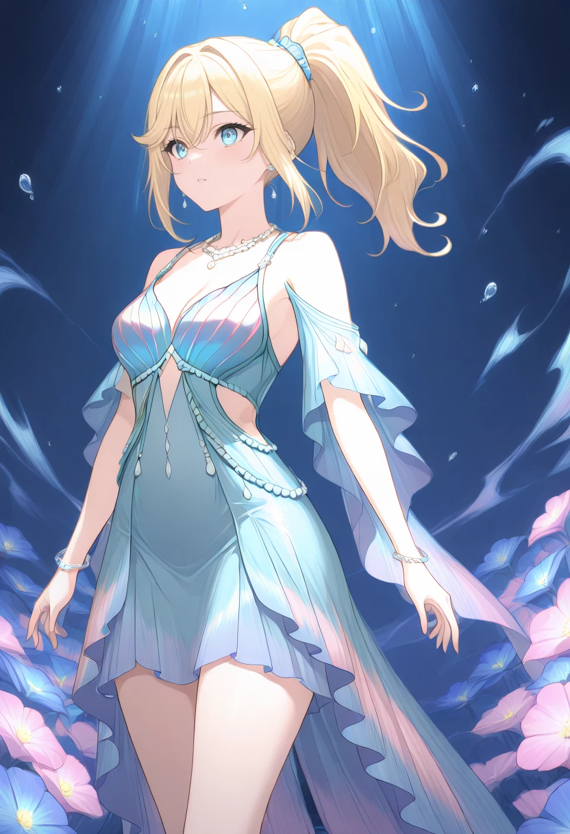 cha19v1,1girl,fantasy,mermaid dress,ombre,blue dress,pink accents,deep cleavage,bare shoulders,off-shoulder sleeves,sheer fabric,flowing sleeves,form-fitting,trumpet skirt,layered skirt,necklace,bracelets,anime screencap,