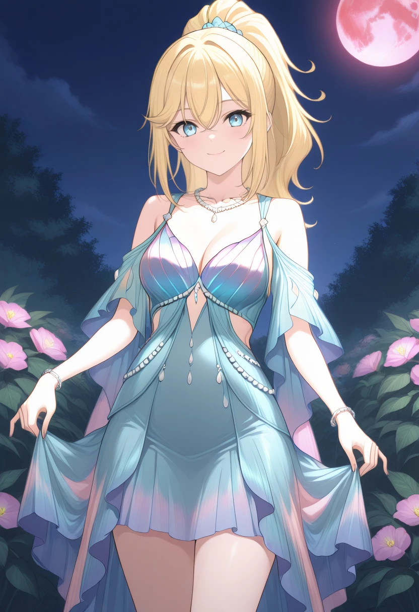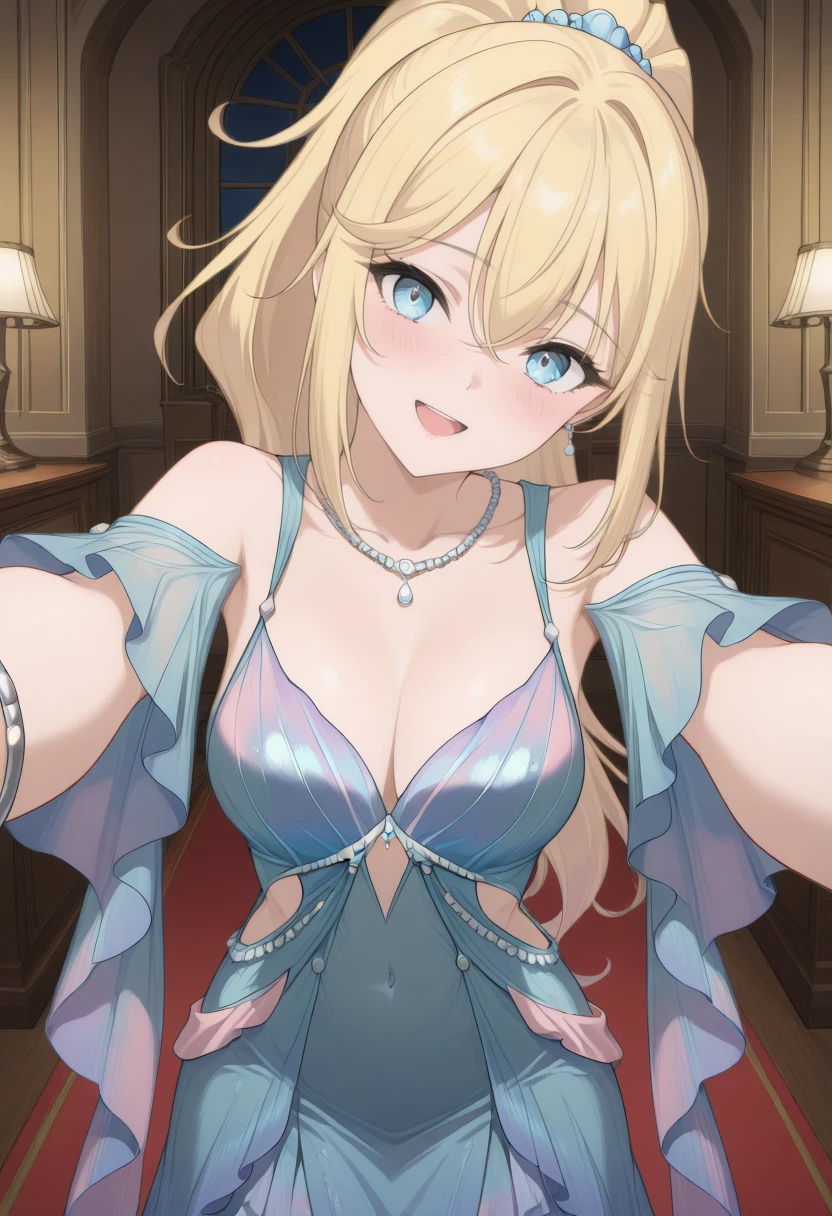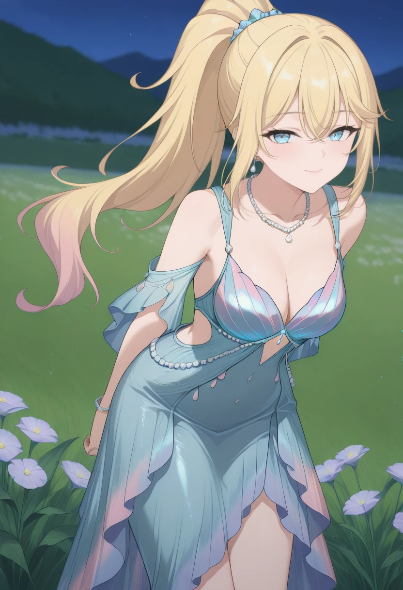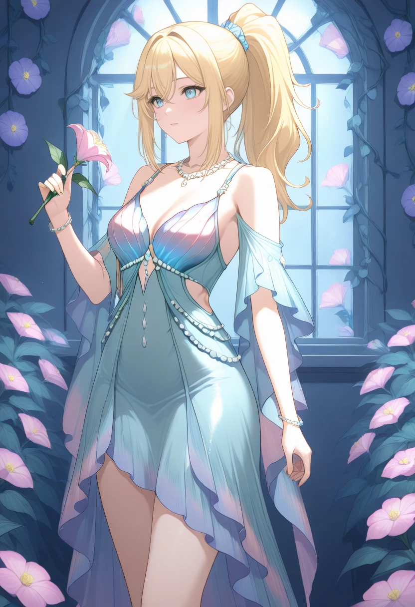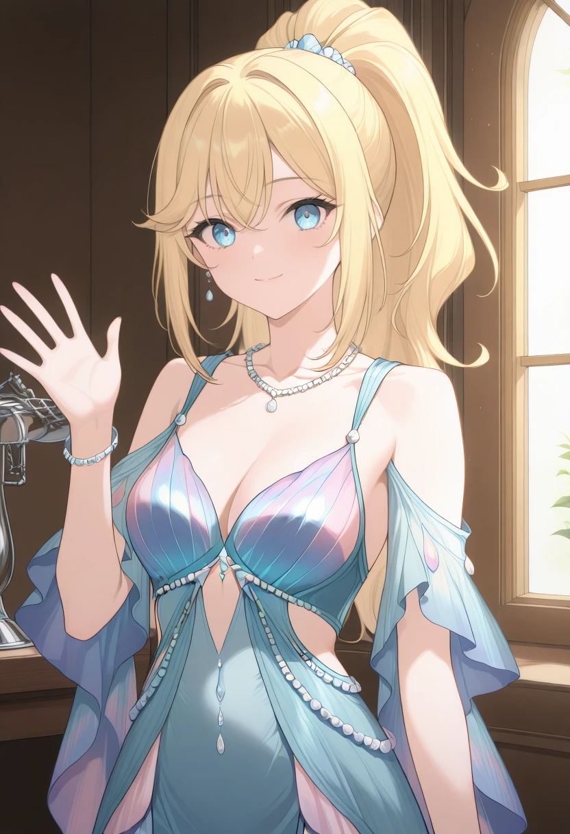 cha19v1,1girl,fantasy,mermaid dress,ombre,blue dress,pink accents,deep cleavage,bare shoulders,off-shoulder sleeves,sheer fabric,flowing sleeves,form-fitting,trumpet skirt,layered skirt,necklace,bracelets,anime screencap,