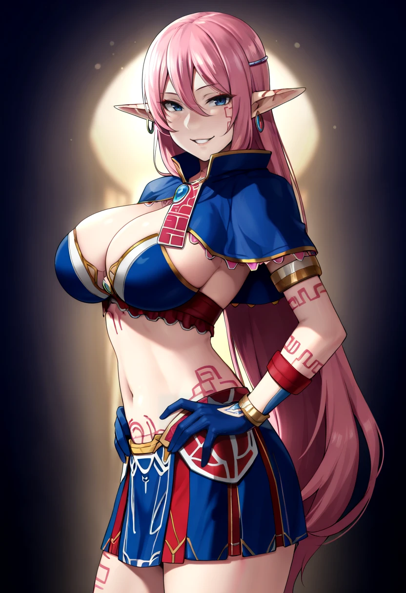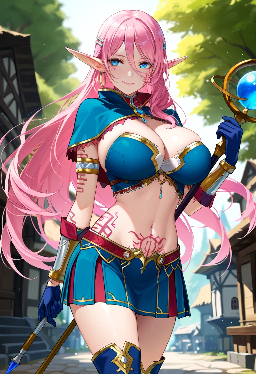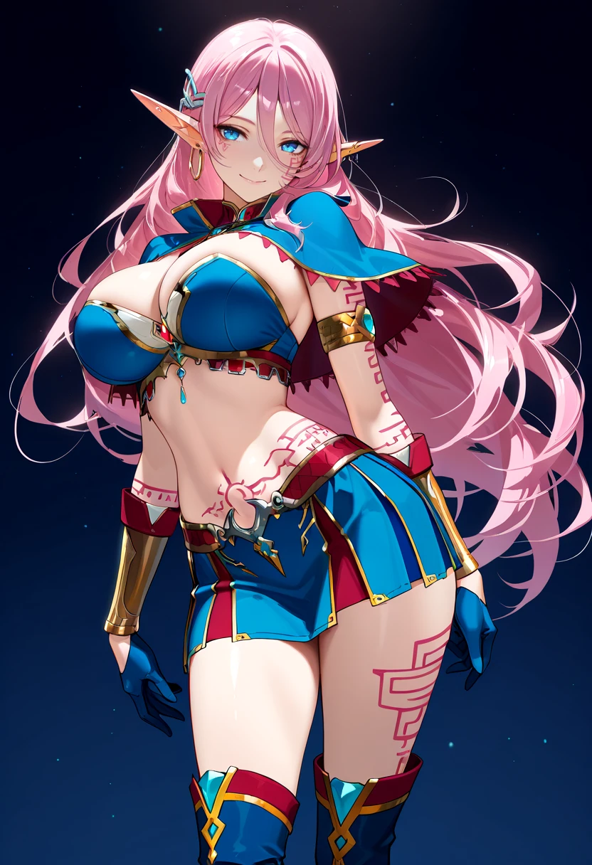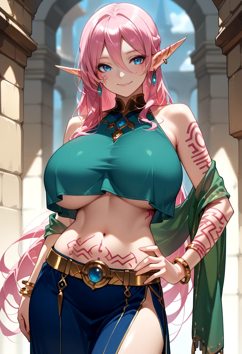 pink hair, blue eyes, elf, pointy ears, very long hair, facial tattoo, arm tattoo, leg tattoo, belly tattoo,