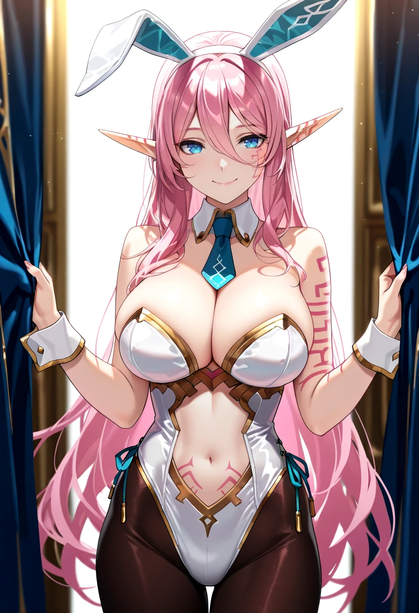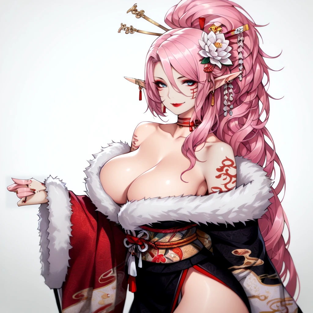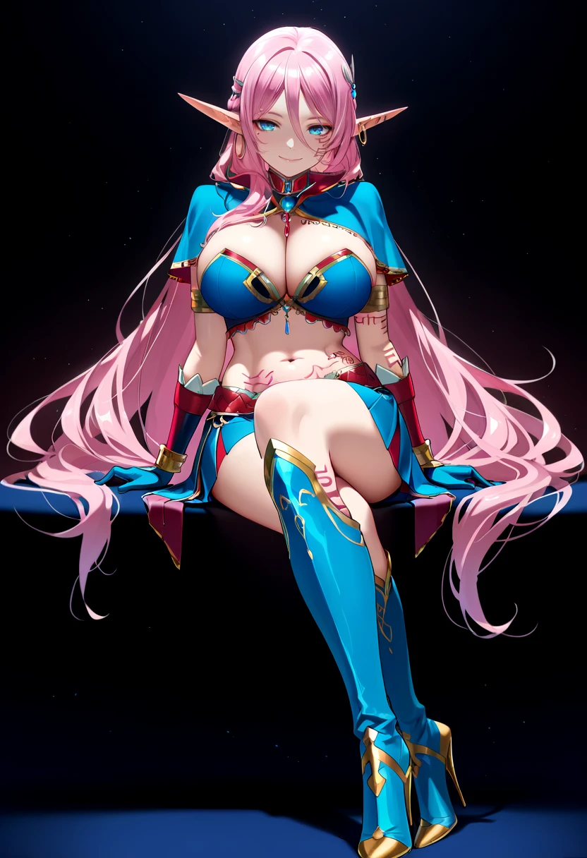 pink hair, blue eyes, elf, pointy ears, very long hair, facial tattoo, arm tattoo, leg tattoo, belly tattoo,