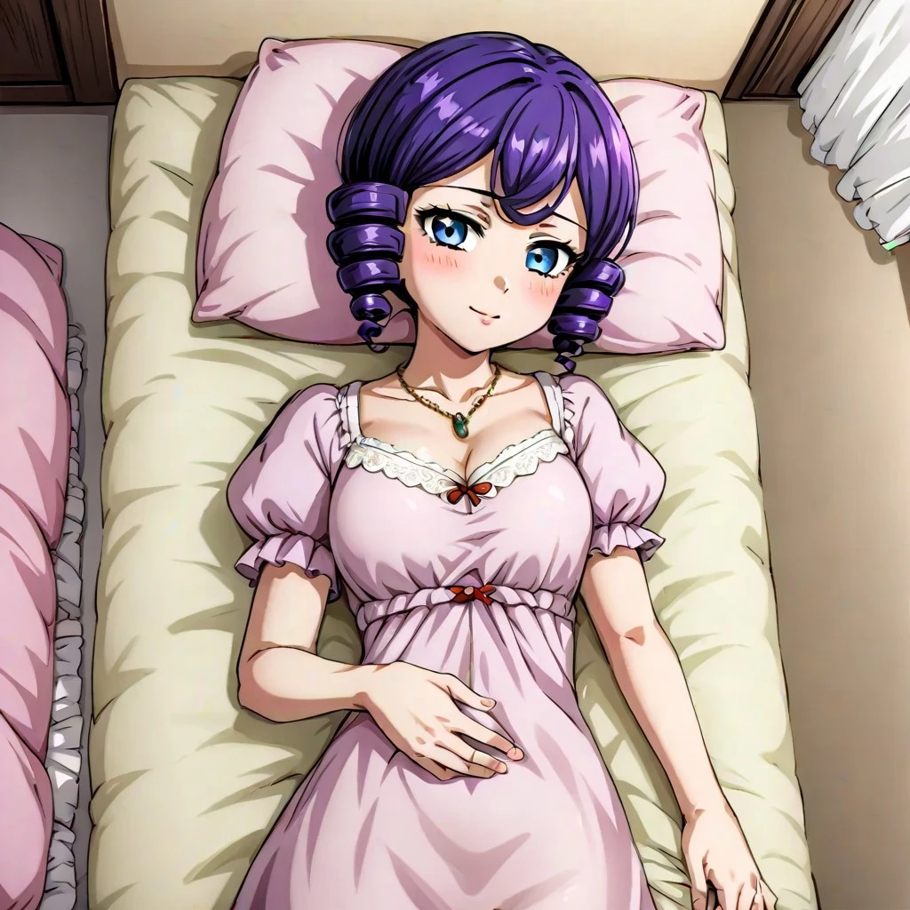 HitomiCMK, 1girl, Purple Hair, blue dress, yellow witch hat, blue eyes, drill side locks, short blue dress, short poofy sleeves, boots, necklace