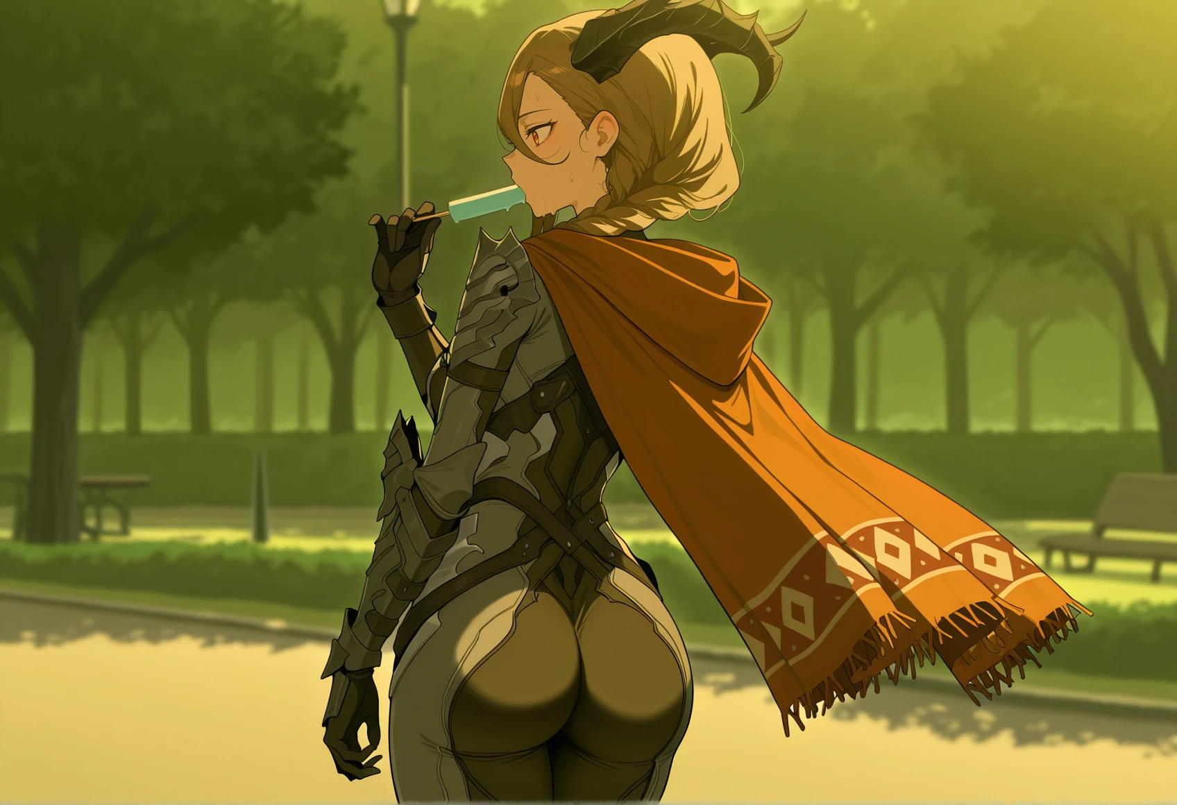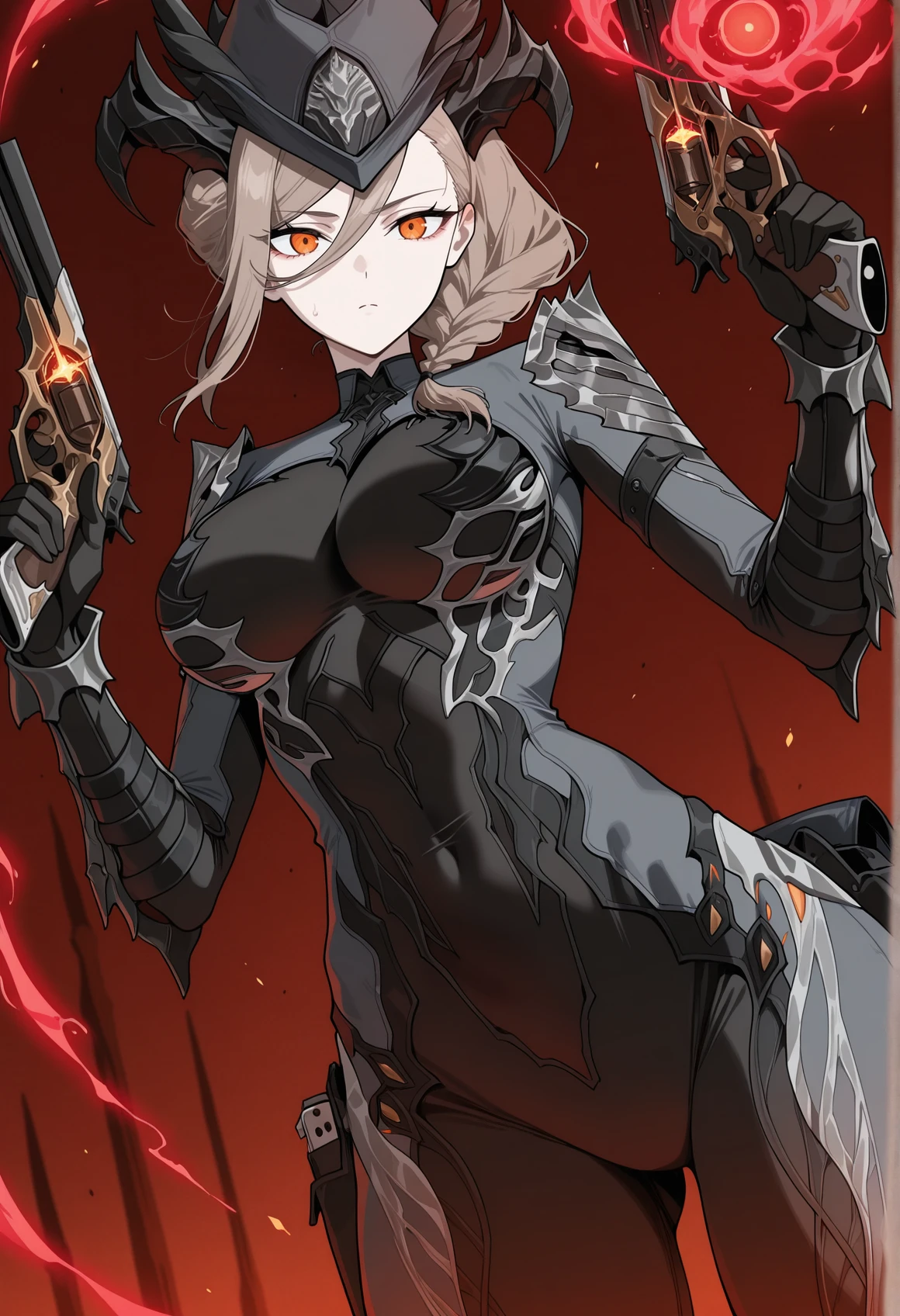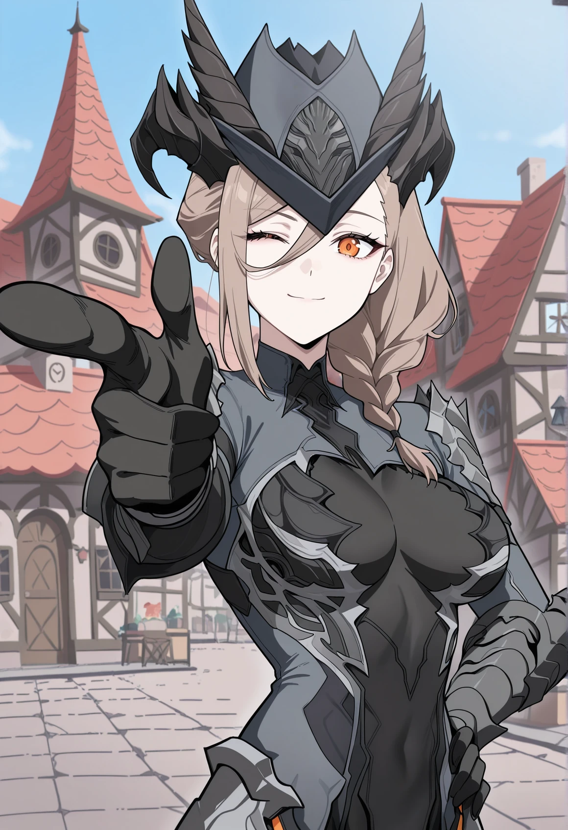 brown hair, braid, hair between eyes, single sidelock, horns, hat, armored bodysuit, gauntlets