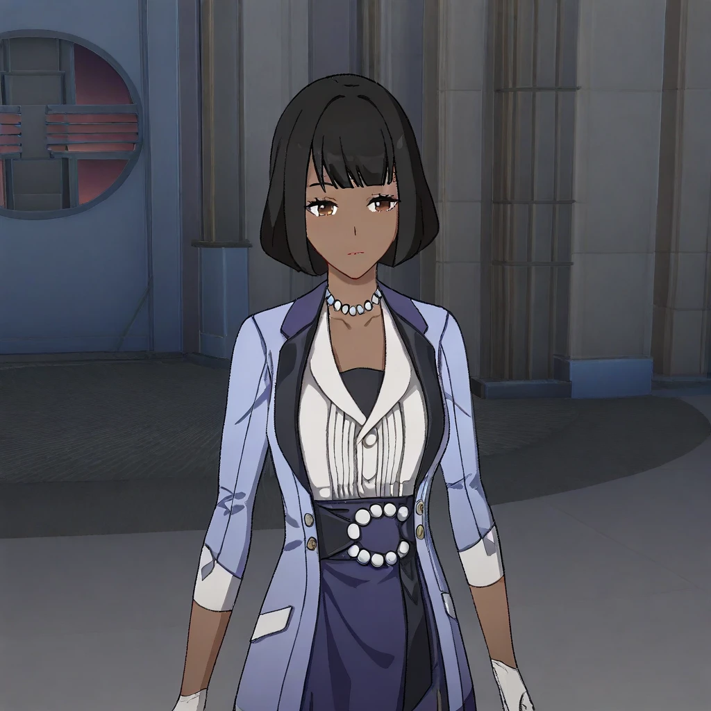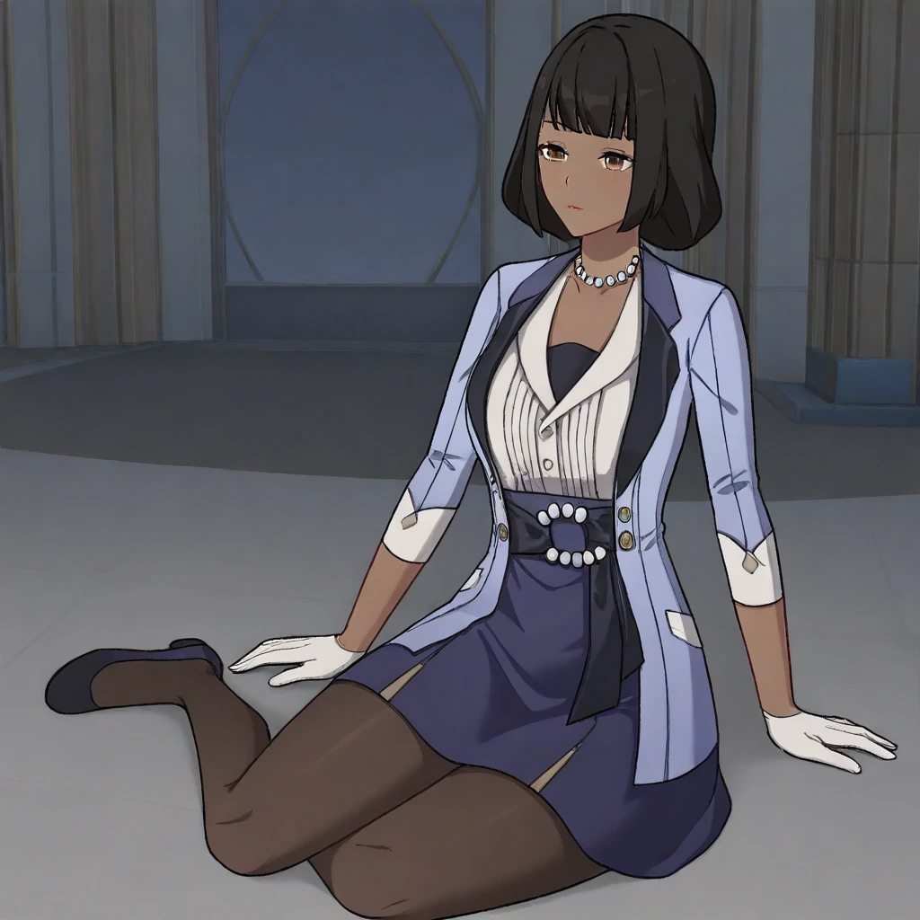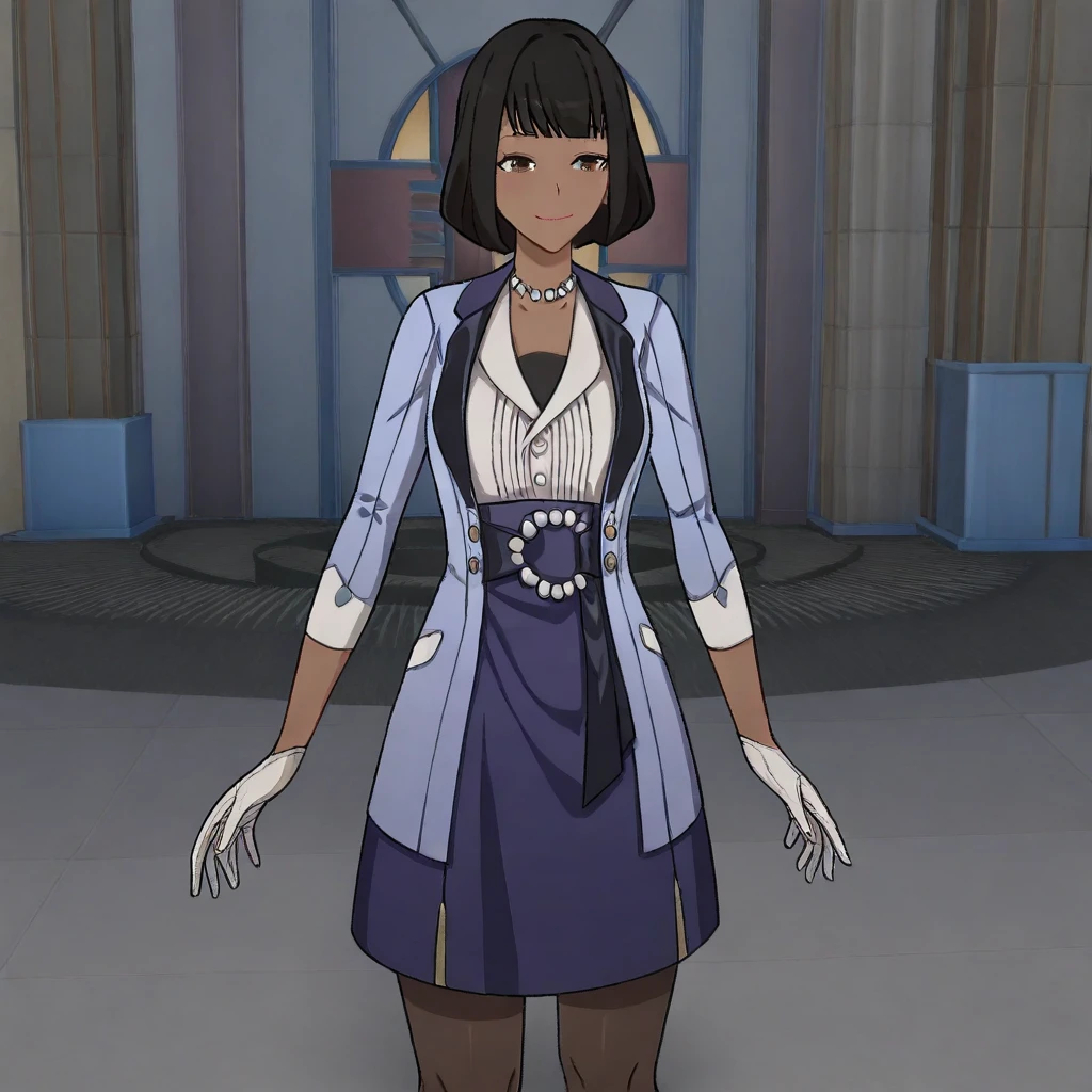 CoconaHSR, 1girl, solo, dark skin, dark-skinned female, black hair, short hair, bangs, bob cut, brown eyes, lips, pearl necklace, large breast, light blue jacket, white shirt, blue skirt, white gloves, brown pantyhose, thick thighs, shoes, white cuffs, jewelry,
