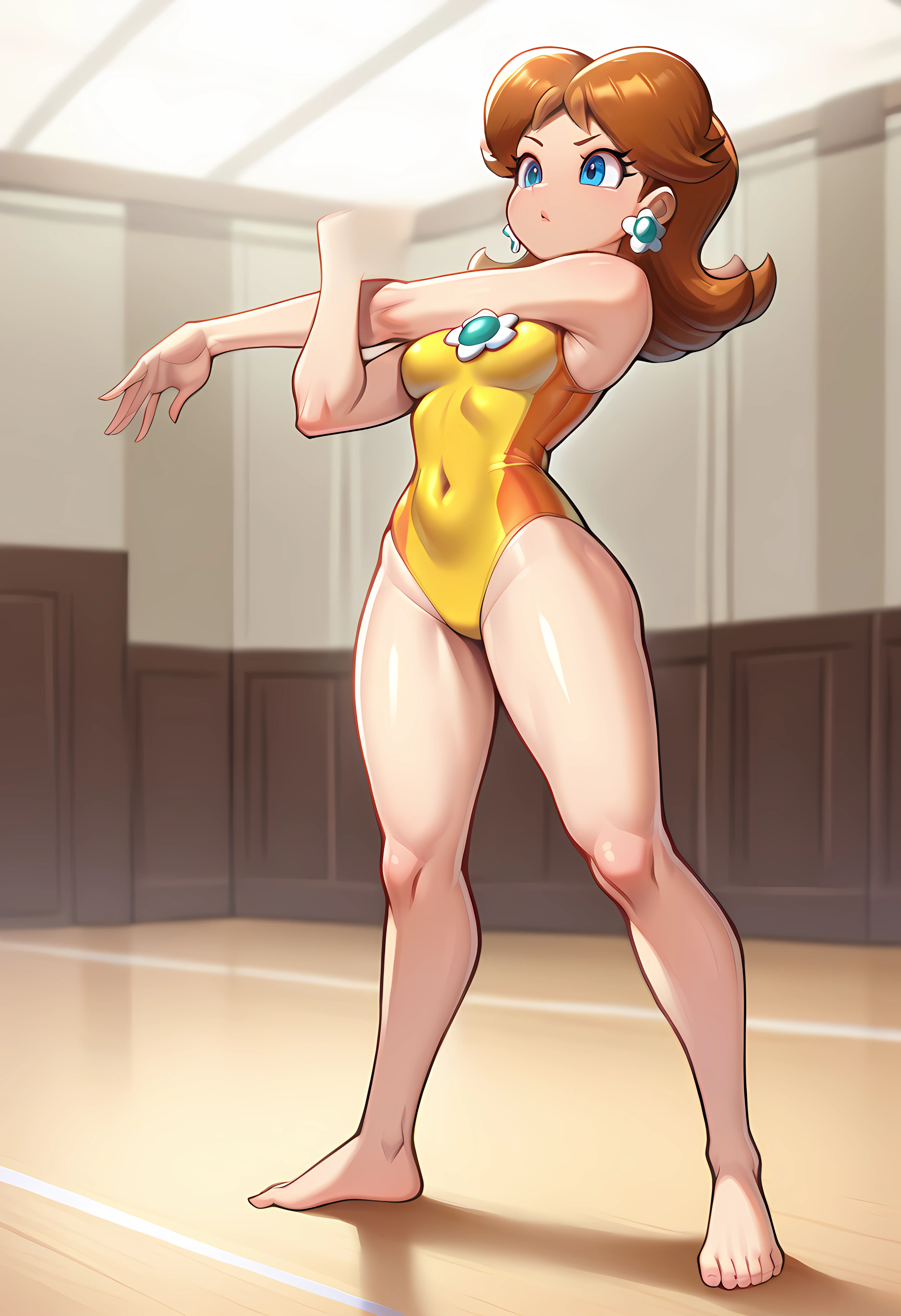Leotard: D41syL30, princess daisy, brown hair, flipped hair, blue eyes, yellow leotard, two-tone leotard, bare legs, bare arms, flower brooch, covered navel