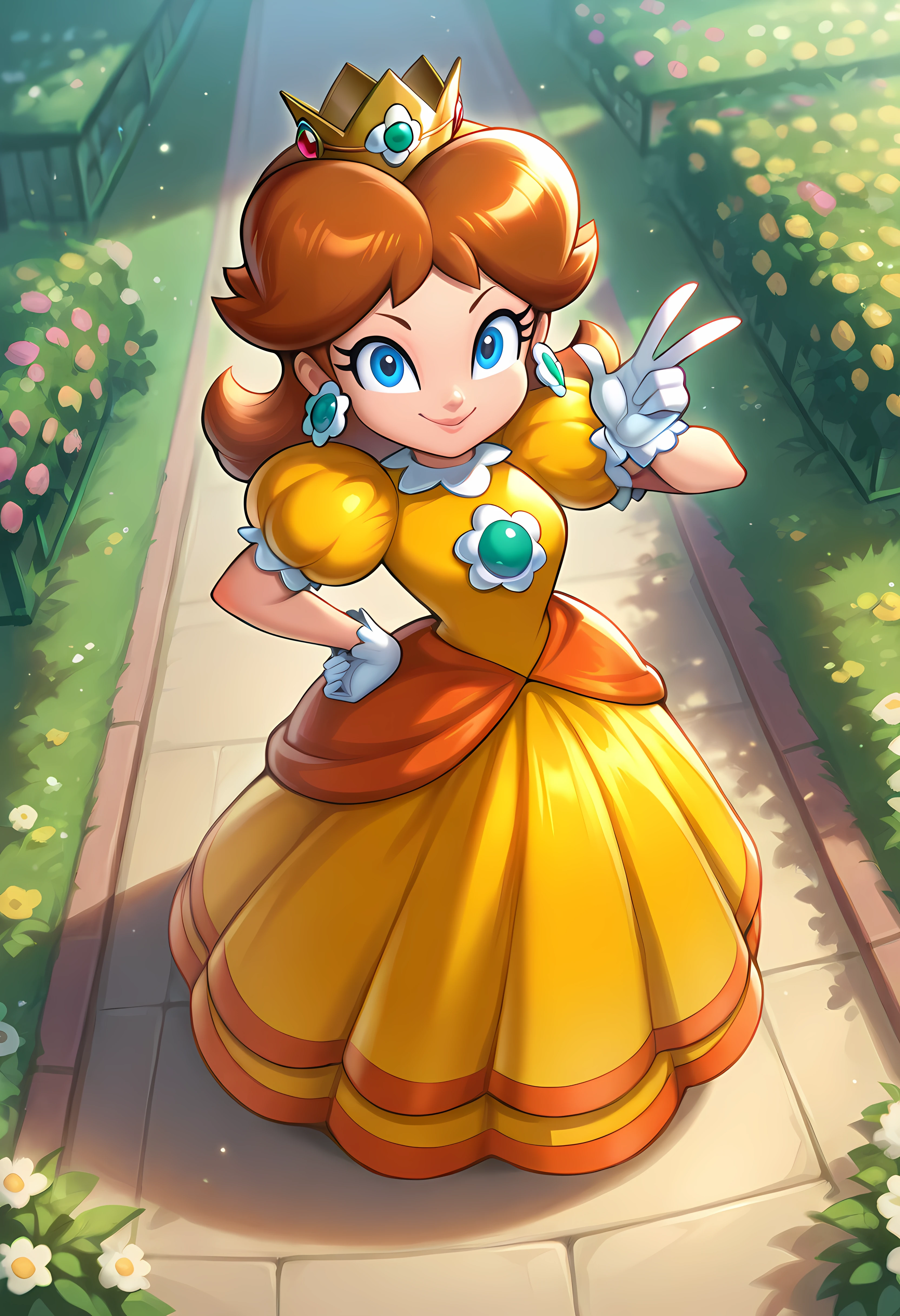 Default: D41syD3f, princess daisy, brown hair, flipped hair, blue eyes, frilled orange dress, short puffy sleeves, white frilled gloves, brooch, crown, flower earrings
