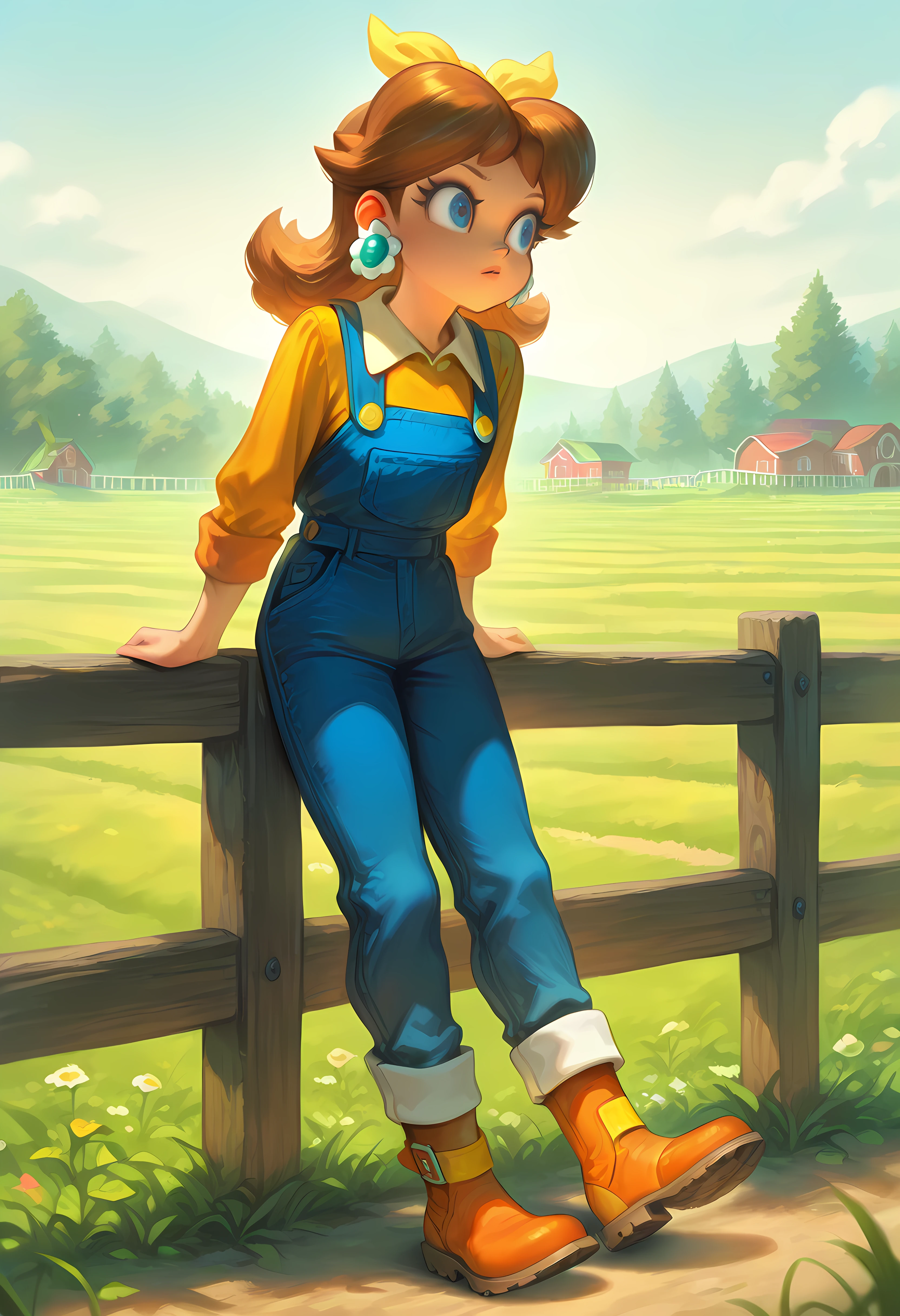Farmer: D41syF4rm, princess daisy, brown hair, flipped hair, blue eyes, orange collared shirt, blue overalls, yellow bow, boots