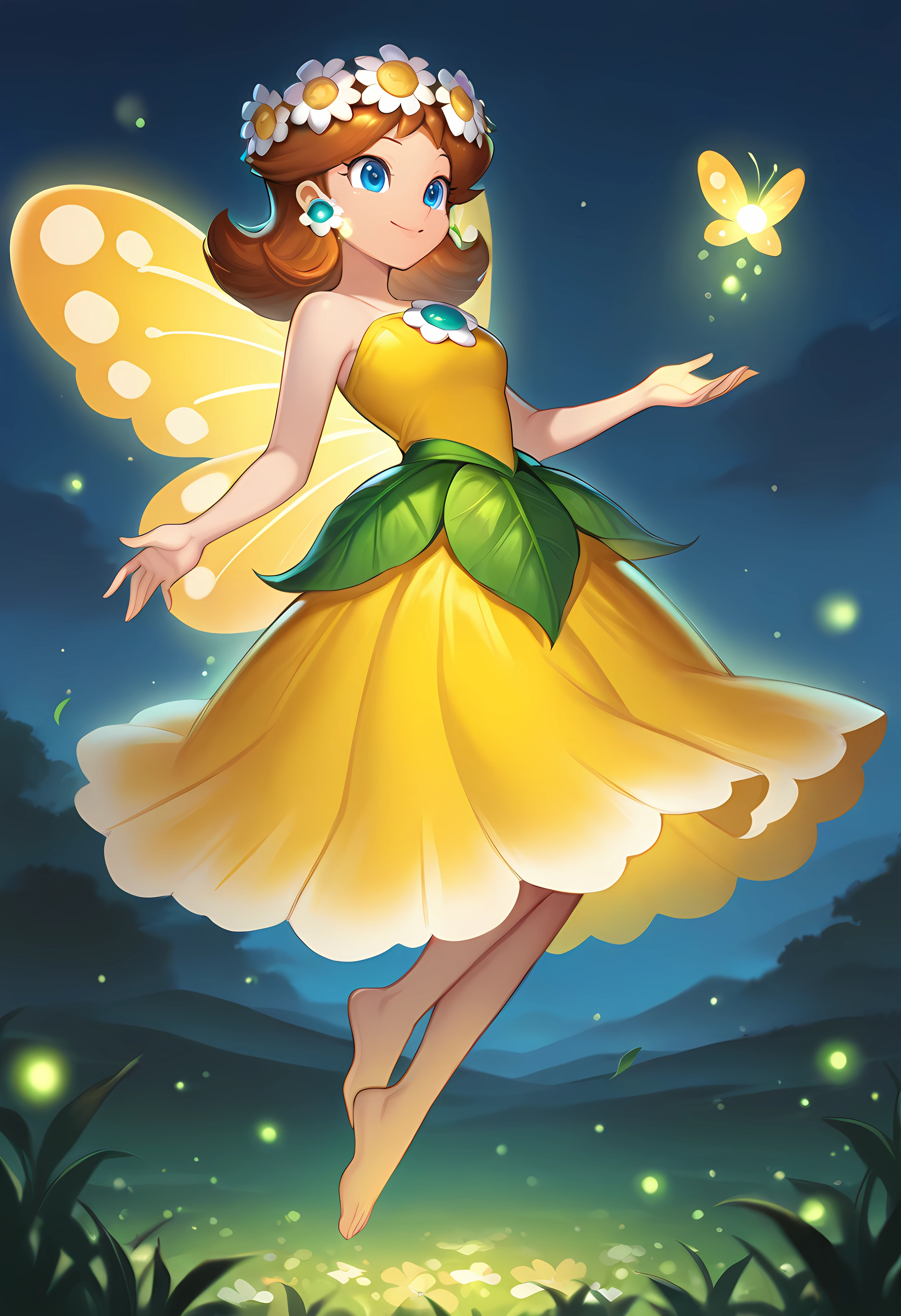 Fairy: D41syF41ry, princess daisy, brown hair, flipped hair, blue eyes, yellow petal dress, leaf overskirt, head wreath, hair flower, fairy wings