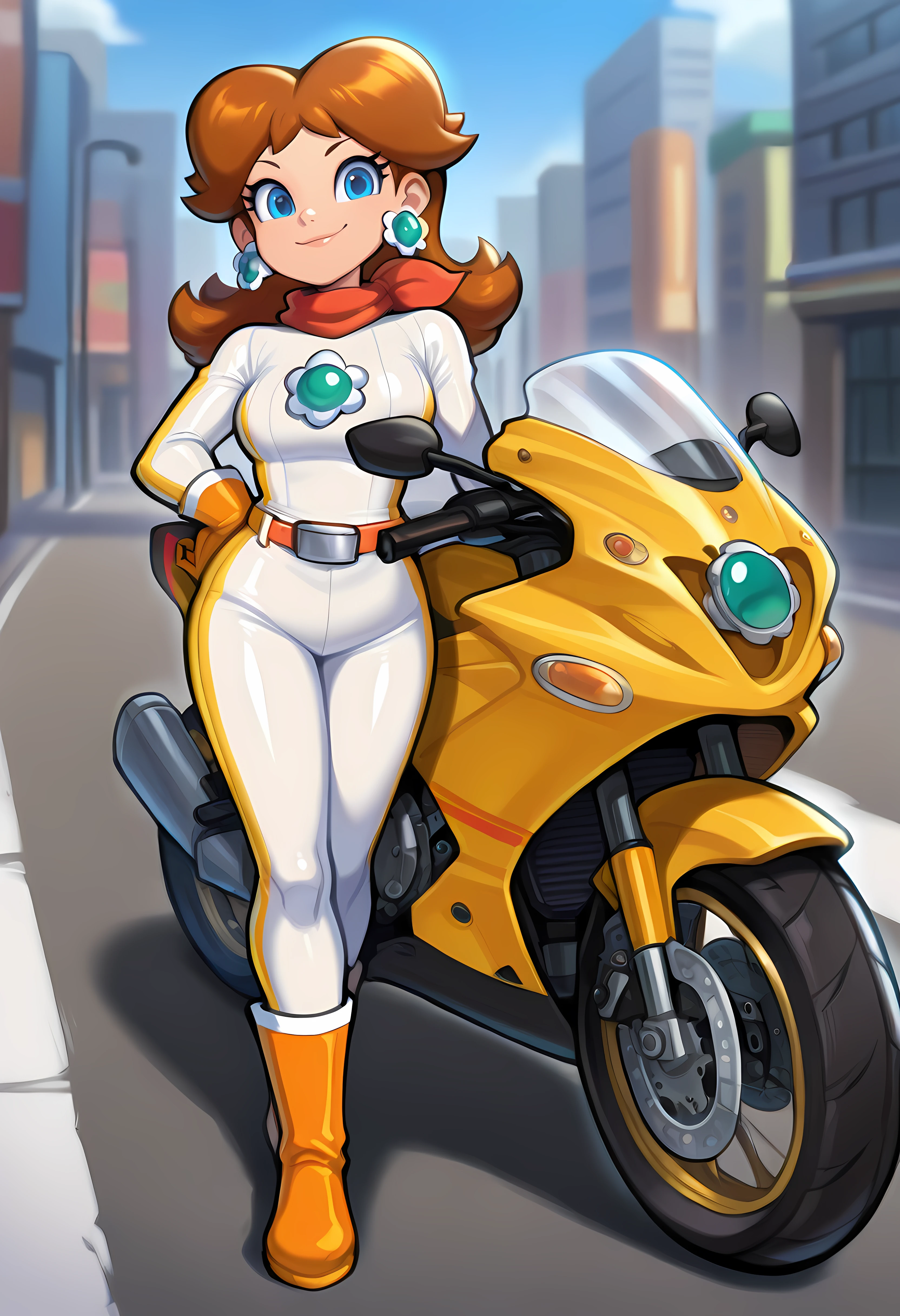 Aero: D41syA3r0, princess daisy, brown hair, flipped hair, blue eyes, white bikesuit, orange gloves, orange boots, belt, scarf, brooch