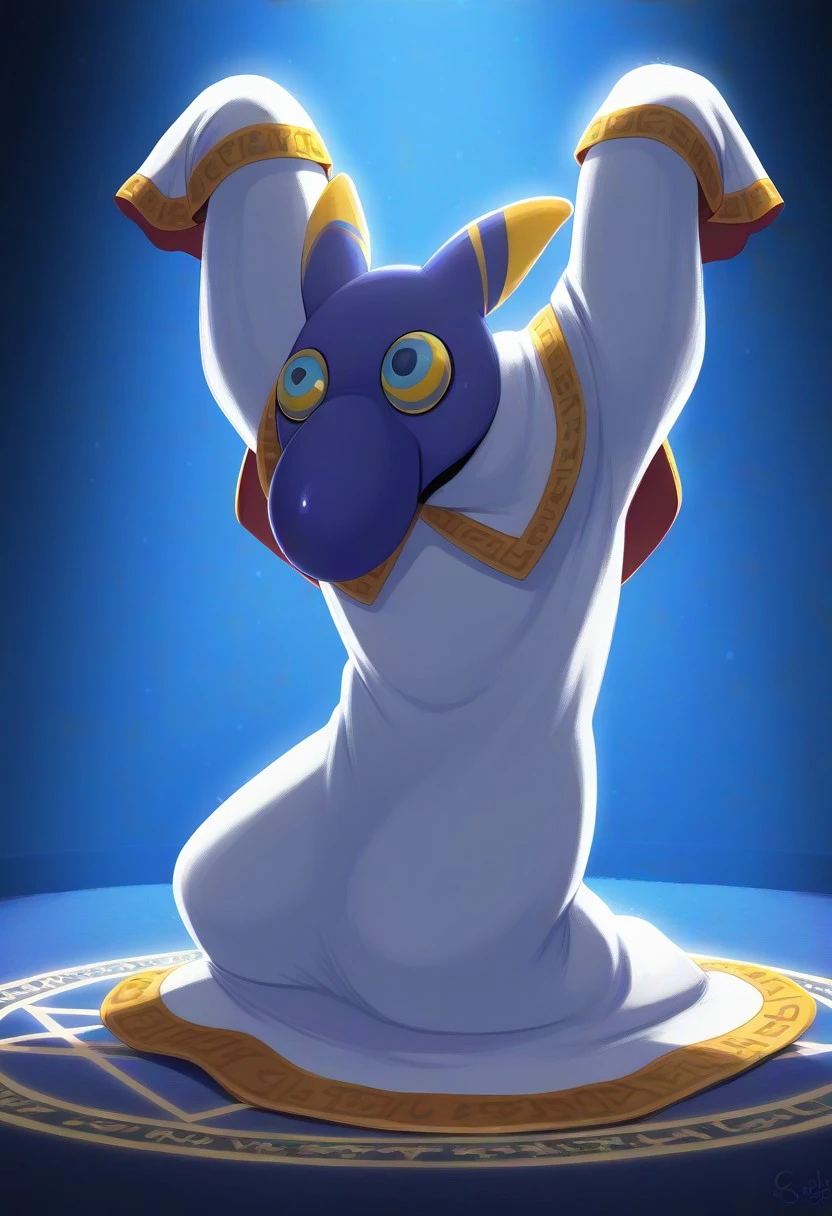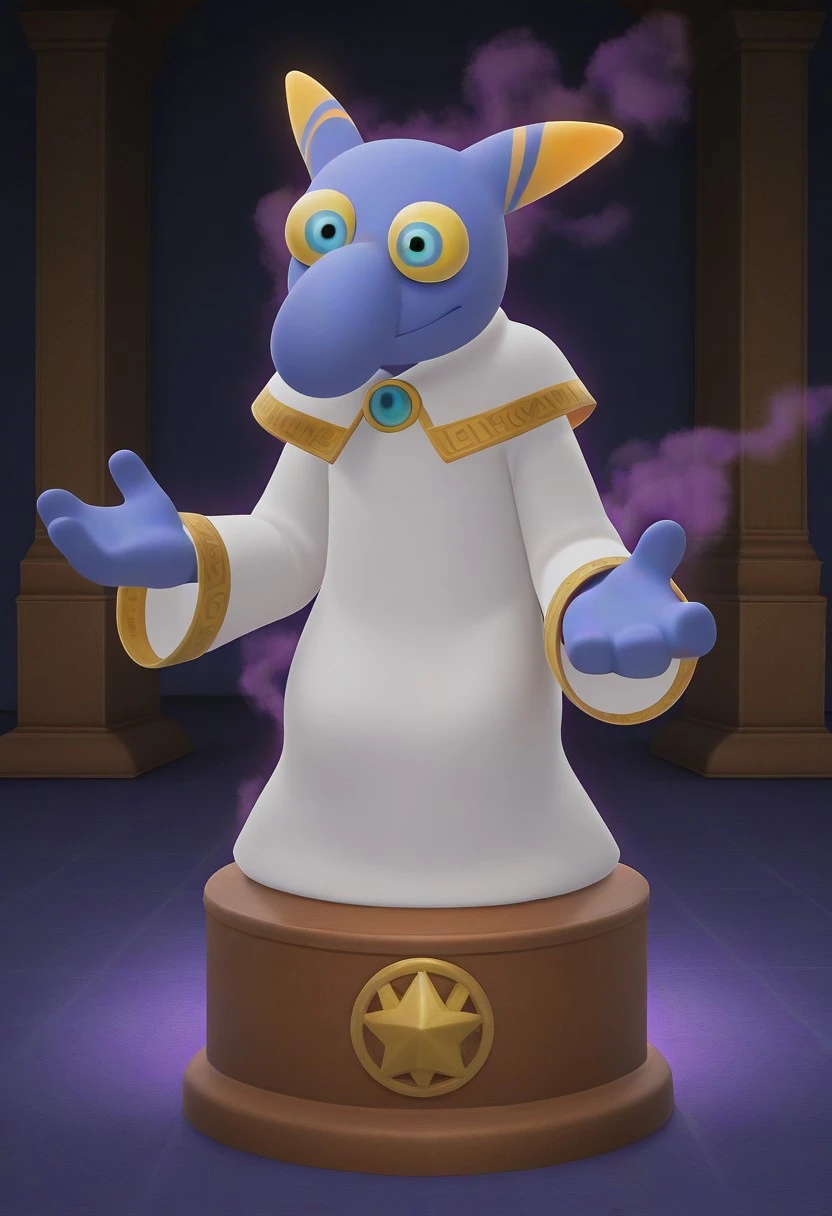 Hyness, blue skin, spiraled yellow sclera, blue pupils, big nose, spiky yellow ears, white robes, gold outer lining on robe, long sleeves