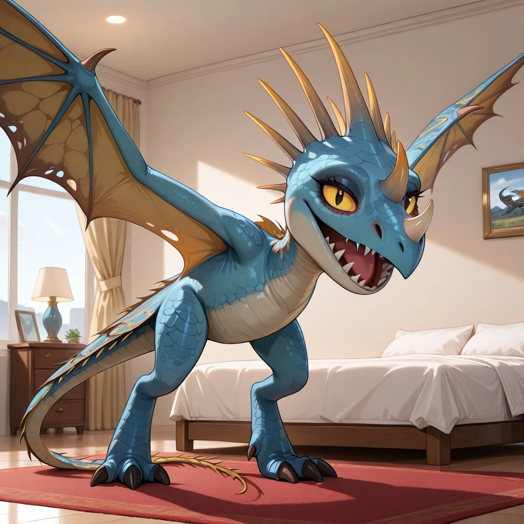 Stormfly/Deadly Nadder from the series How to train your Dragon. A mix of SFW and NSFW pictures were used, especially screen caps from the movies and series. Most pictures were however trained on Stormfly so there will be a bias in generation probably.