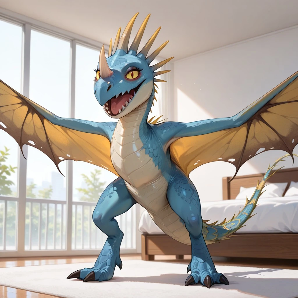 Prompts for Stormfly: Stormfly_httyd, female, blue scales, yellow sclera