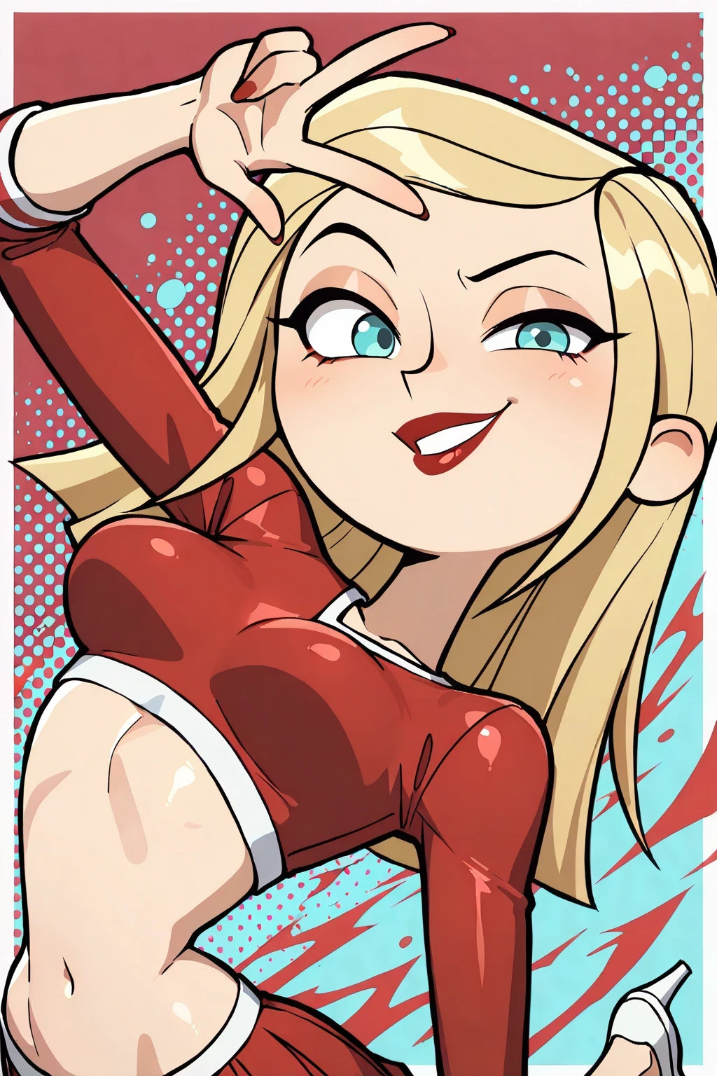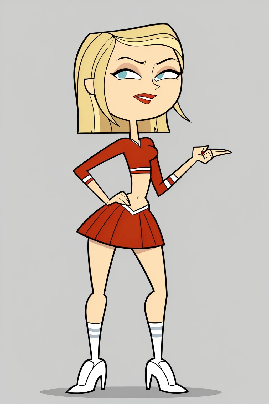 SammyTDPI, 1girl, red cheerleader suit, midriff, white shoes, light blonde hair, turquoise blue eyes, red lips, lipstick, white high heels, samey (tdi)