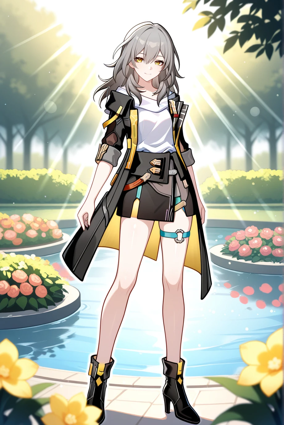 <lora:HonkaiStelle-IL-08:0.9>, ChopioStelle, long hair, grey hair, shiny hair, hair between eyes, yellow eyes, looking at viewer, stelle (honkai: star rail), black outline,
