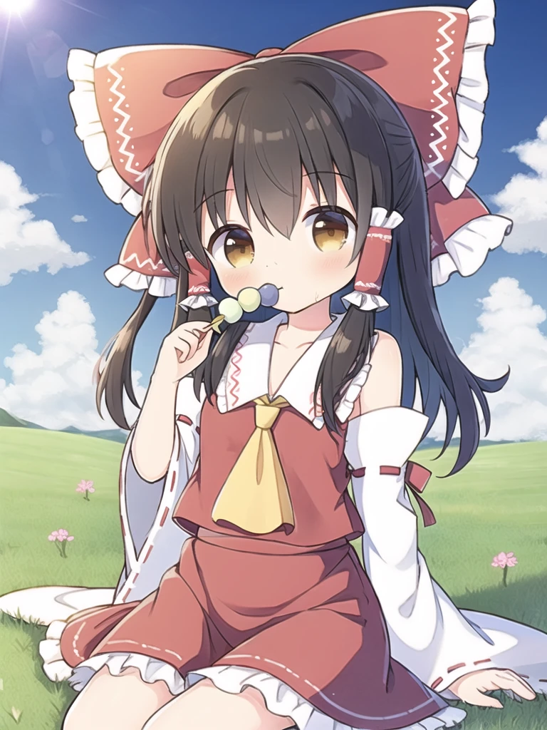 1girl, solo, hakurei reimu, brown eyes, bangs, big hair frilled bow, frilled hair tubes