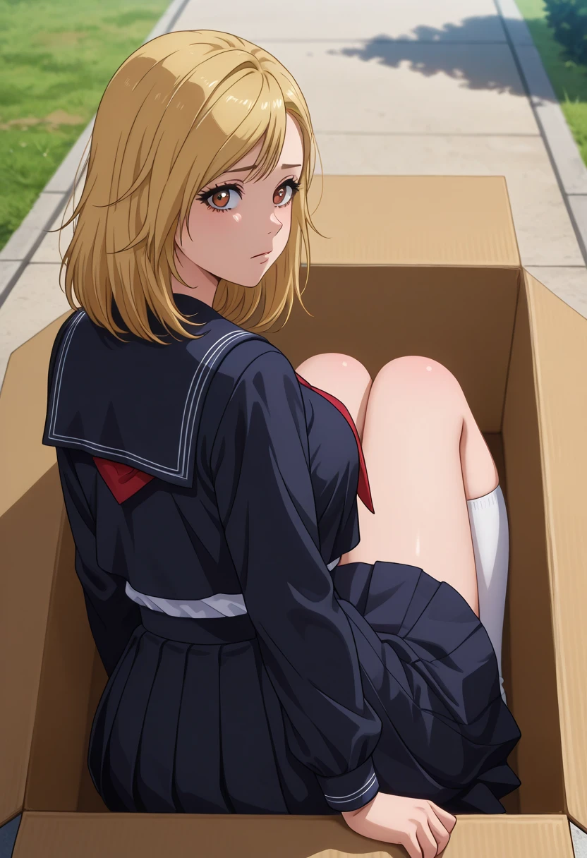 school uniform, black serafuku, black sailor collar, red neckerchief, black shirt, shirt under shirt, white shirt, shirt tucked in, shirt overhang, long sleeves, black pleated skirt, white kneehighs, loafers,