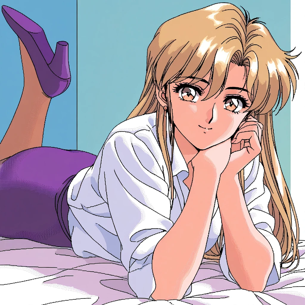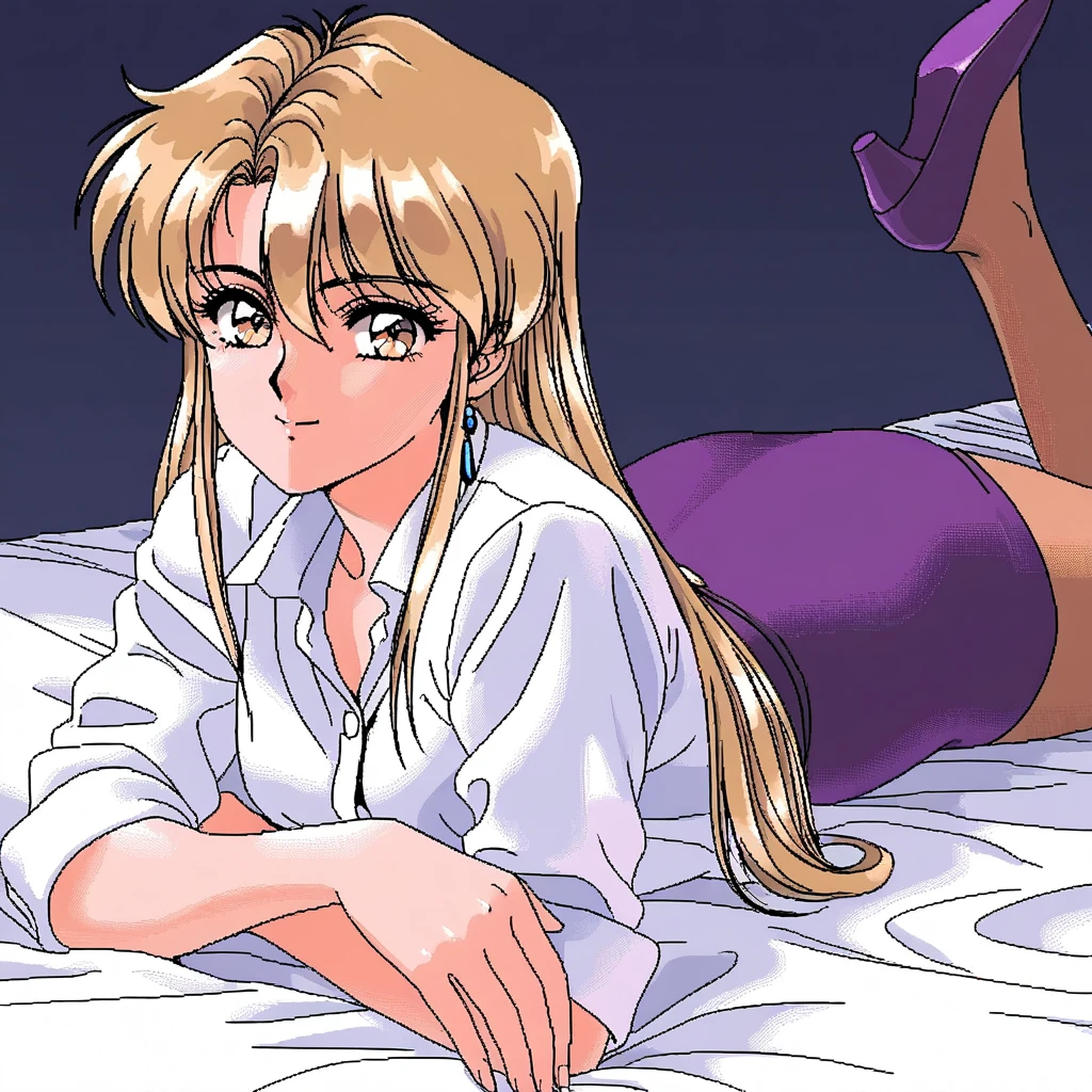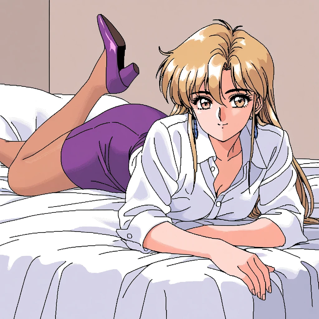 skirt,pantyhose,pencil skirt,shirt, high heels,purple skirt,white shirt, sleeves rolled up, purple footwear