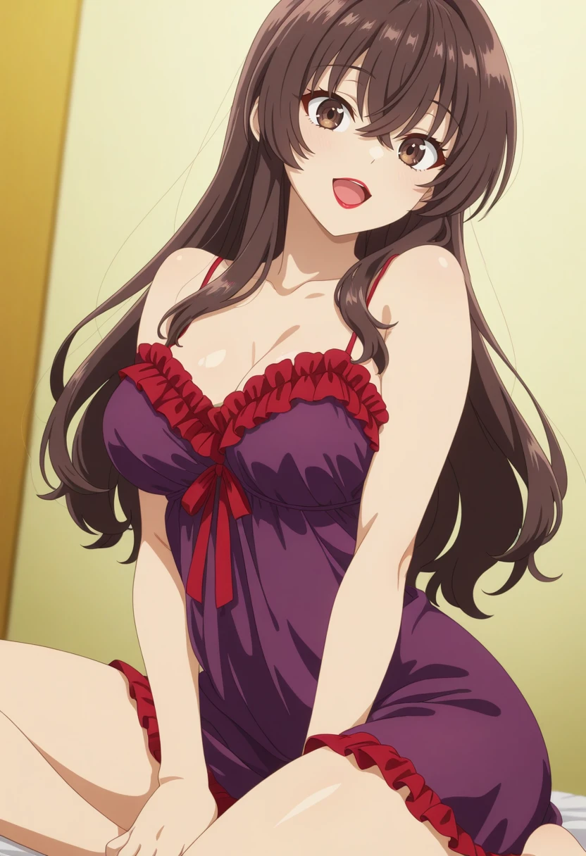 purple dress,nightgown,babydoll,short dress,sleeveless dress,bare shoulders,bare arms,spaghetti strap,frills,barefoot, red frills,frilled neckline,🚫 License and Use: