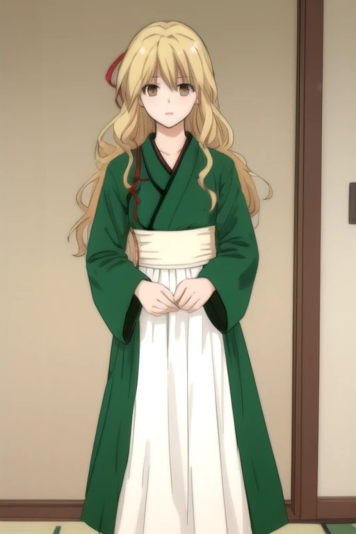 TetoraYona, 1girl, solo, long hair, blonde hair, brown hair, long sleeves, green dress, hanfu