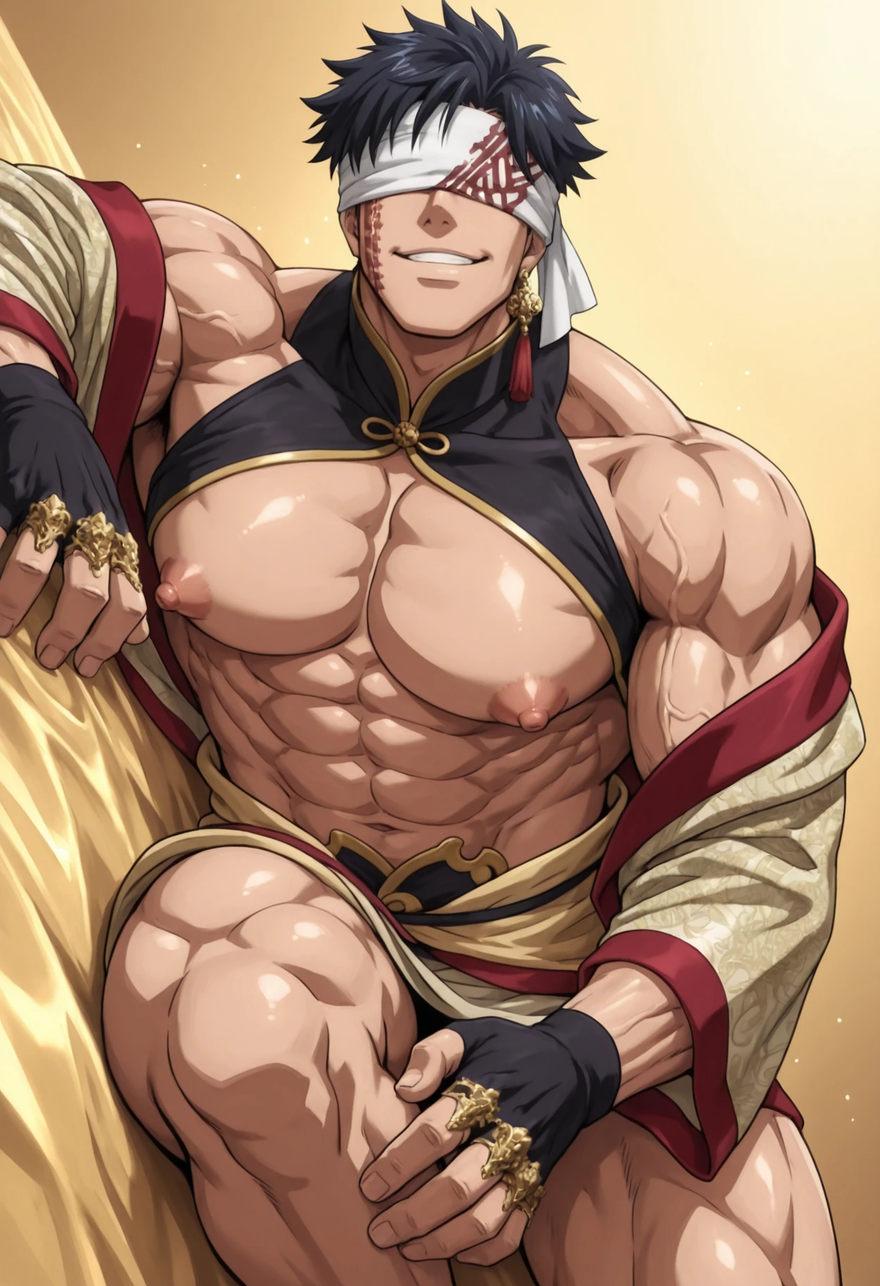 Mature male, manly, Black hair, blindfold, tattoo, jewelry, earrings, fingerless gloves, Chinese shawl,
