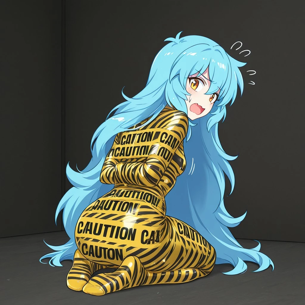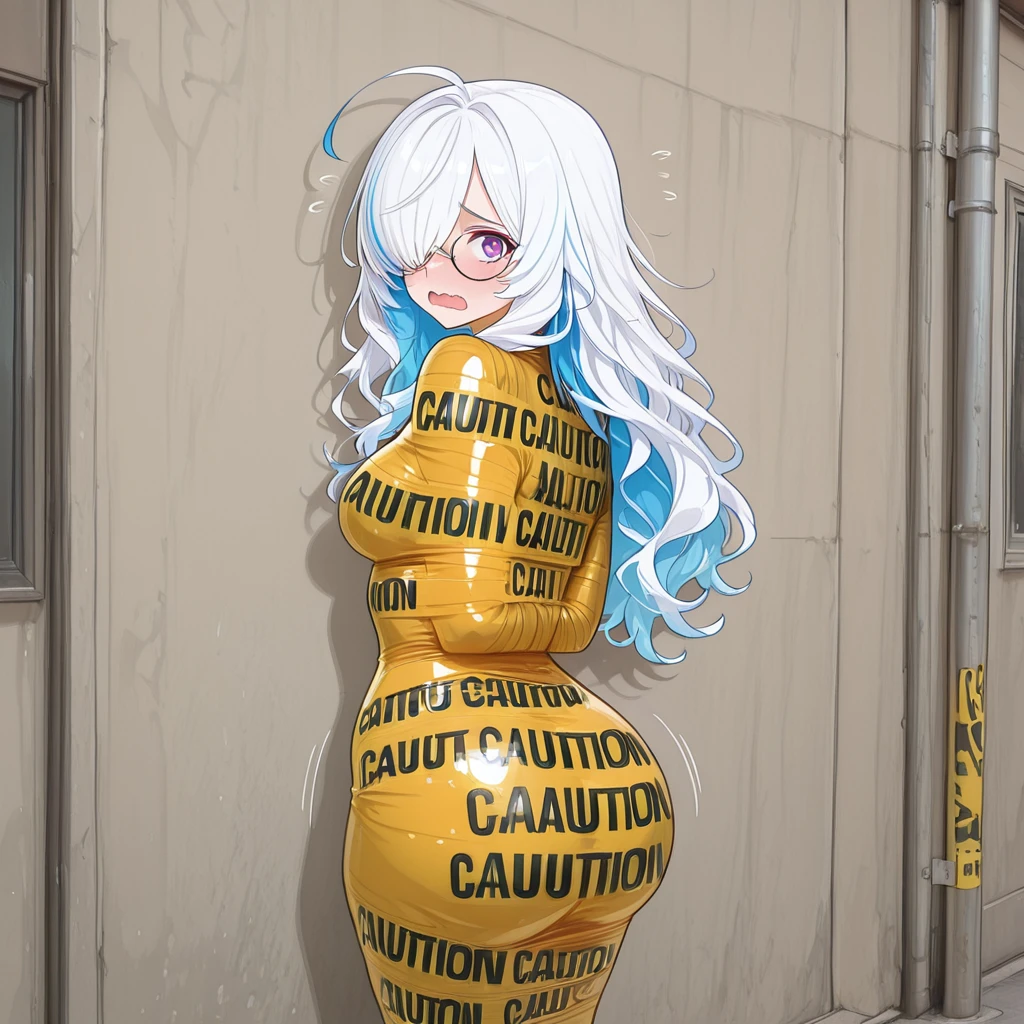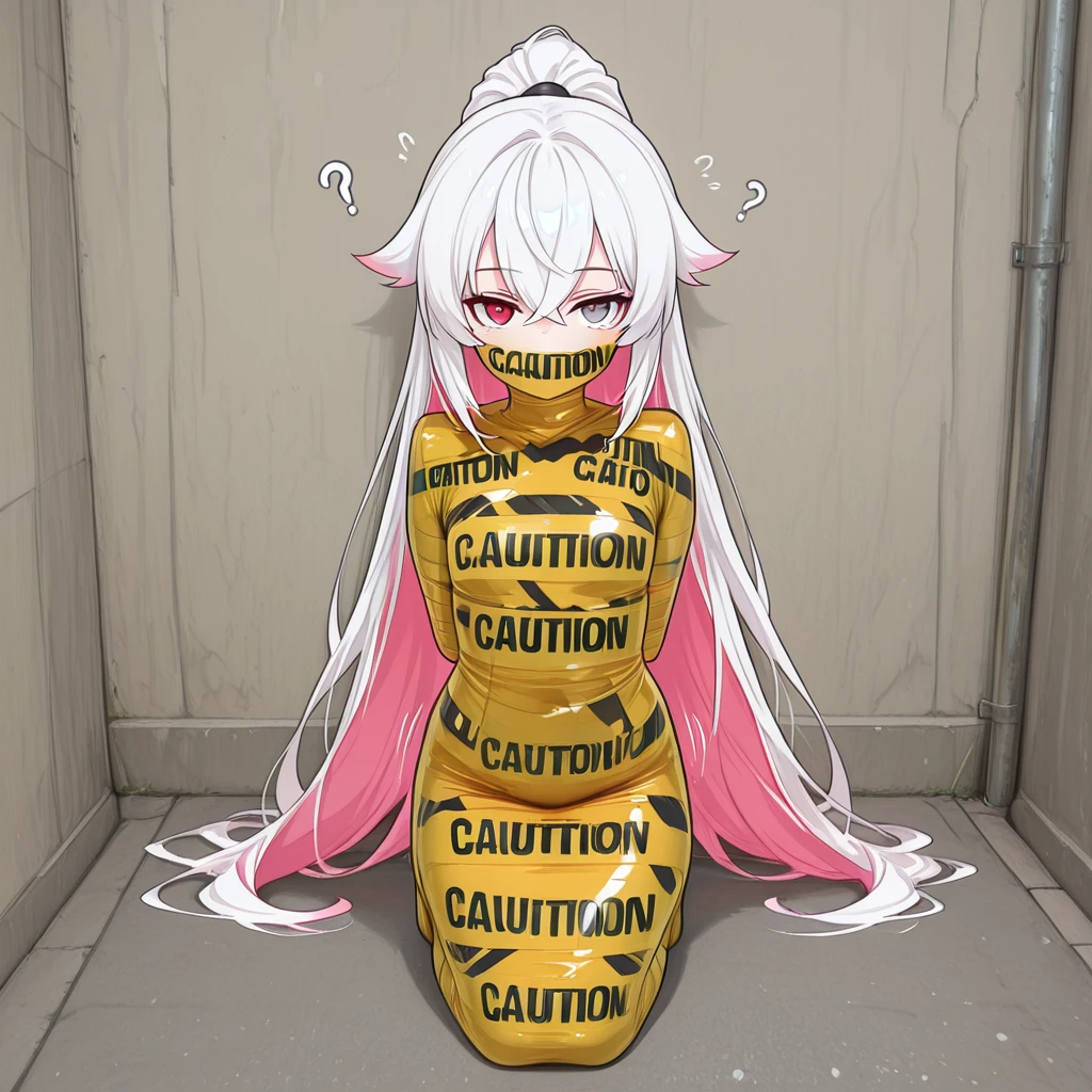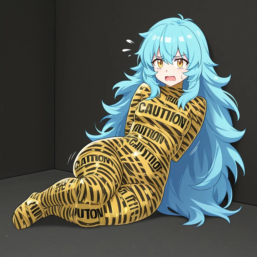 ctapemummy, bondage, tape mummification, caution tape, english text, "CAUTION",