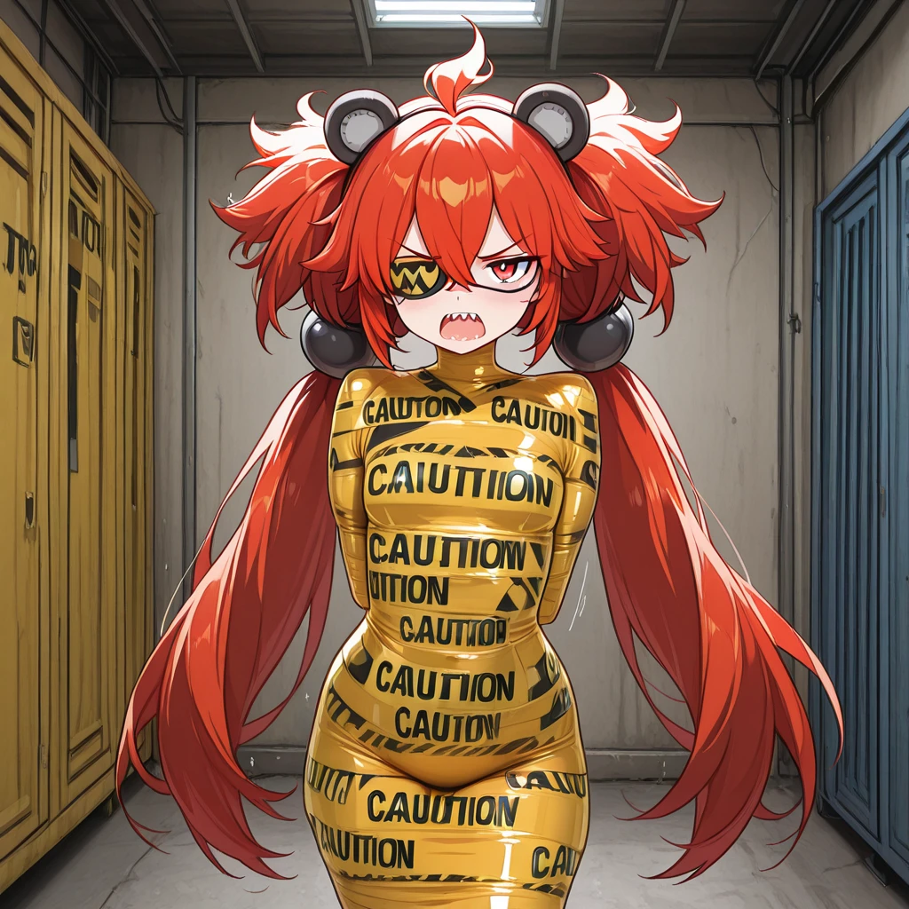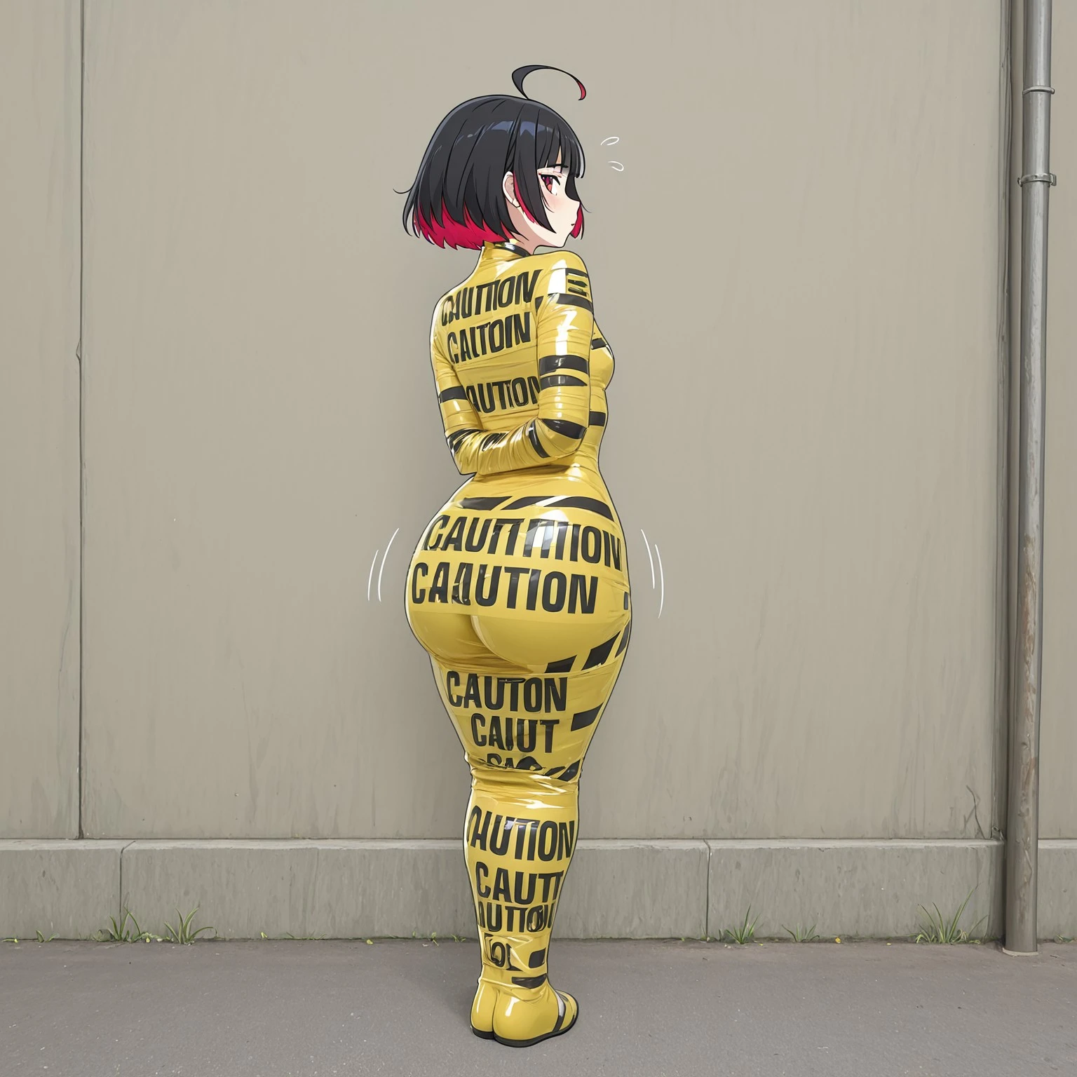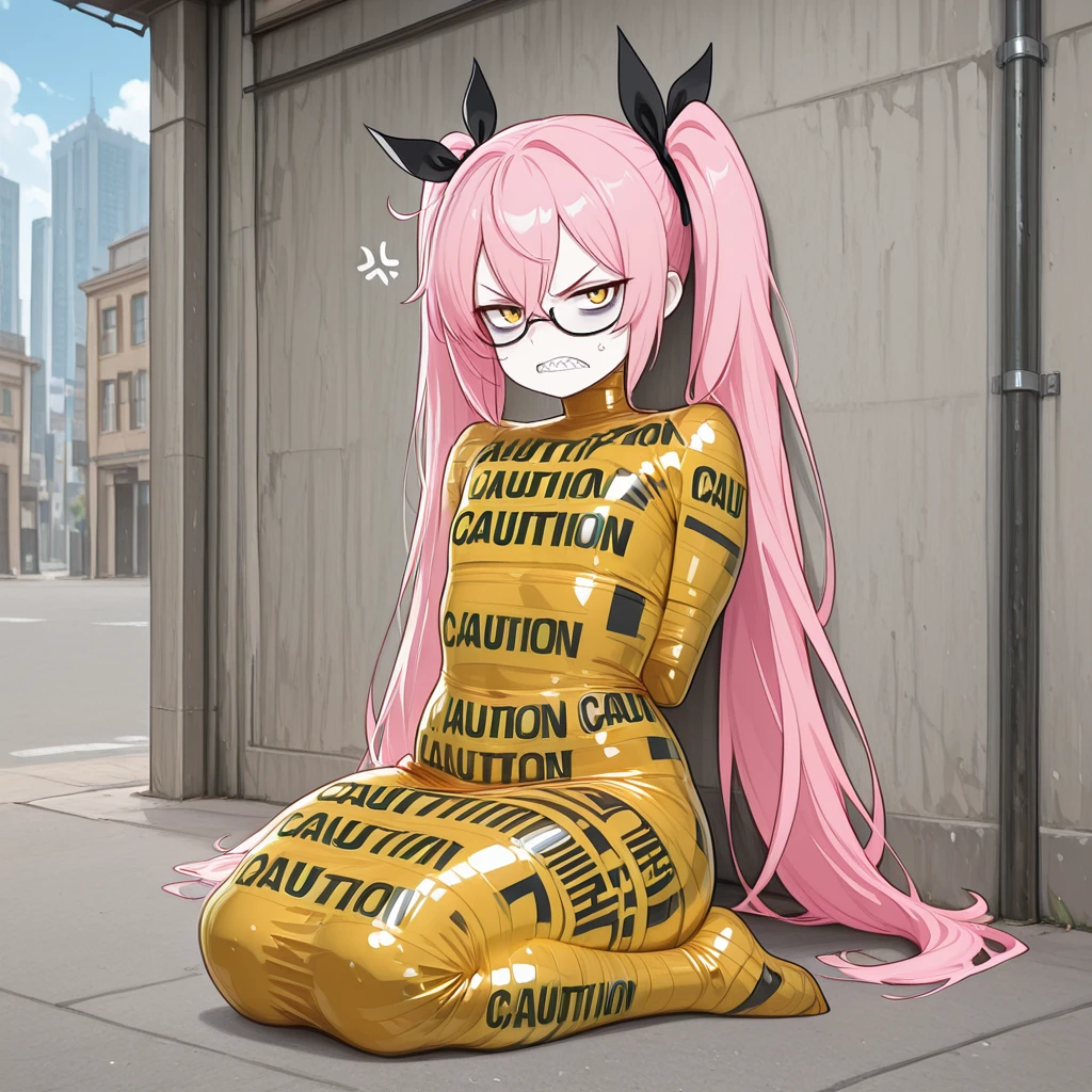 ctapemummy, bondage, tape mummification, caution tape, english text, "CAUTION",