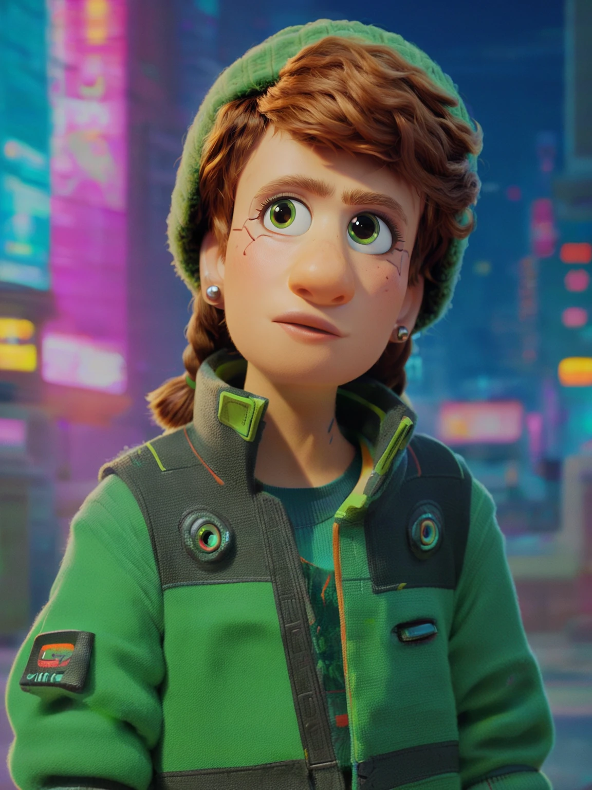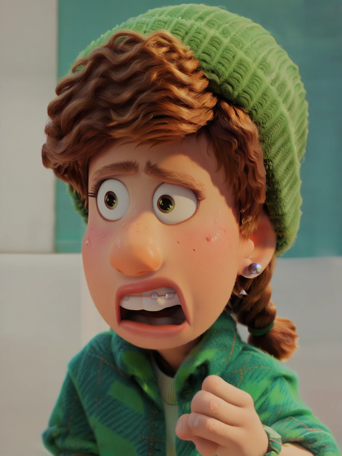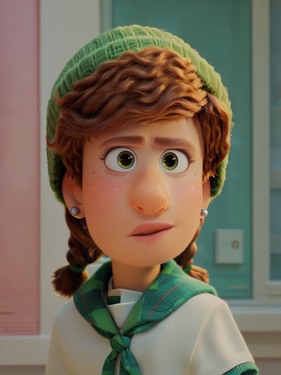 Recommend prompt: "m_m, 1girl, green eyes, ginger hair, braids hair, fur hat, earrings"
