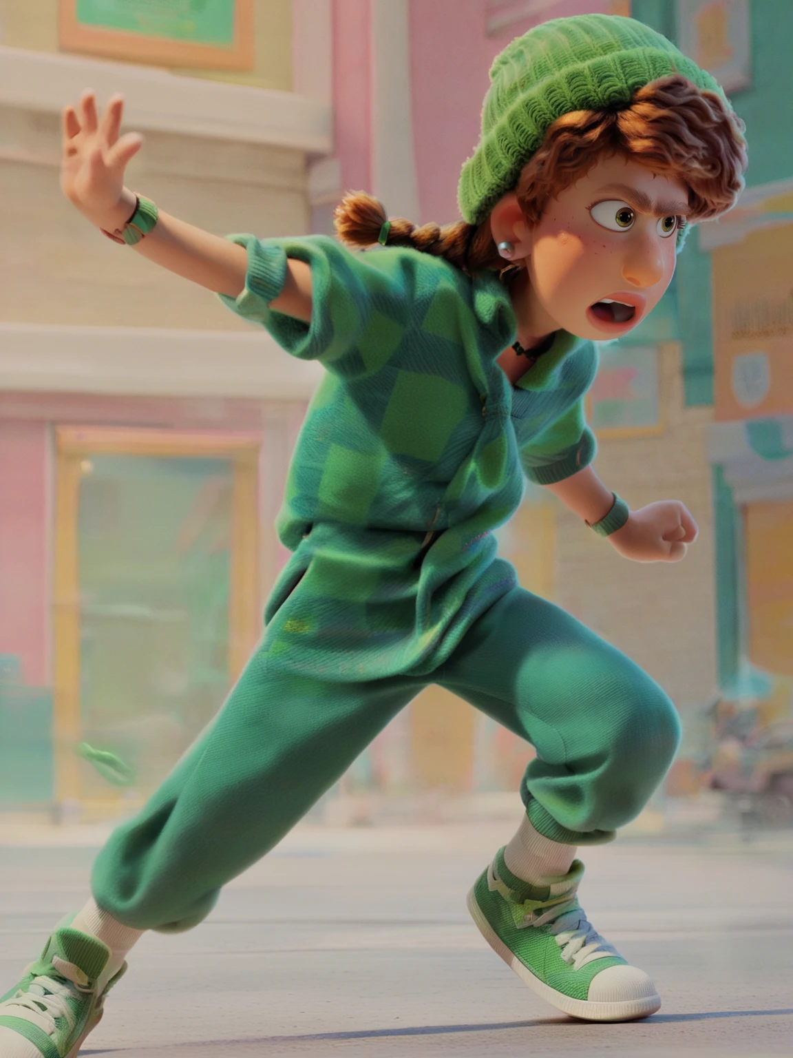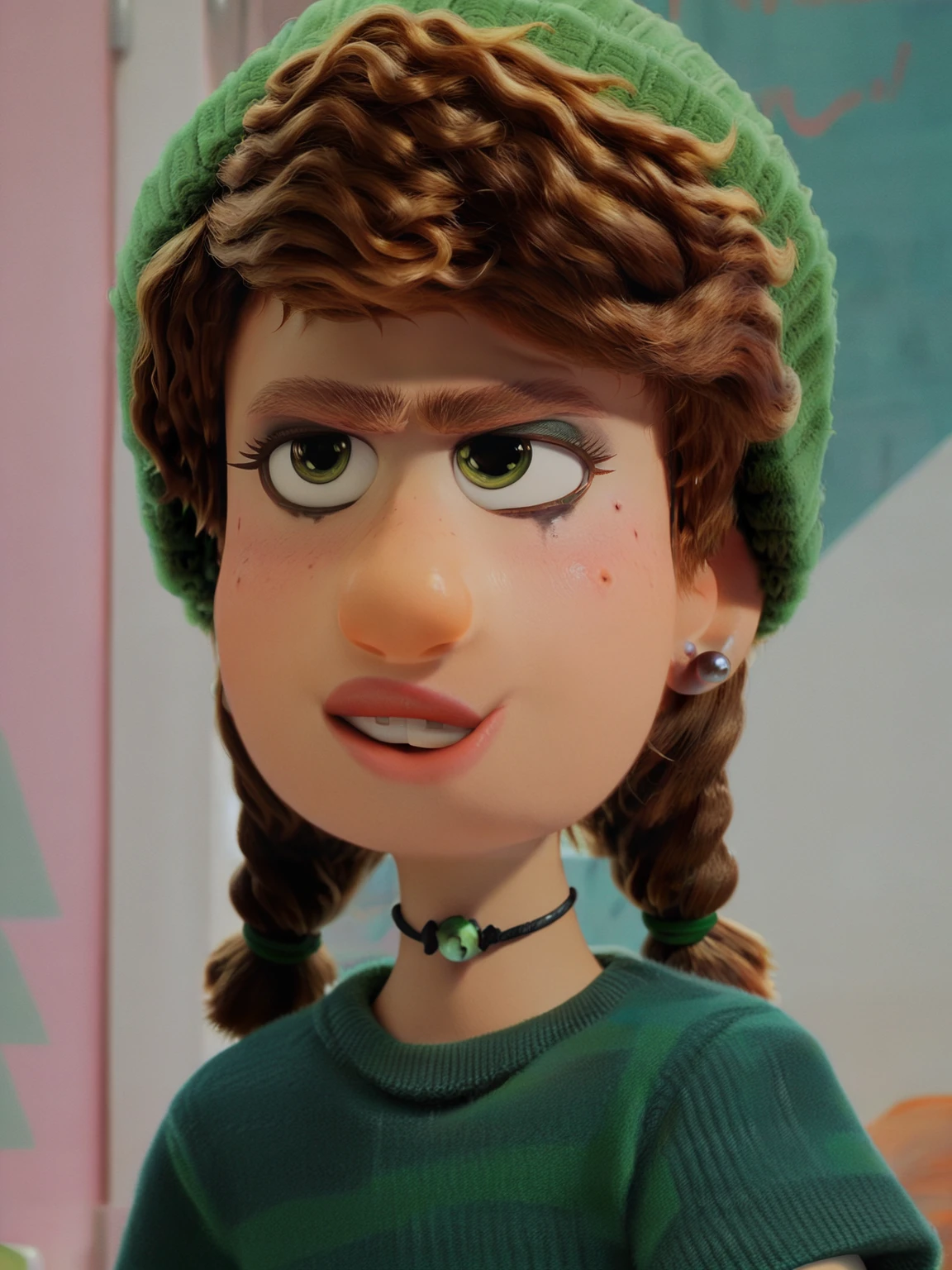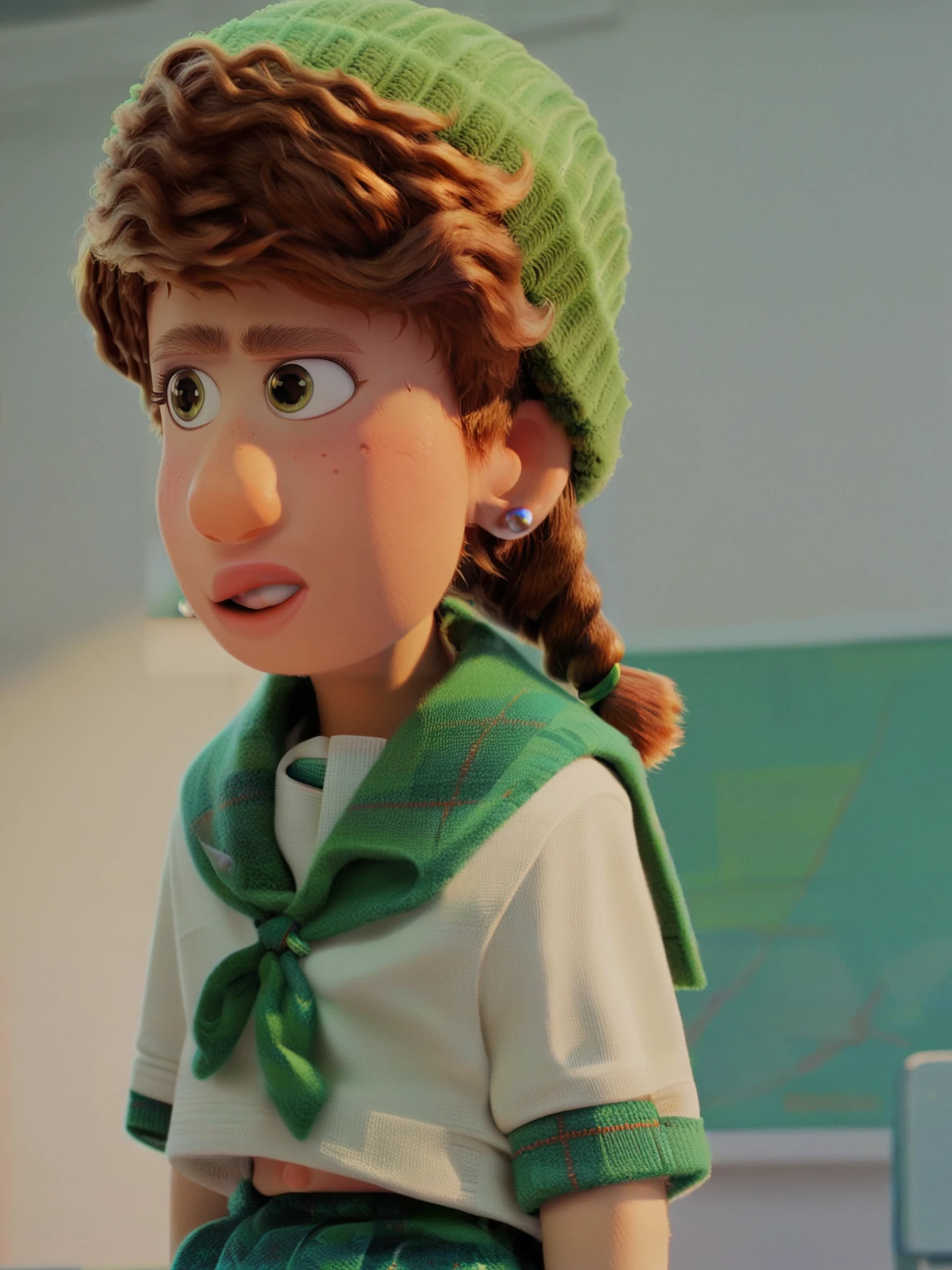 Recommend prompt: "m_m, 1girl, green eyes, ginger hair, braids hair, fur hat, earrings"