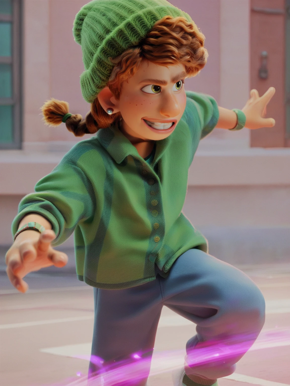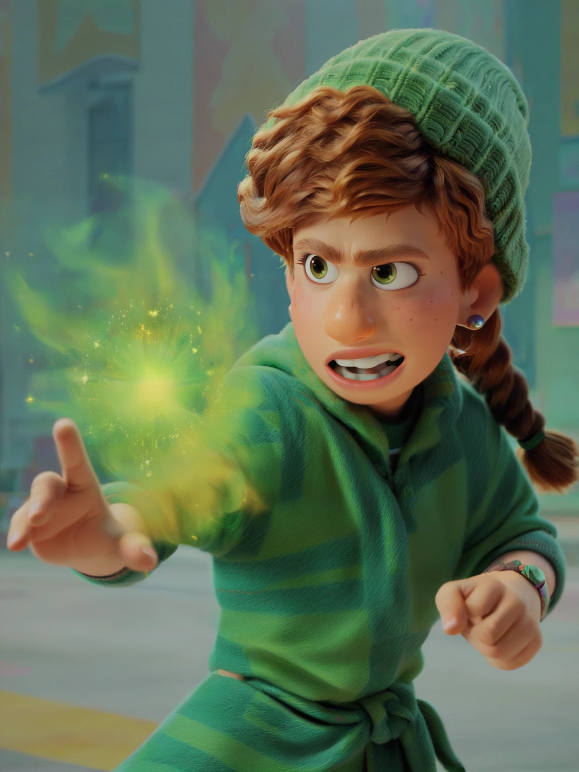 m_m, 1girl, green eyes, ginger hair, braids hair, earrings