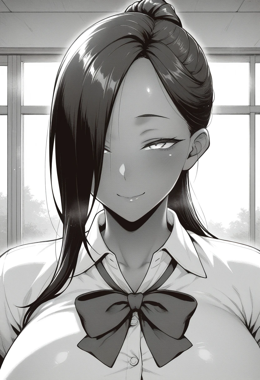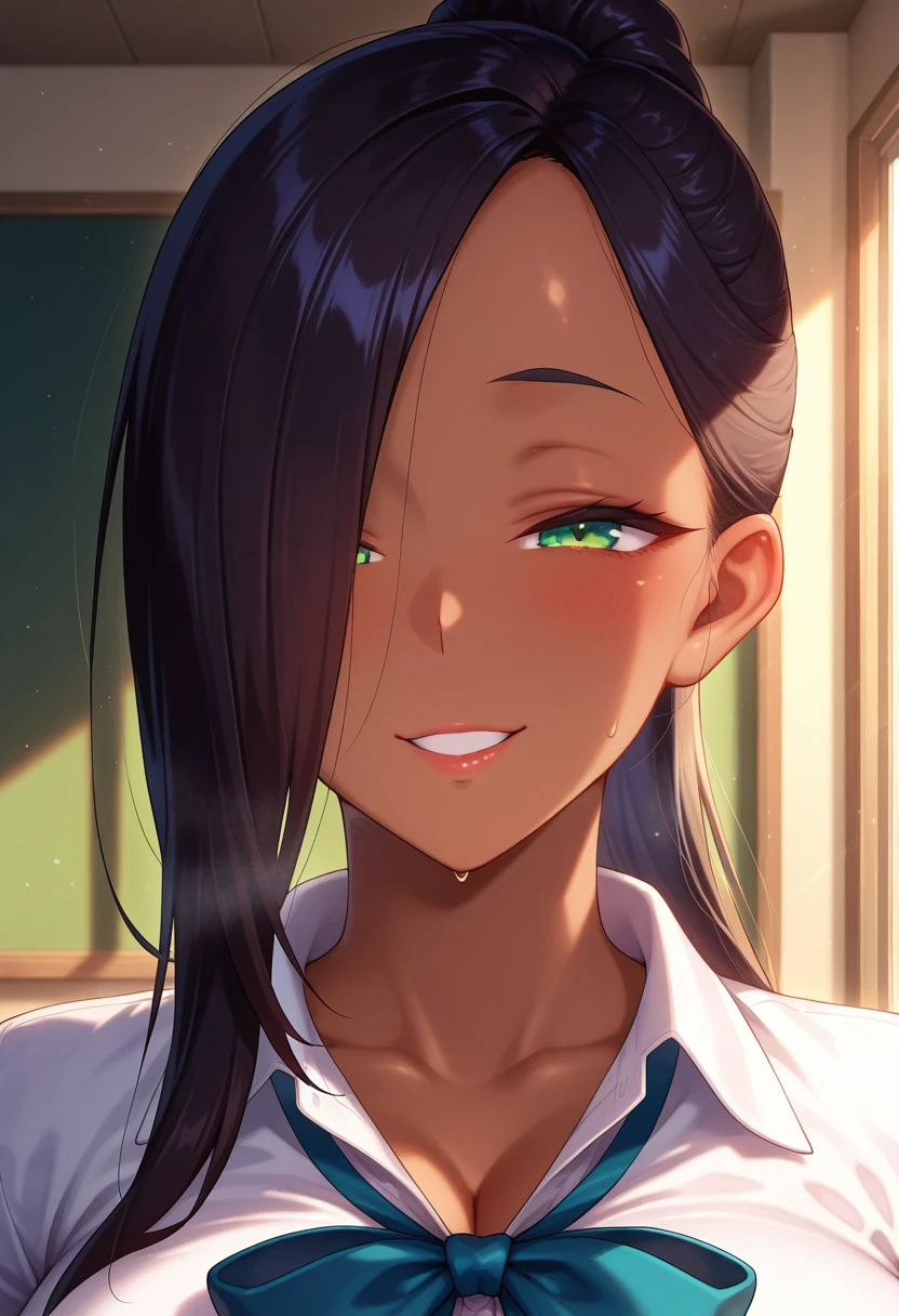leilaww, tall female, dark-skinned female, curvy, green eyes, black hair, long hair, hair over one eye, ponytail, huge breasts,