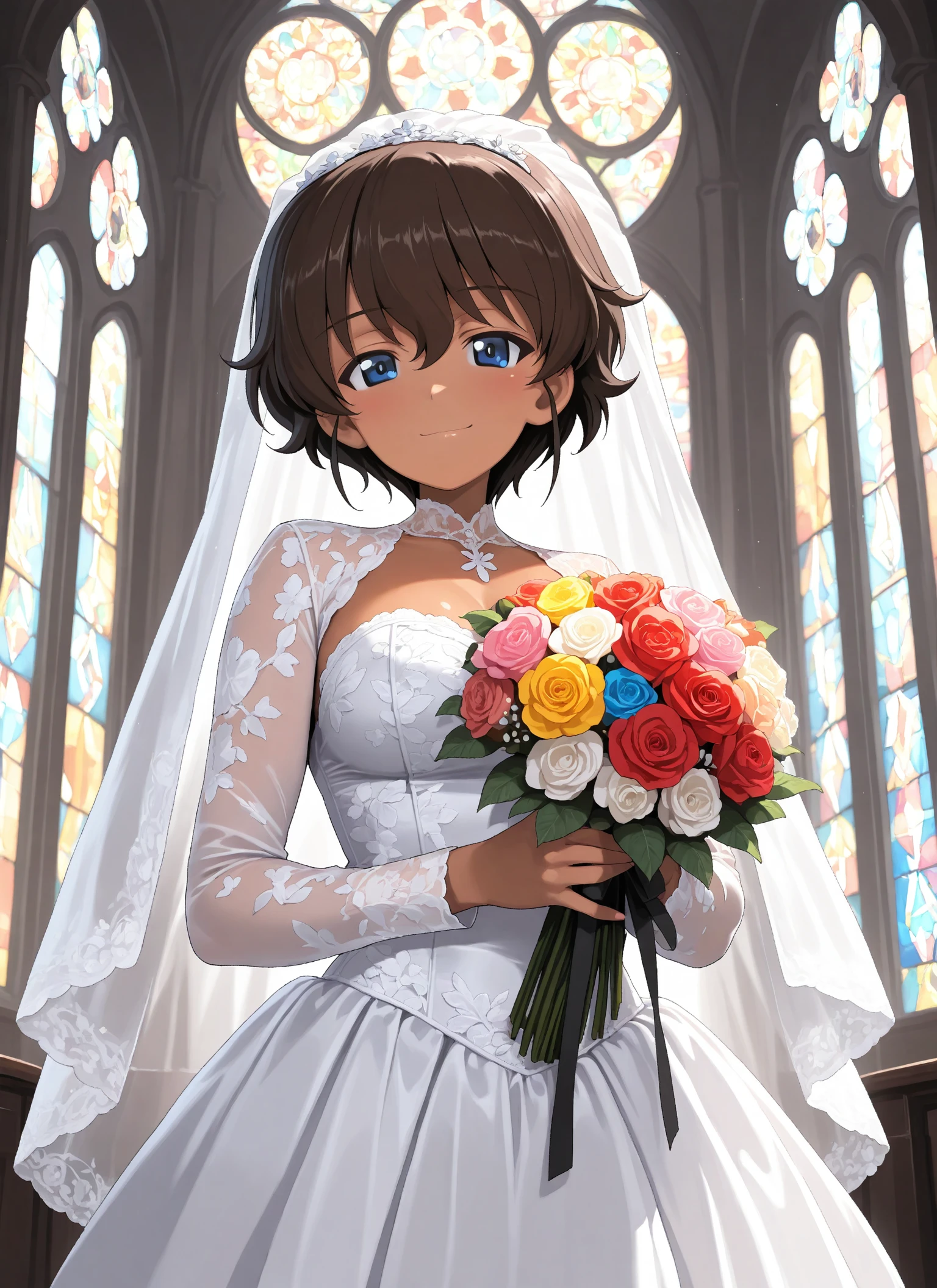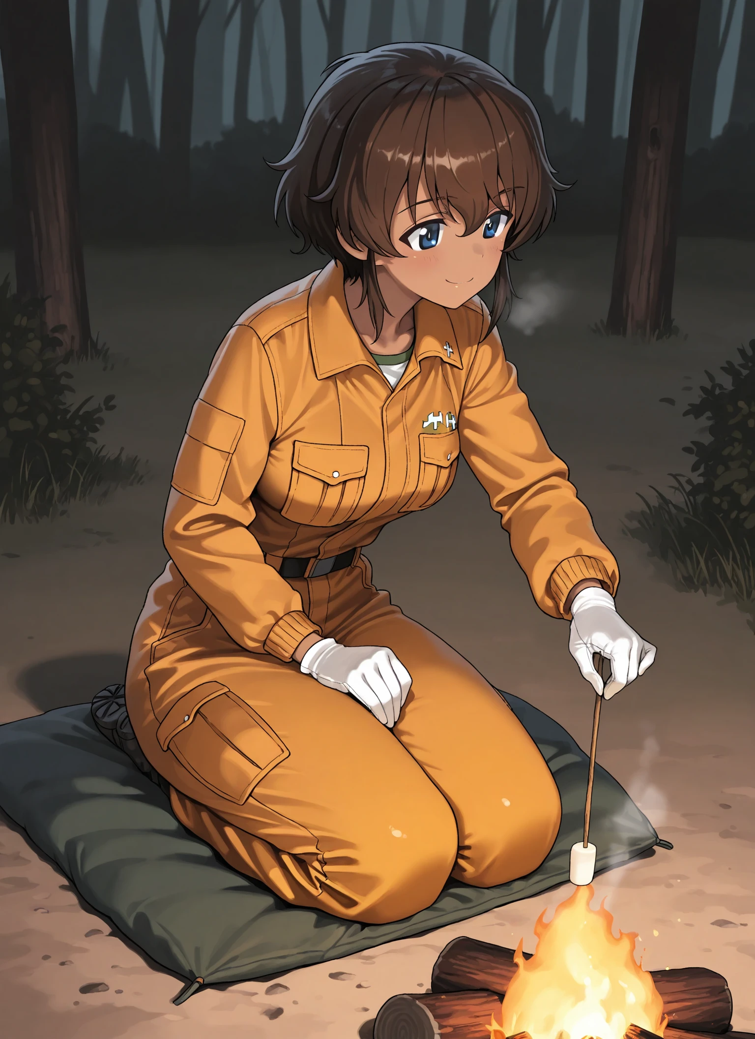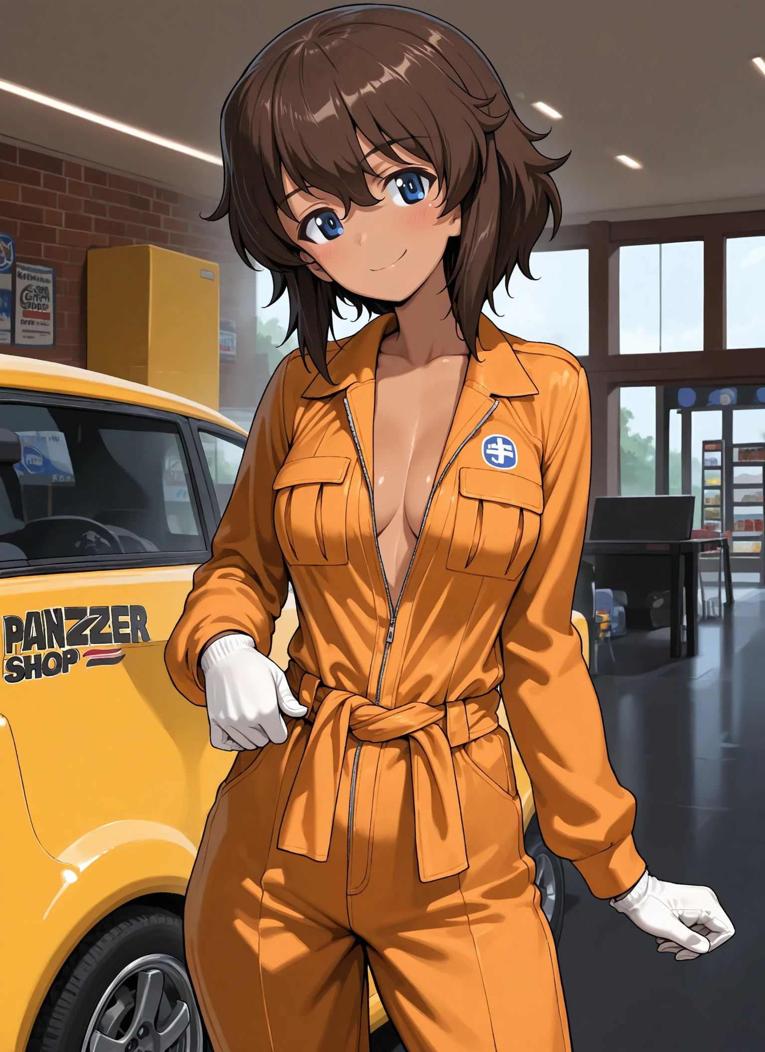 1girl, solo, Maria Suzuki (Girls Und Panzer), tomboy, blue eyes, brown hair, dark skin, dark-skinned female, bangs,
